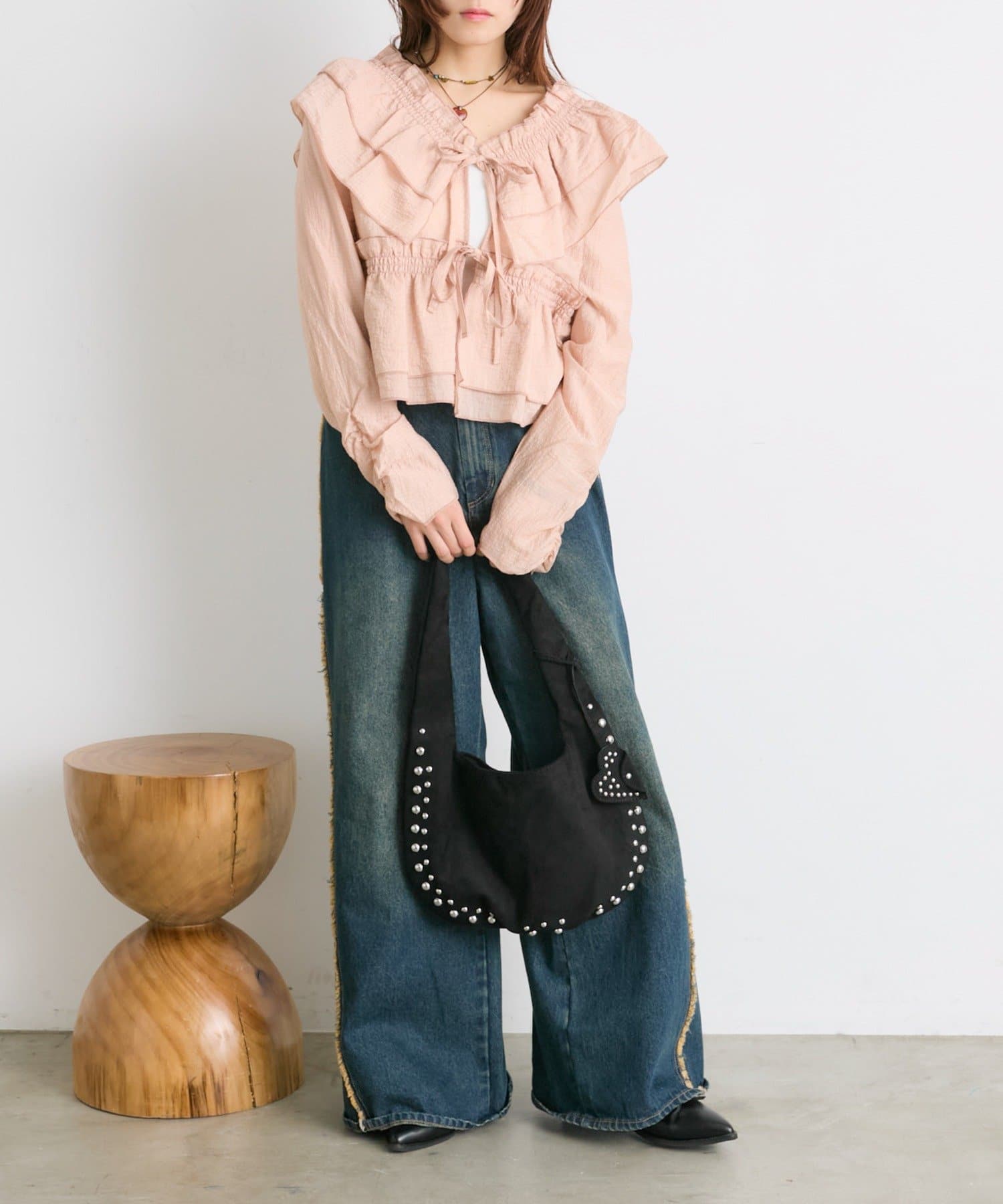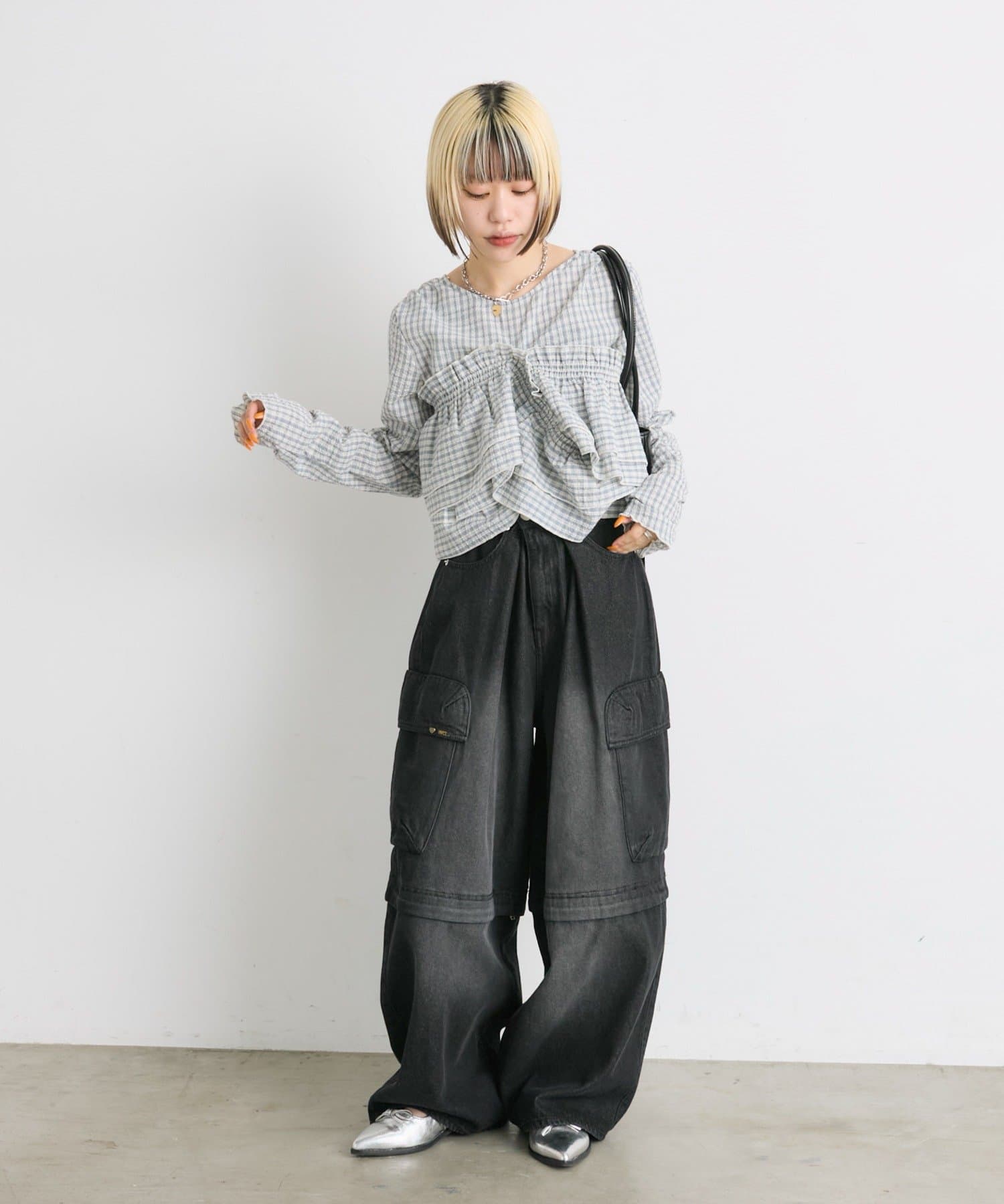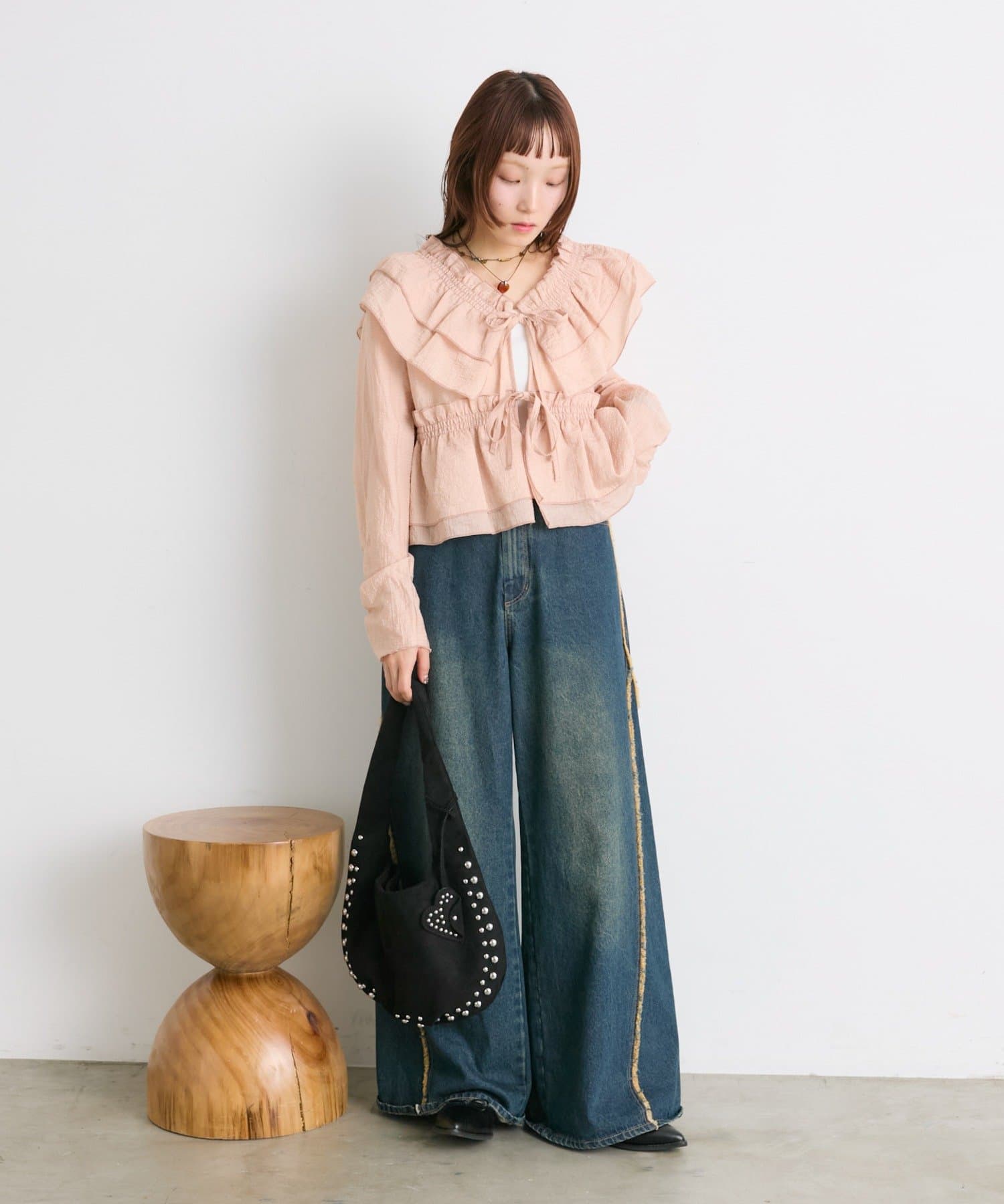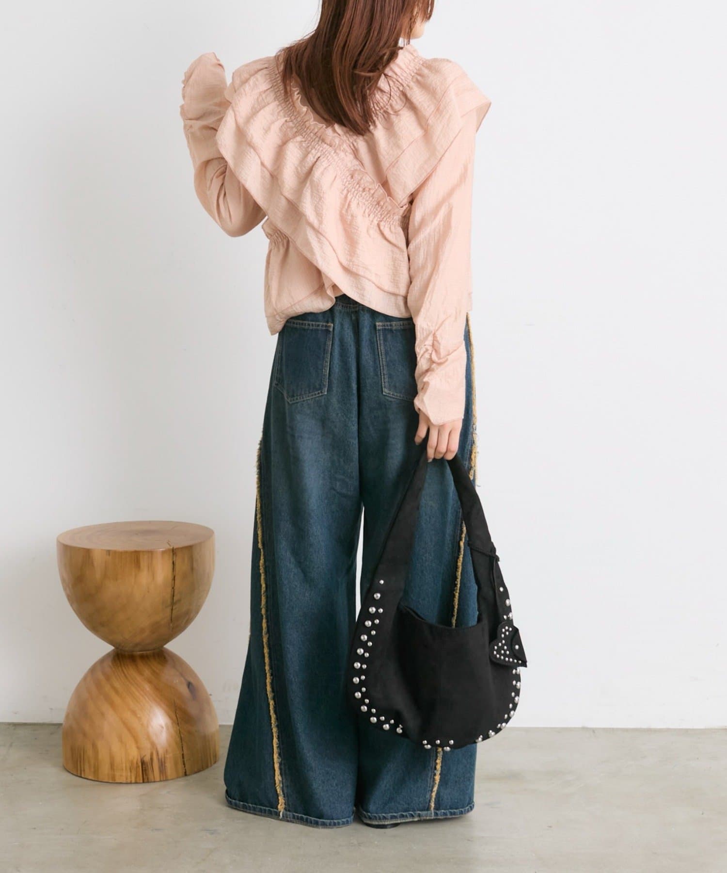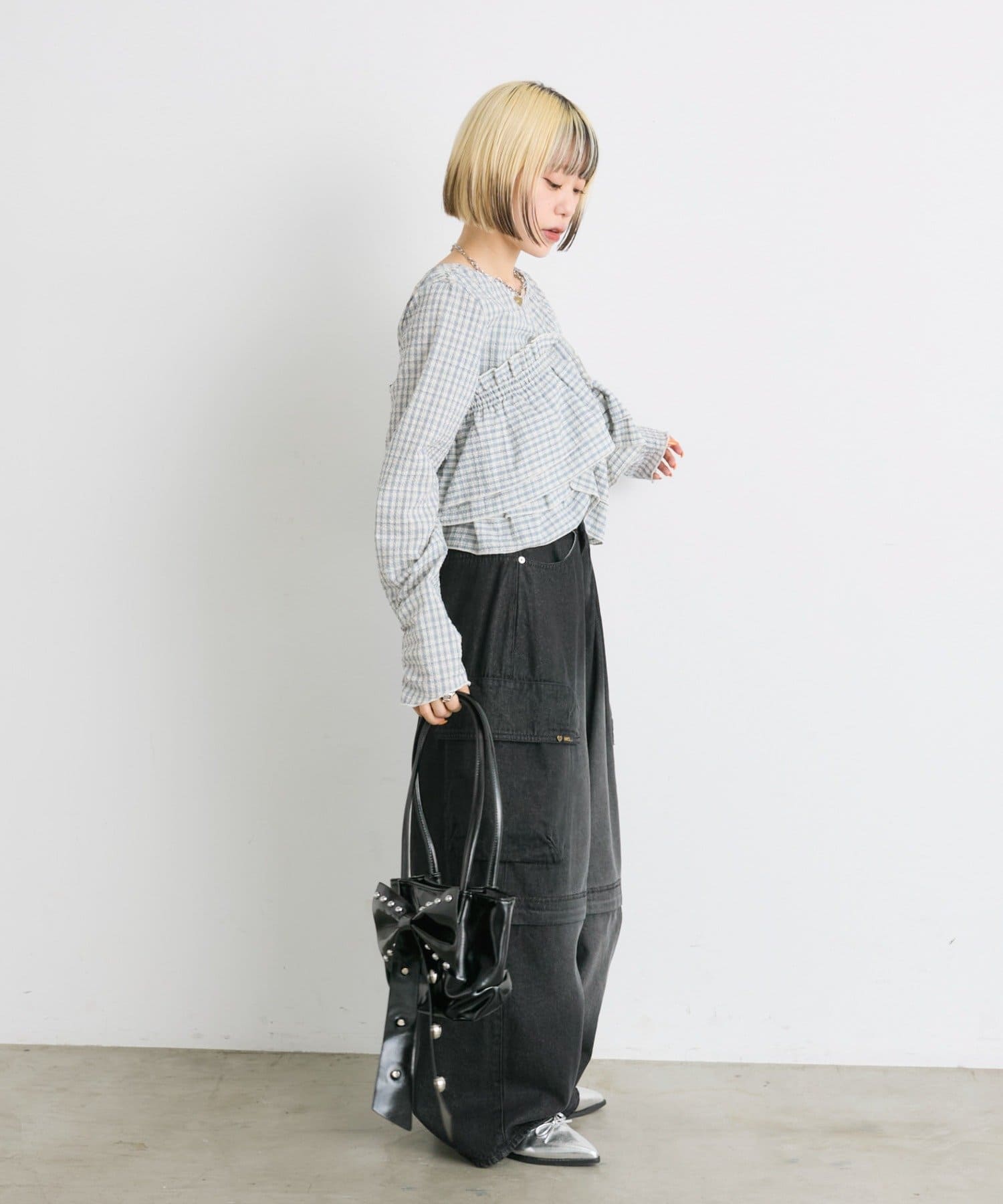 ・片方のフリルを腕の下に下したワンショル風の着こなしが垢抜けコーデに♪