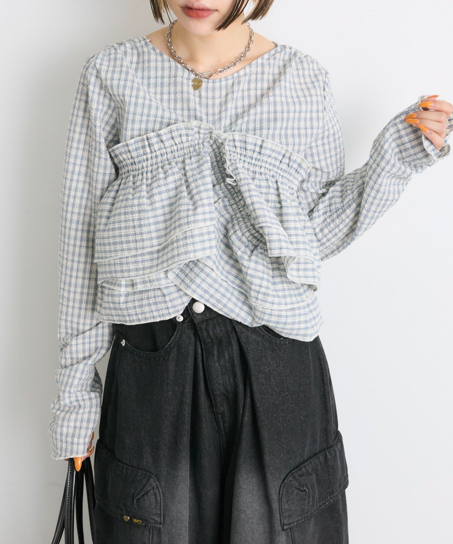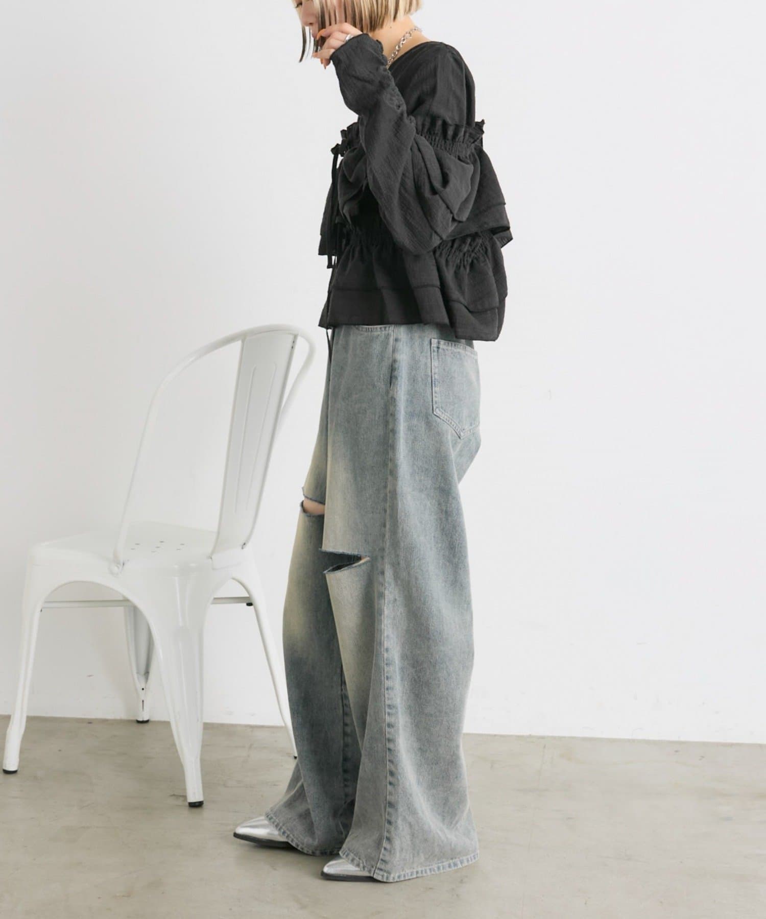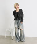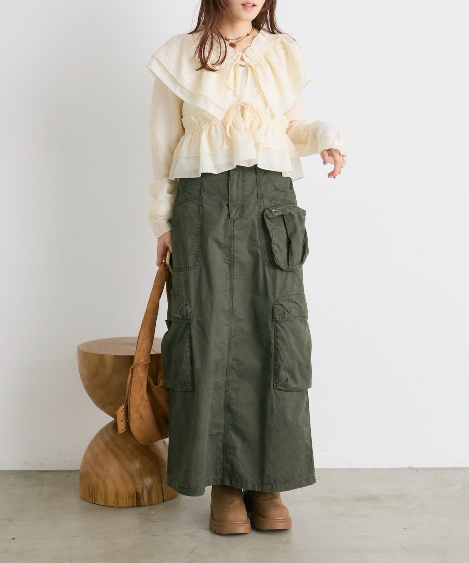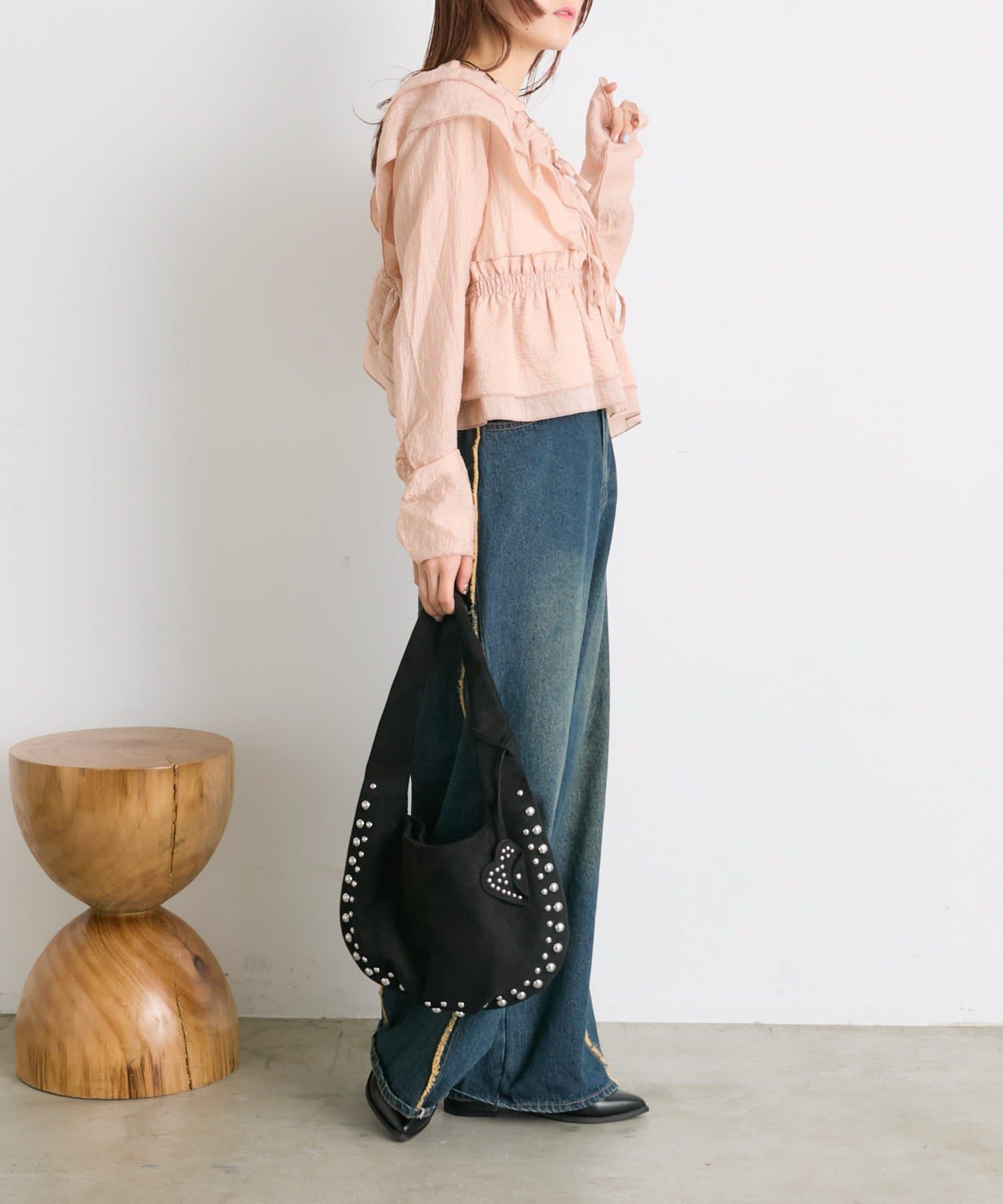 ・片方のフリルを腕の下に下したワンショル風の着こなしが垢抜けコーデに♪