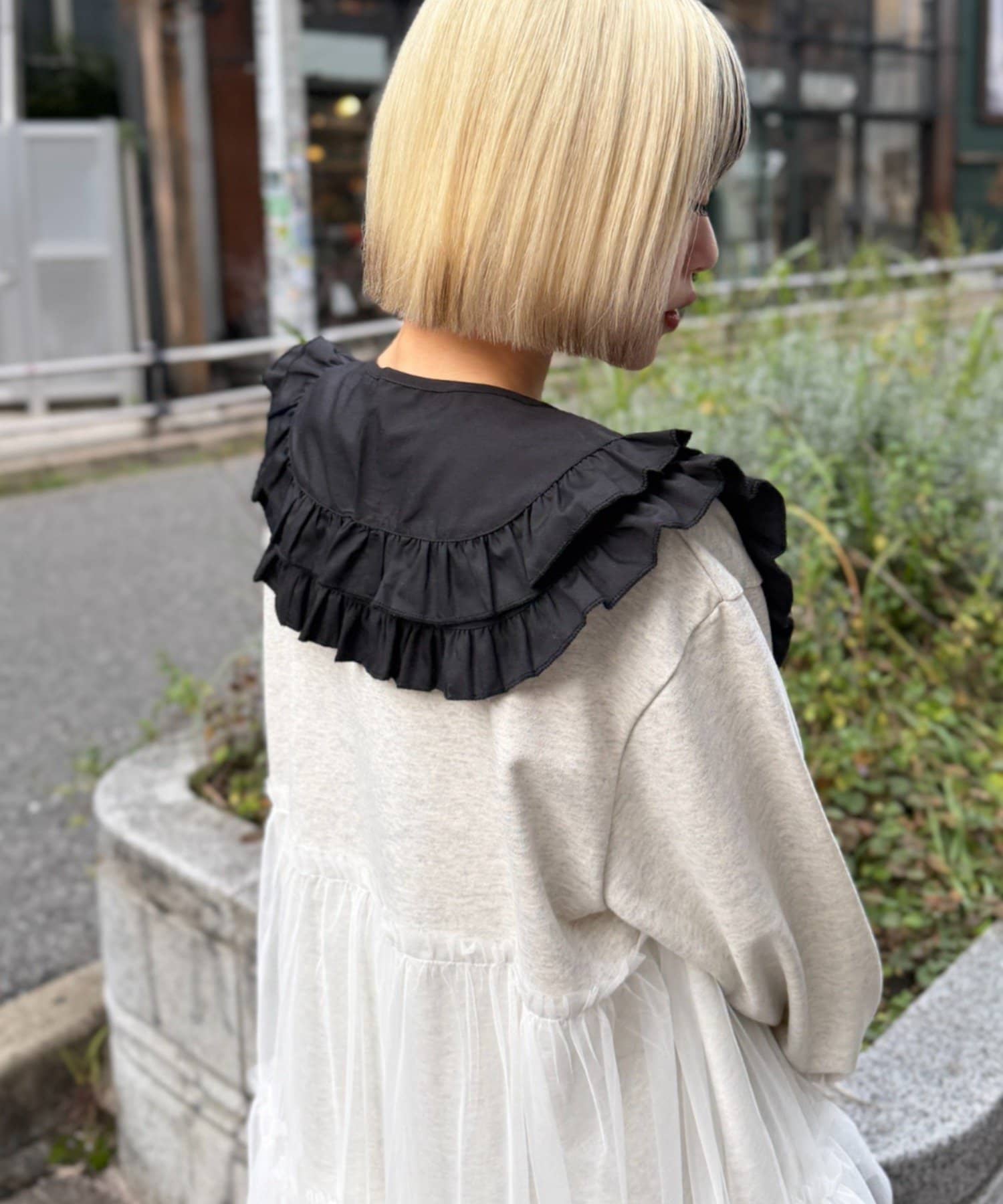 ・スポーティなスウェットに甘いつけ襟をプラスして、ストリート×ガーリーのミックススタイルに