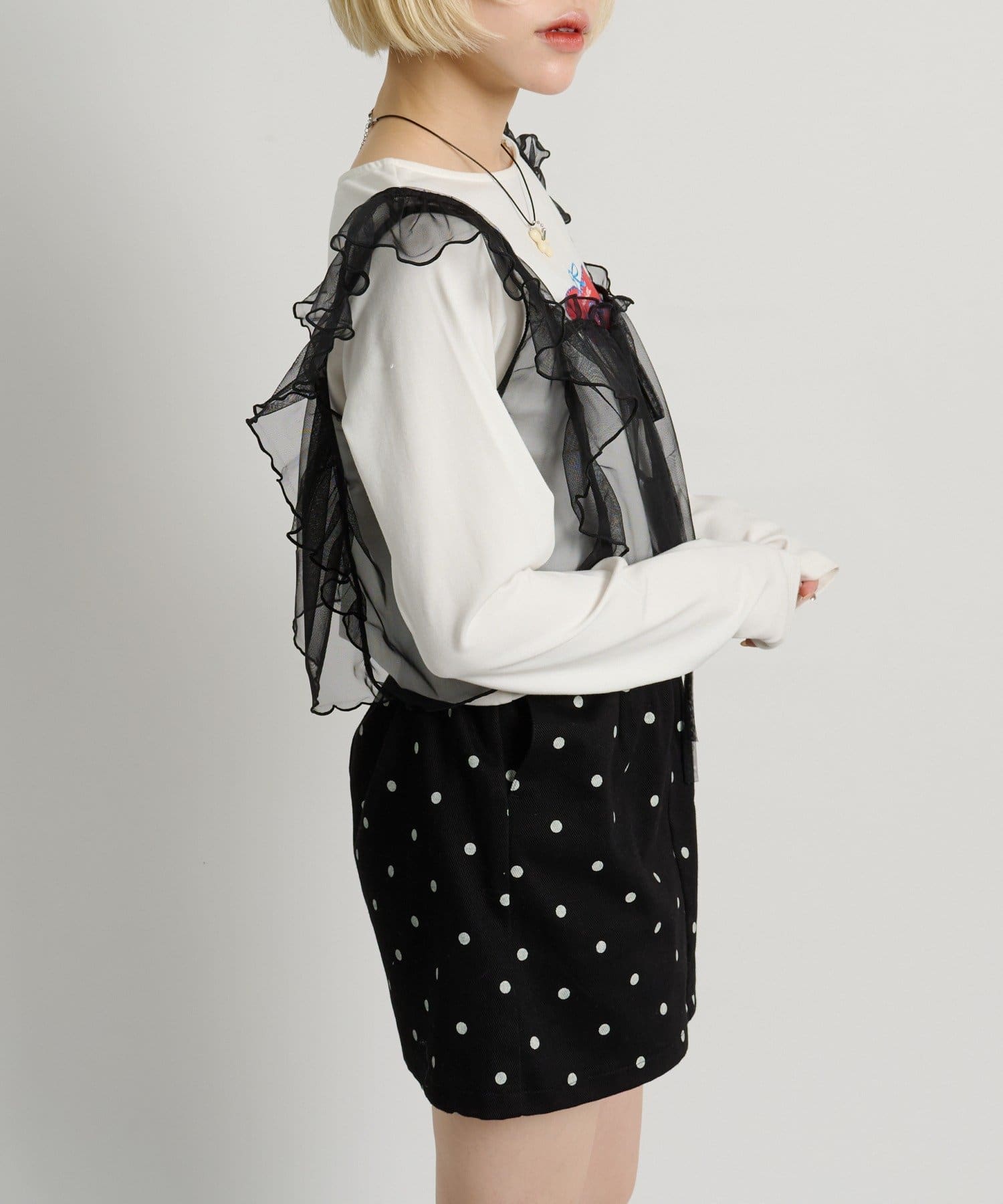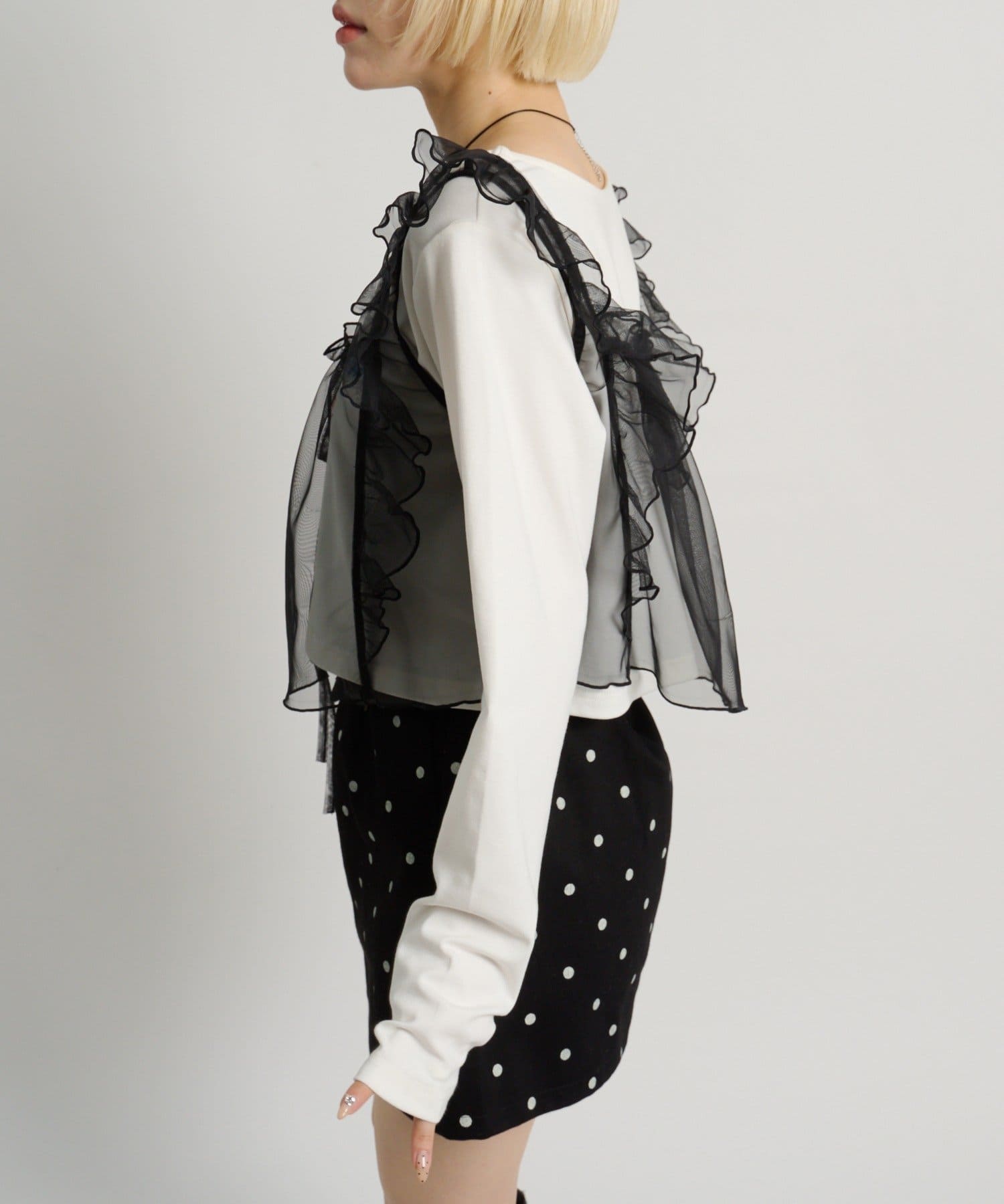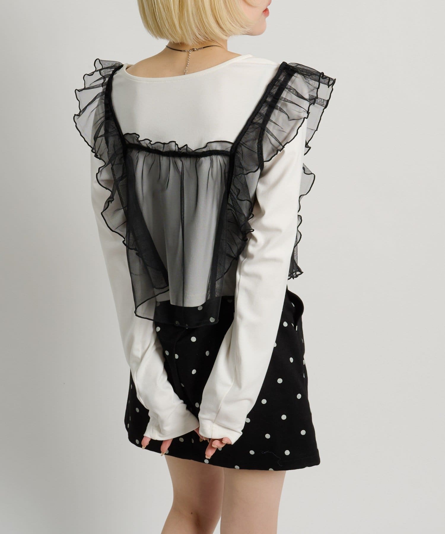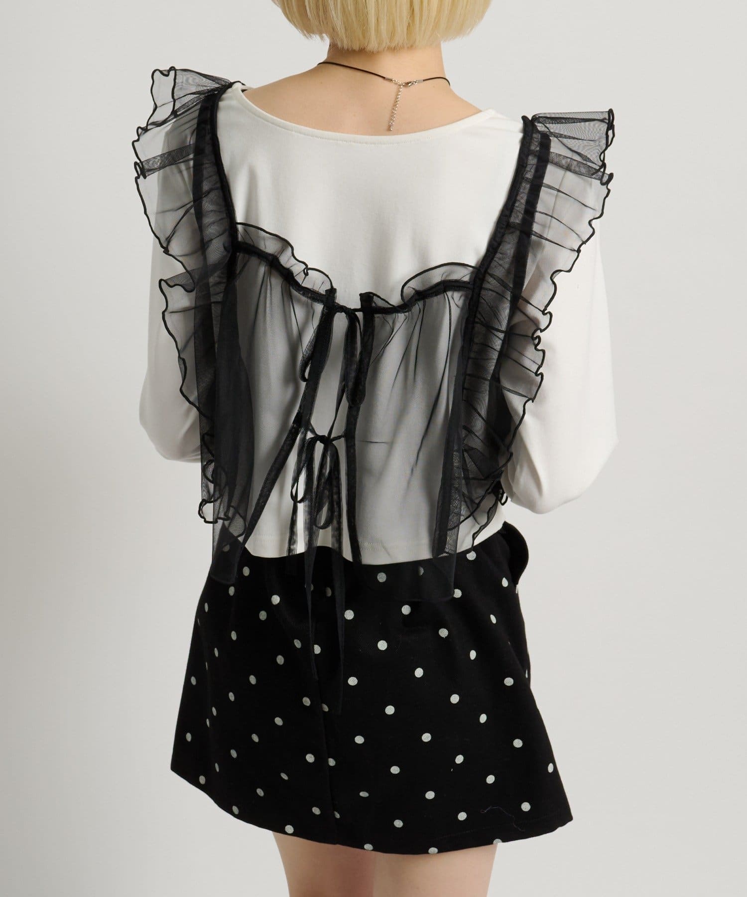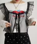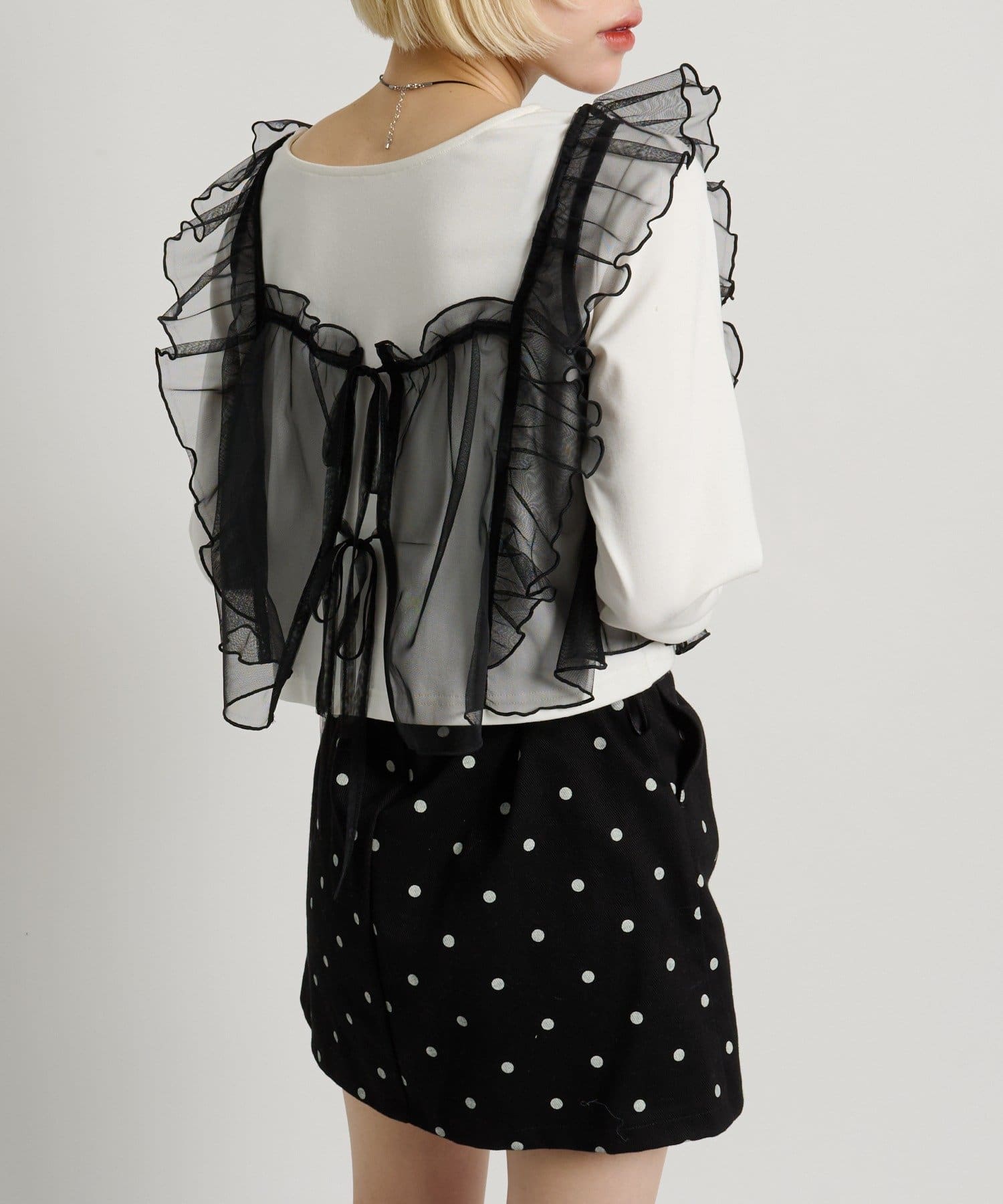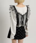 ・透け感のあるシアー素材を使用したフリルビスチェ、前後両前で着用可能◎