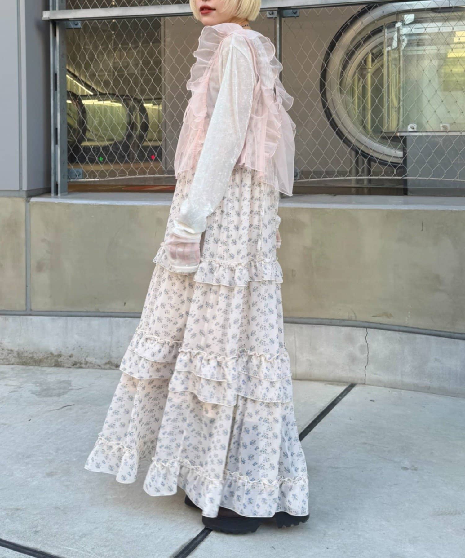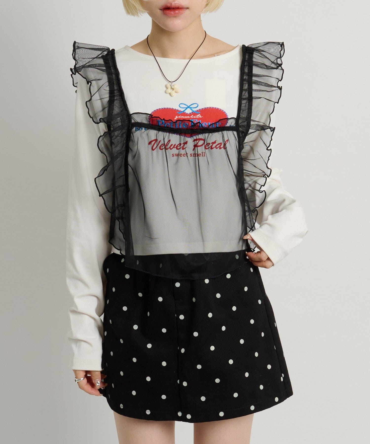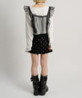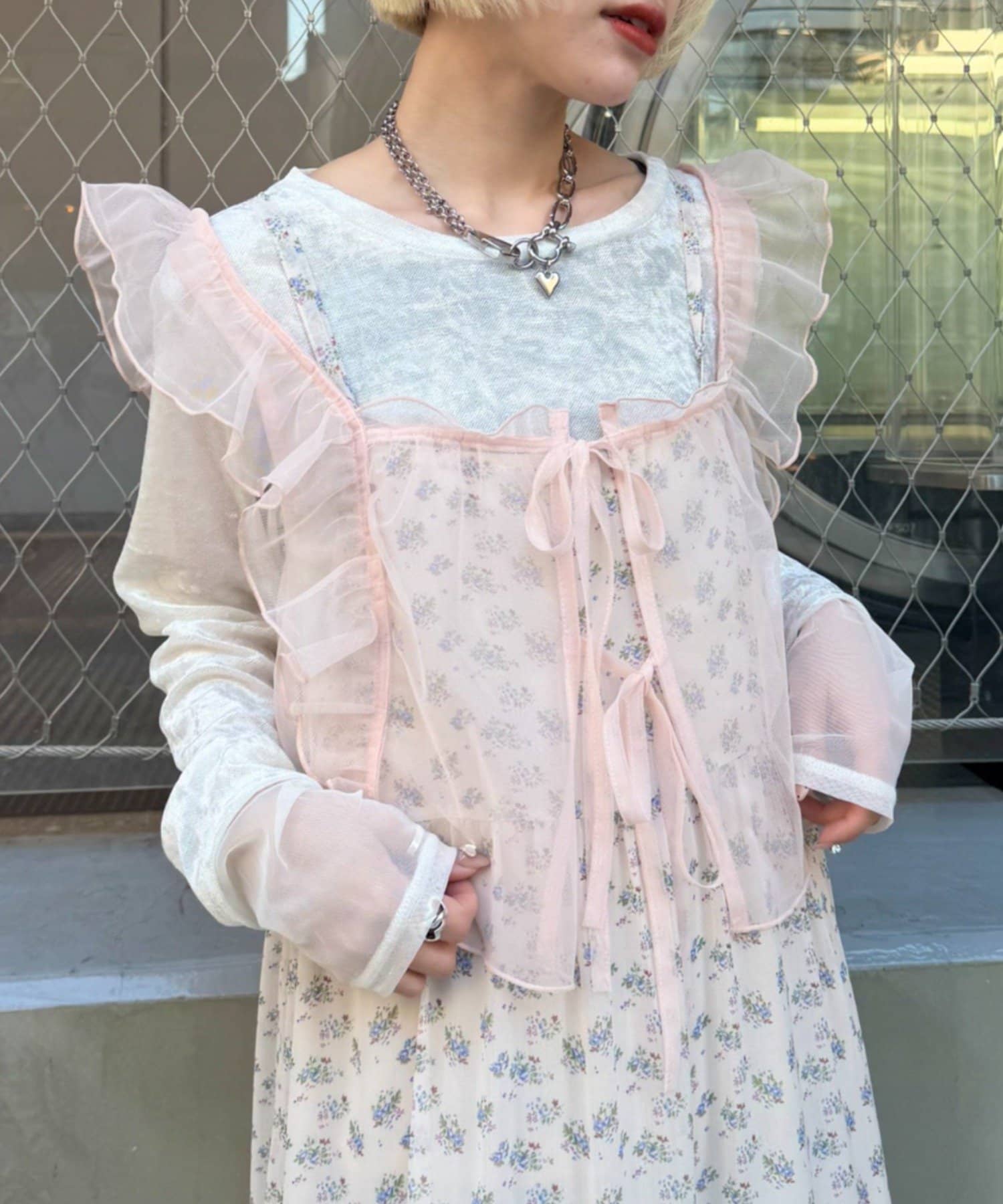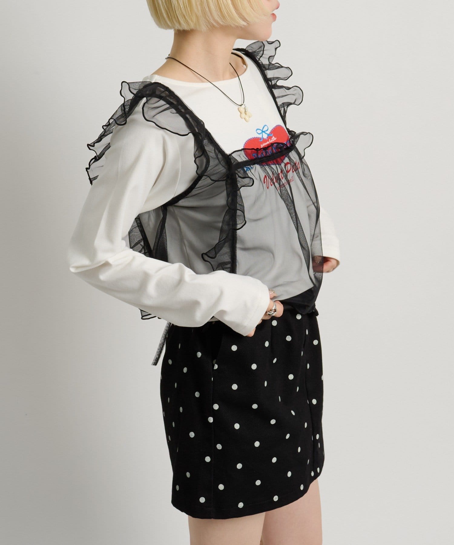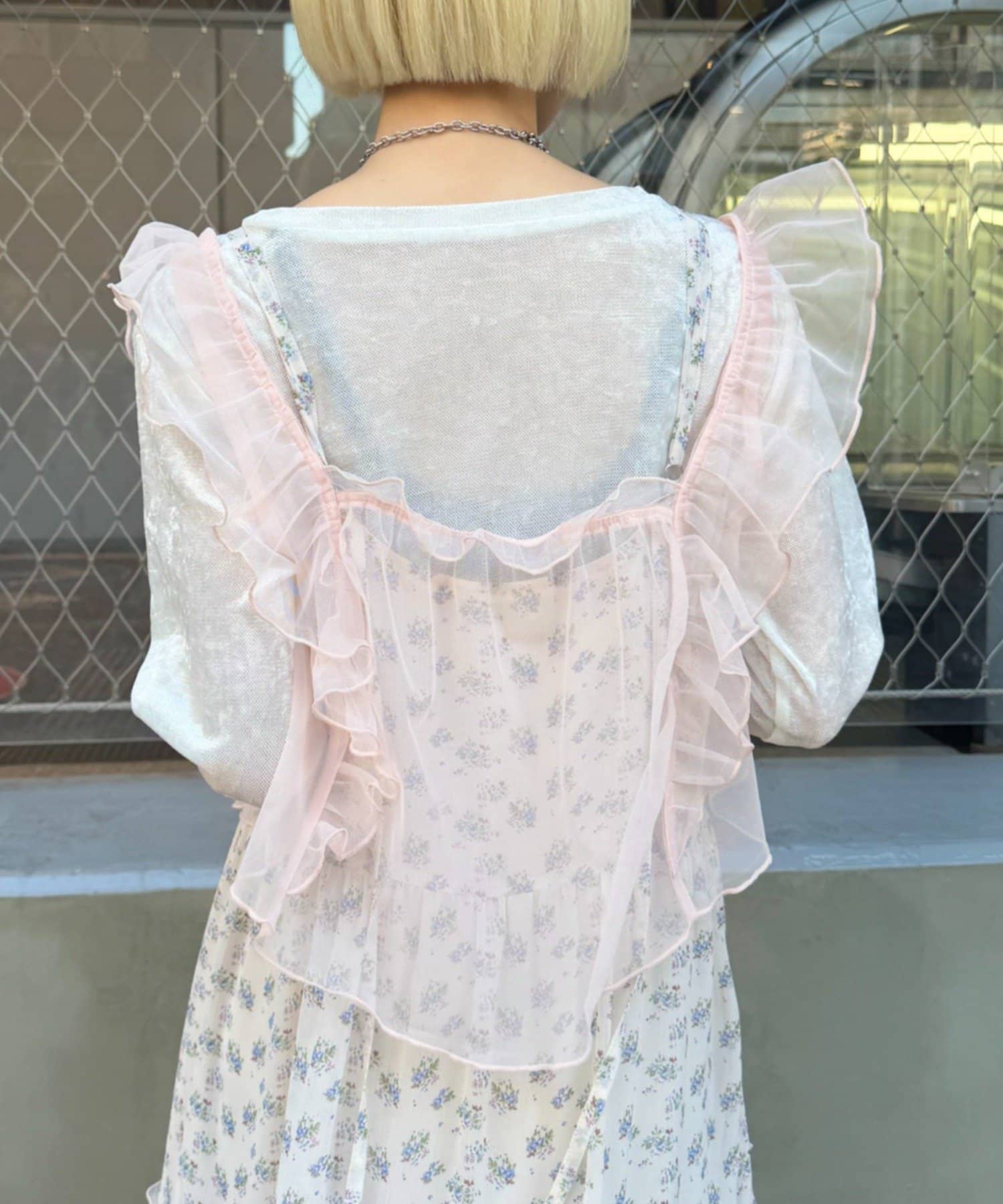 ・透け感のあるシアー素材を使用したフリルビスチェ、前後両前で着用可能◎