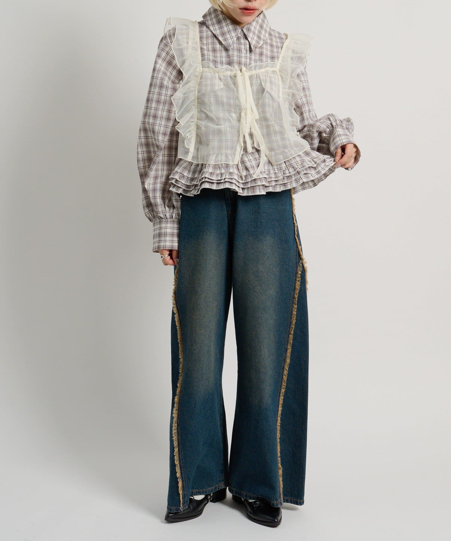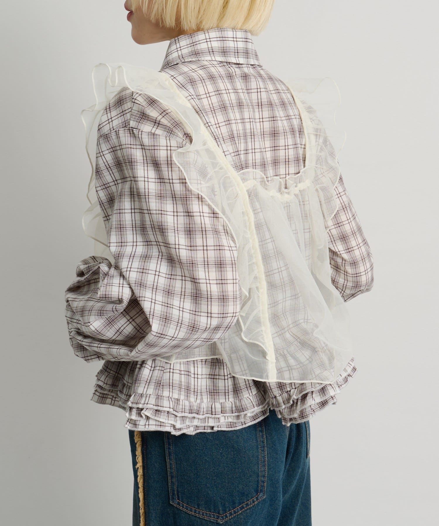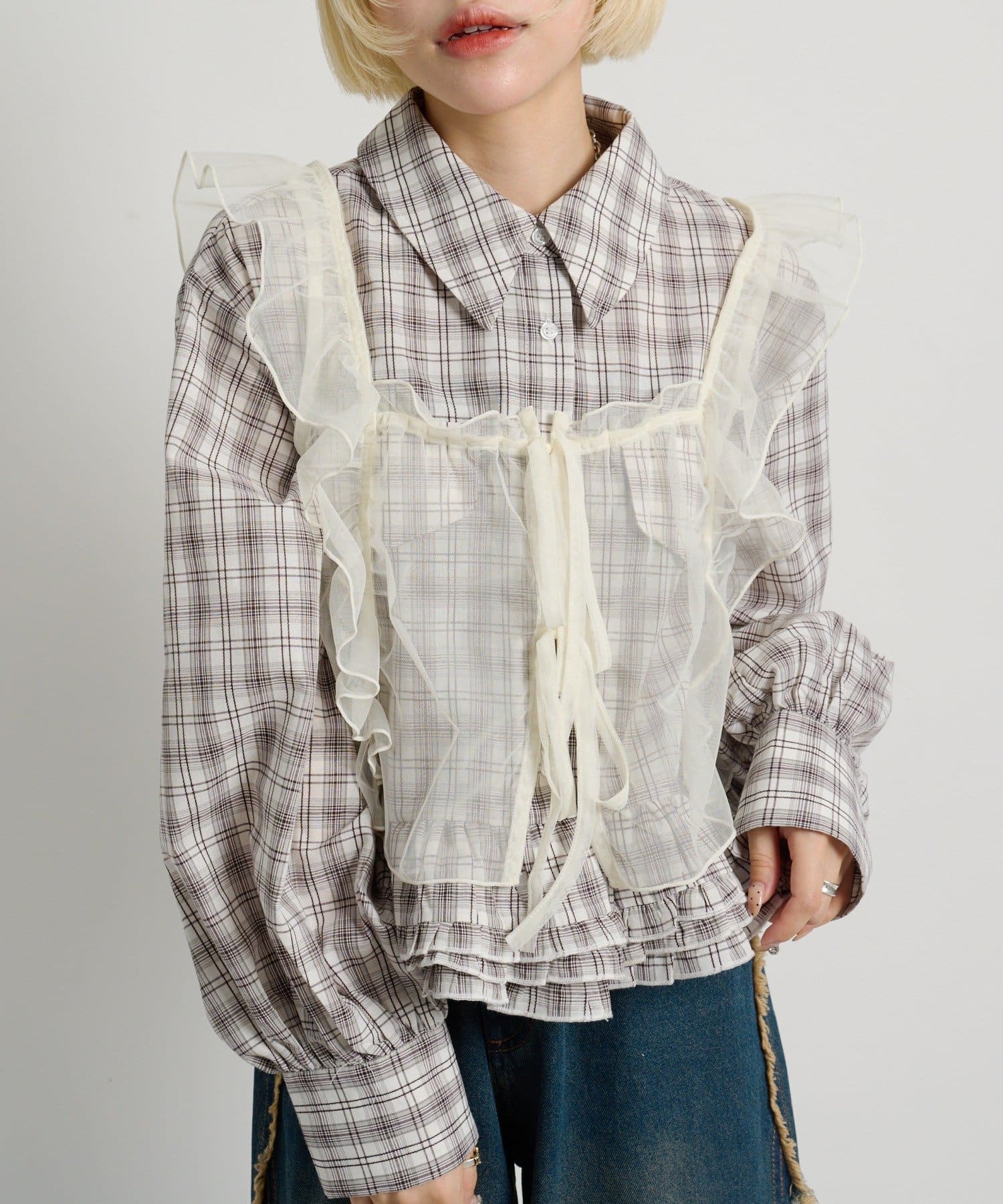 ・チェックシャツやブラウスにレイヤードして甘辛ミックスコーデに
