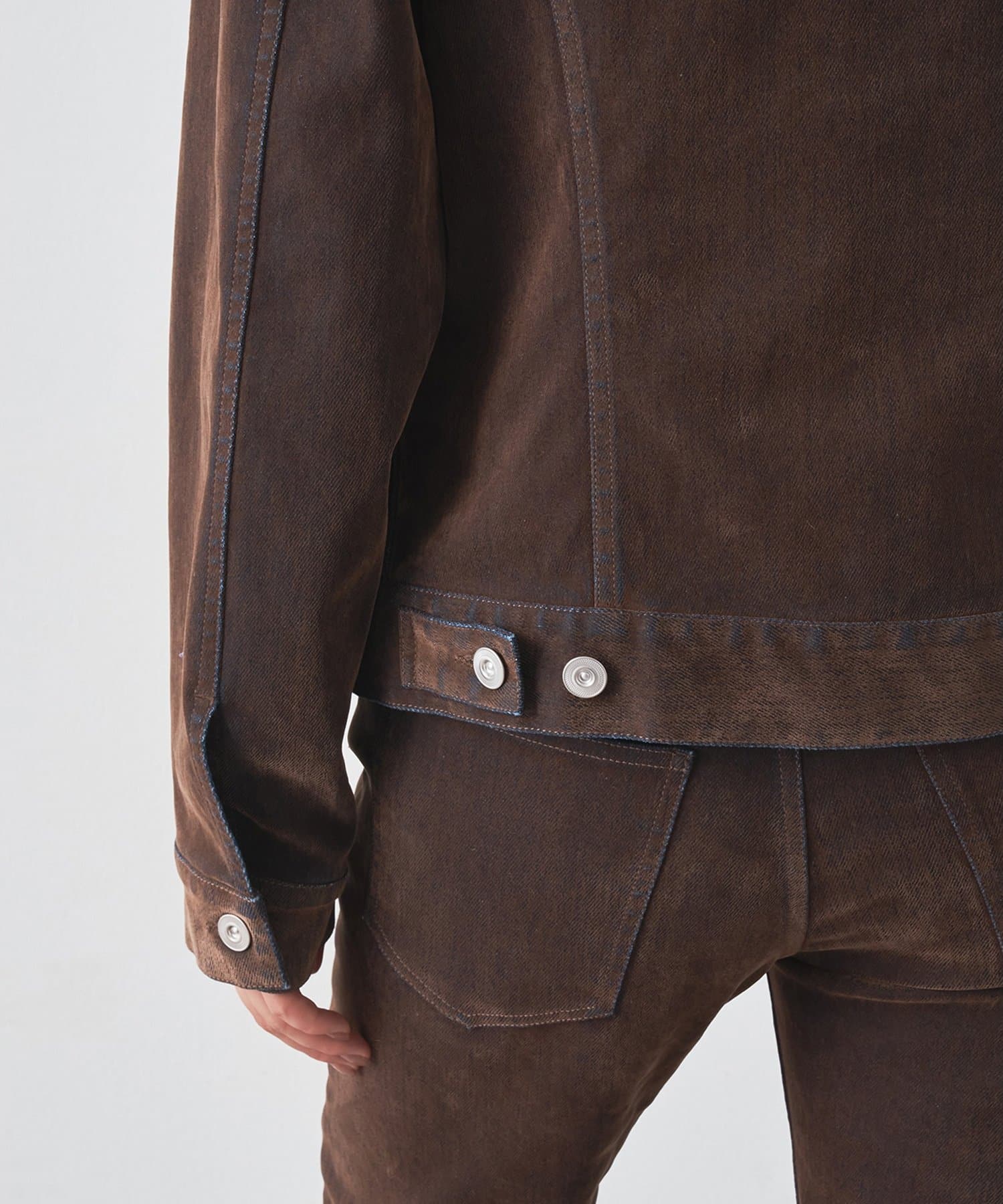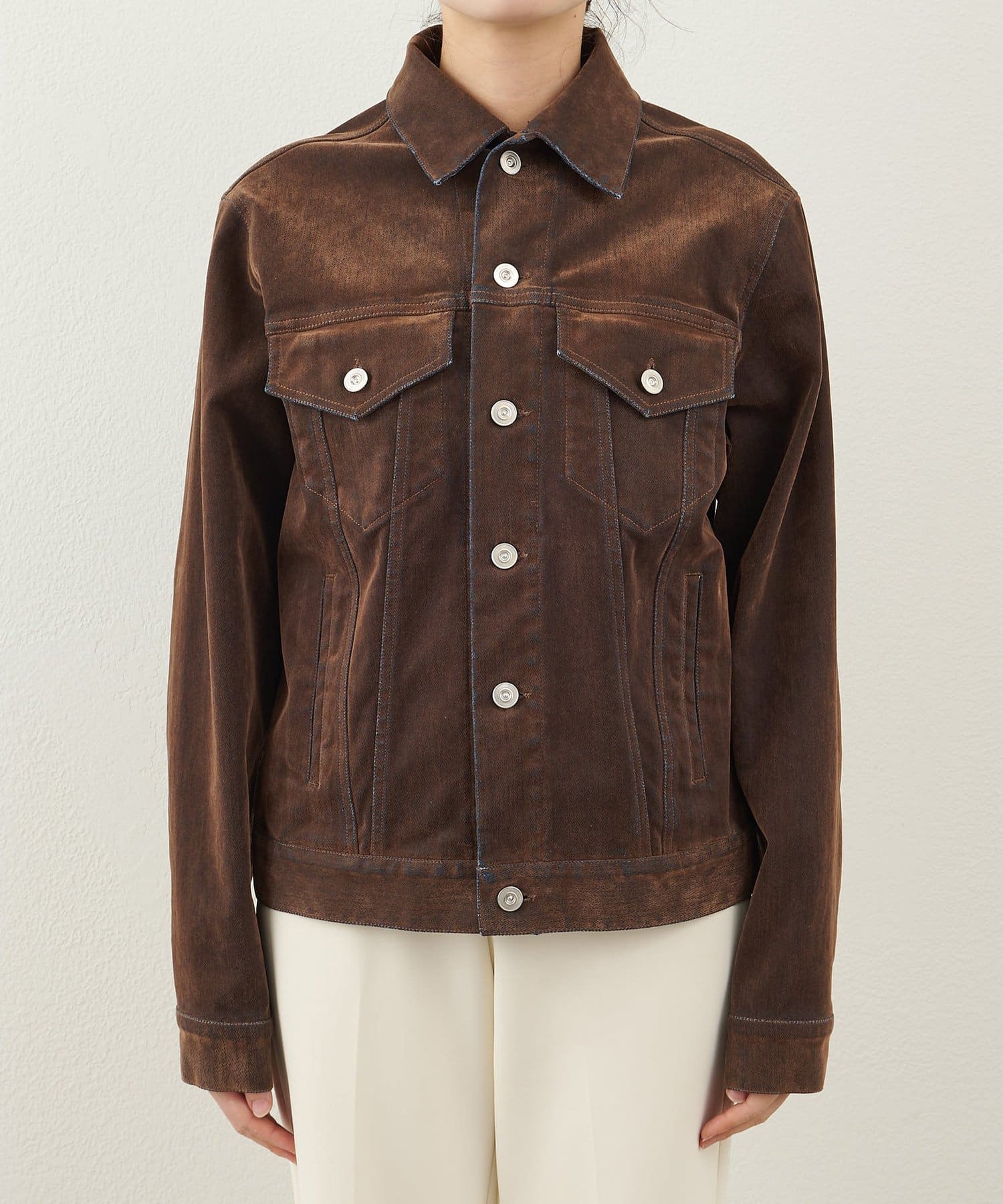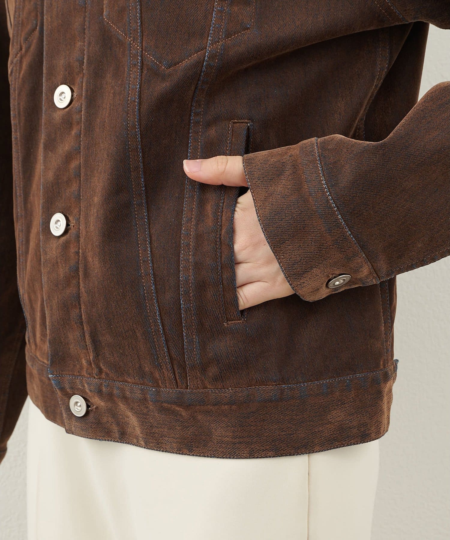 ■厚手の12オンスデニムに全面フロッキープリントを大胆に施したデニムジャケット。