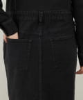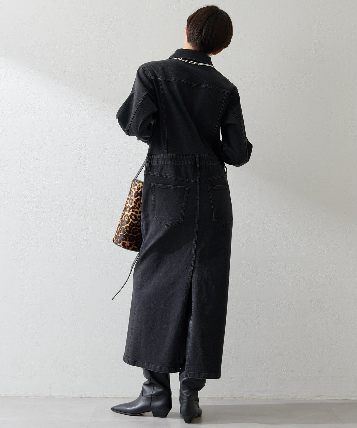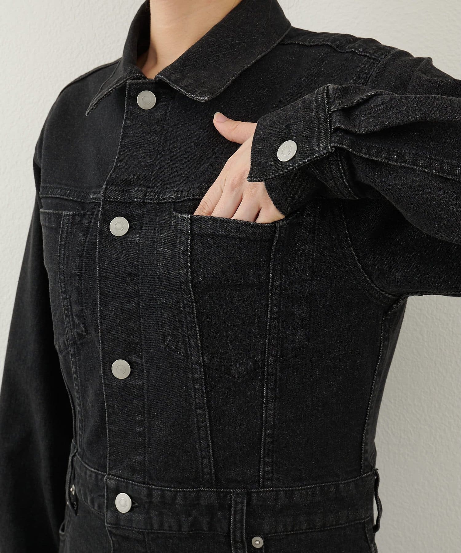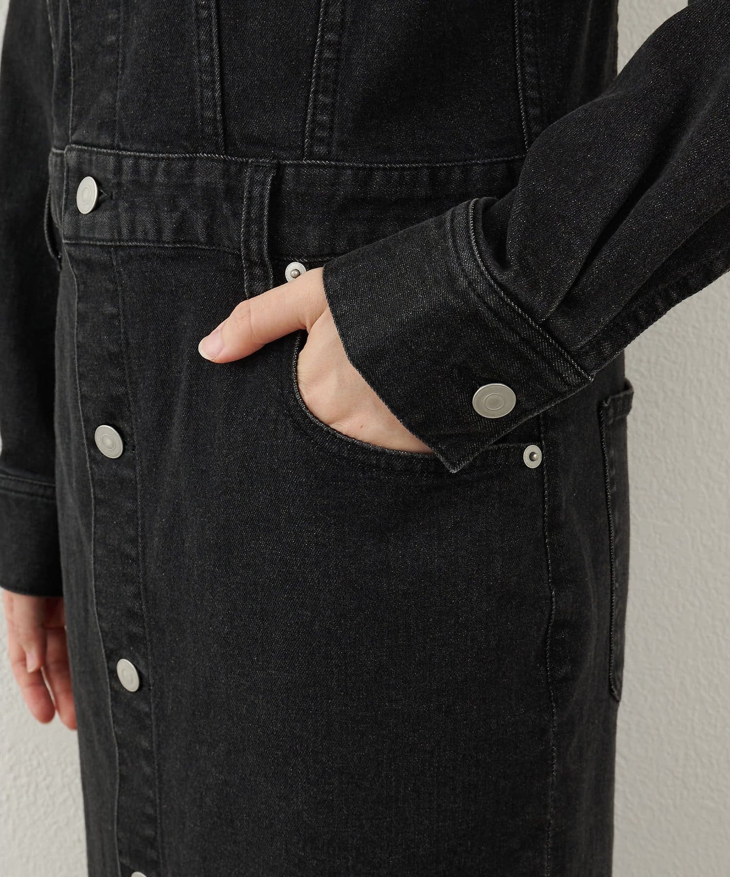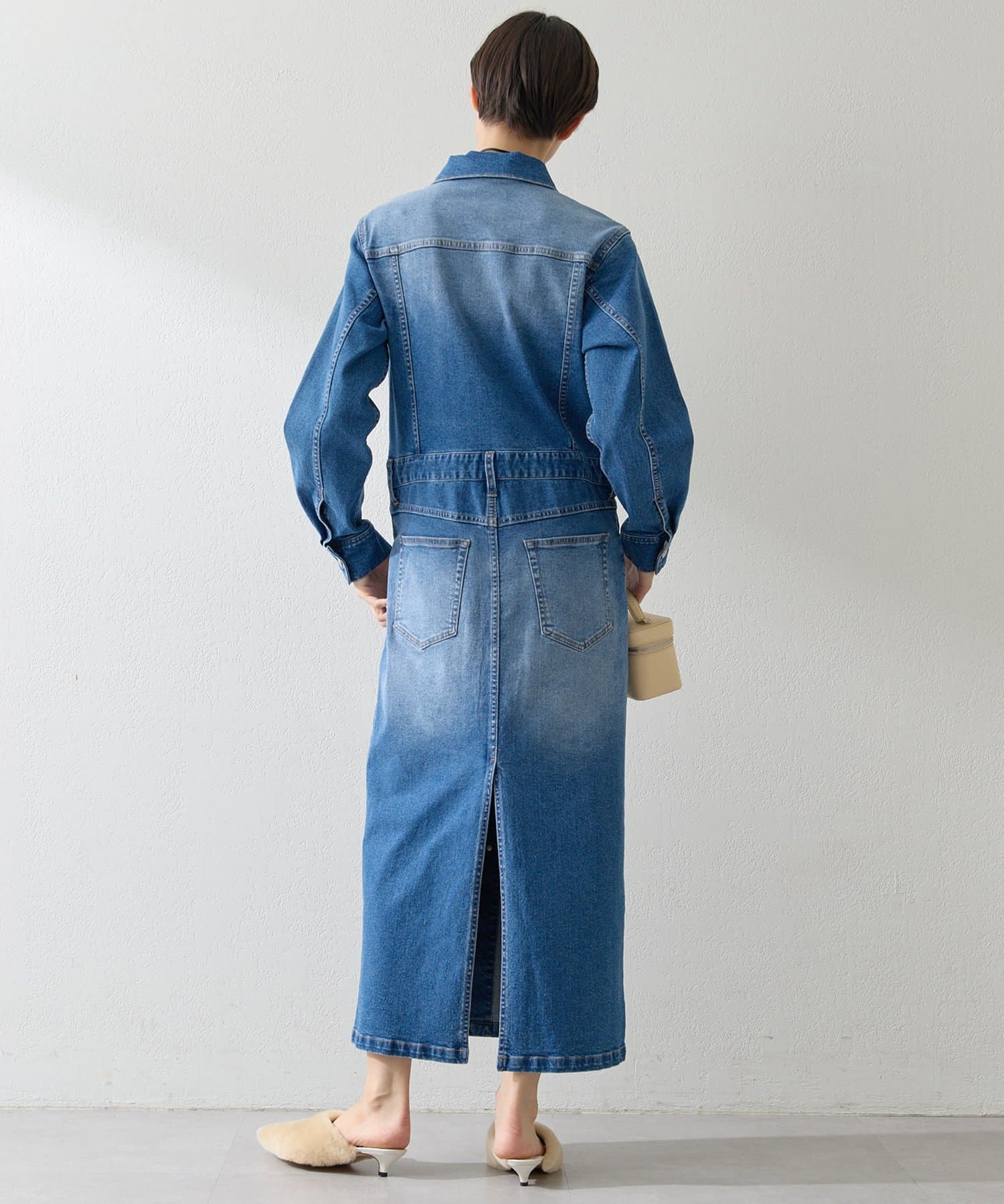■ストレッチ性のあるデニム生地を使用しロング丈に仕上げ、細部の加工にもこだわった一着。