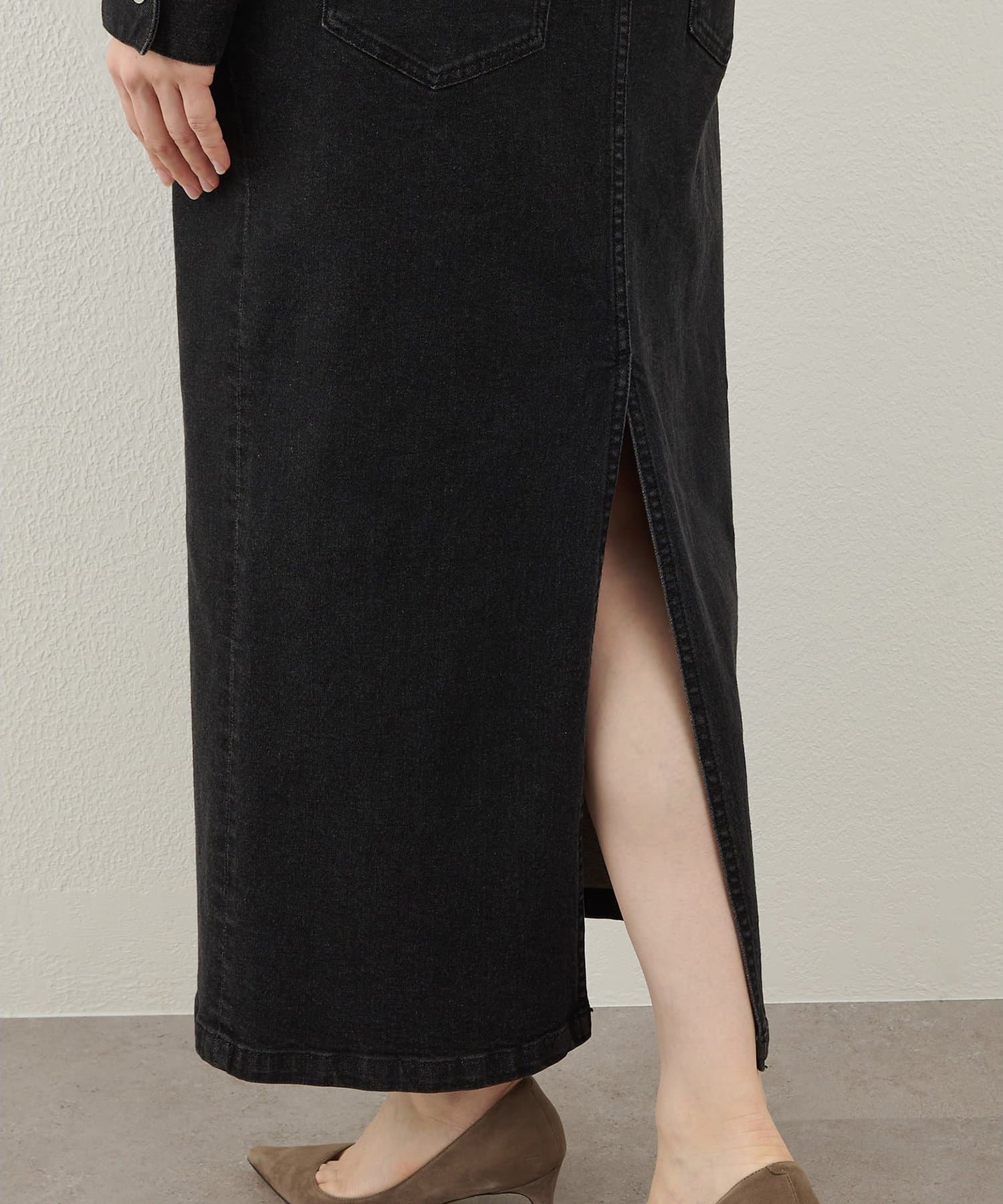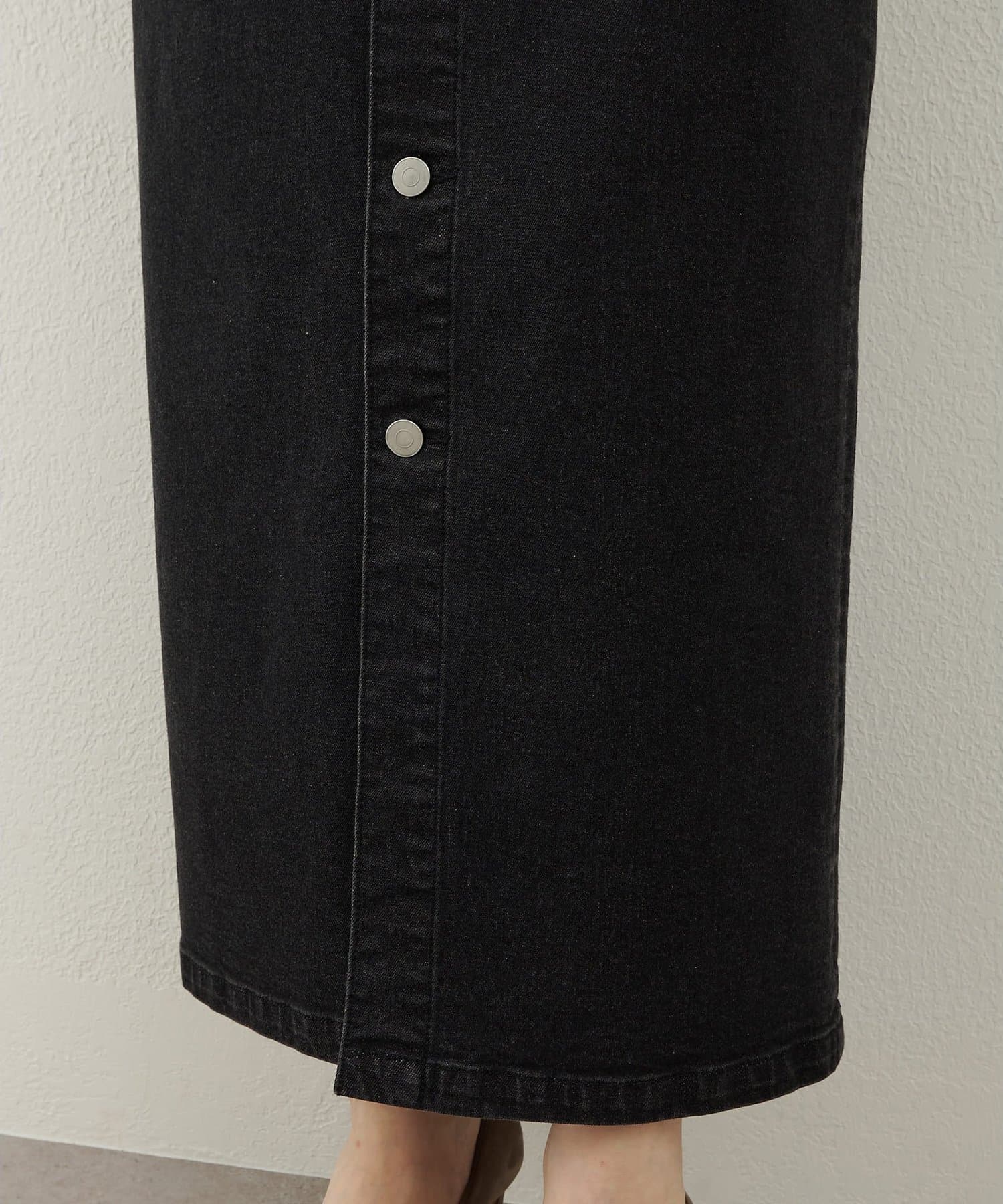 ■縦に連なるボタンデザインが縦見えしすっきりと見え、ボタンの開け位置でフロントスリットをお好みに調整可能。