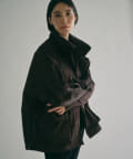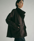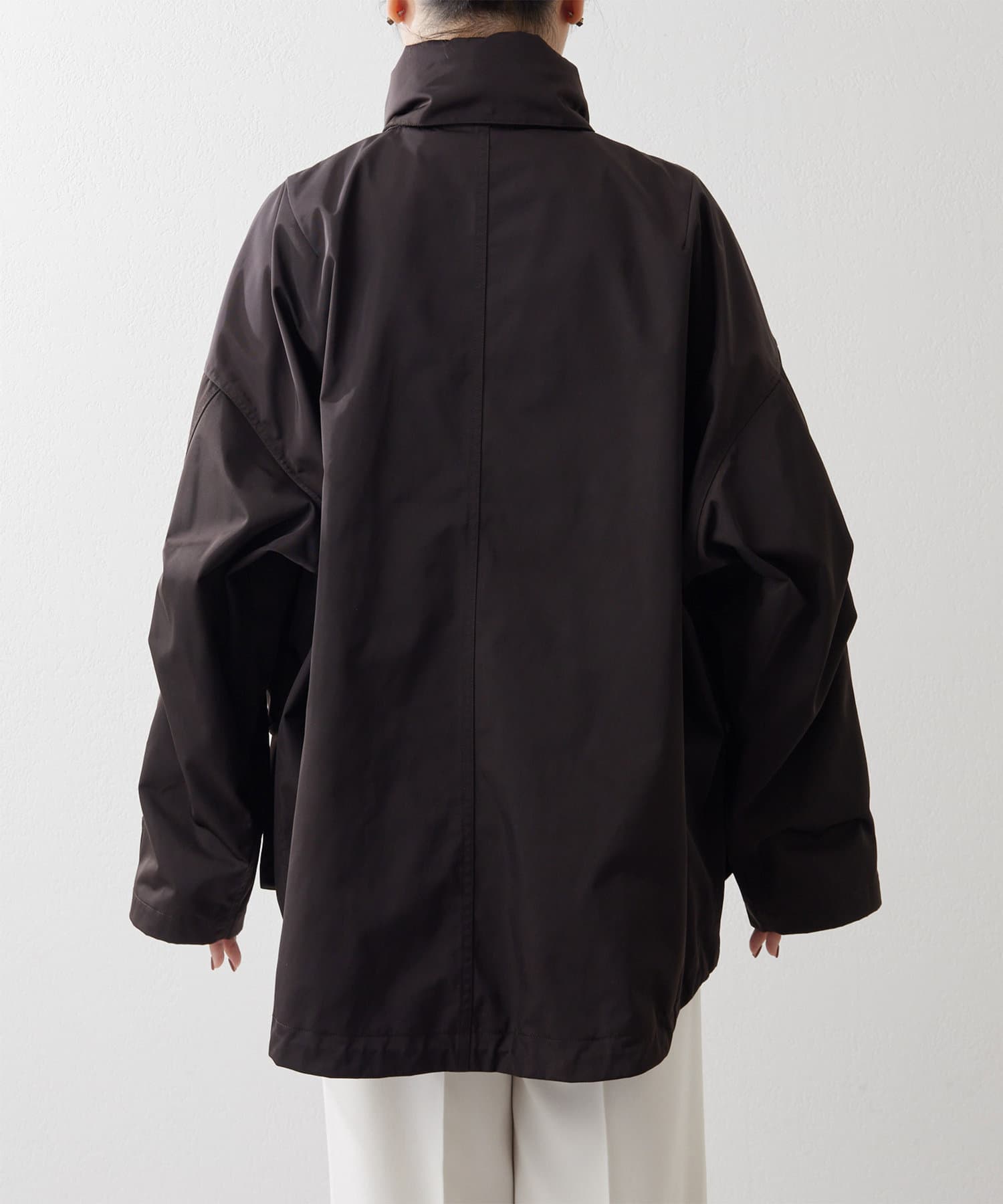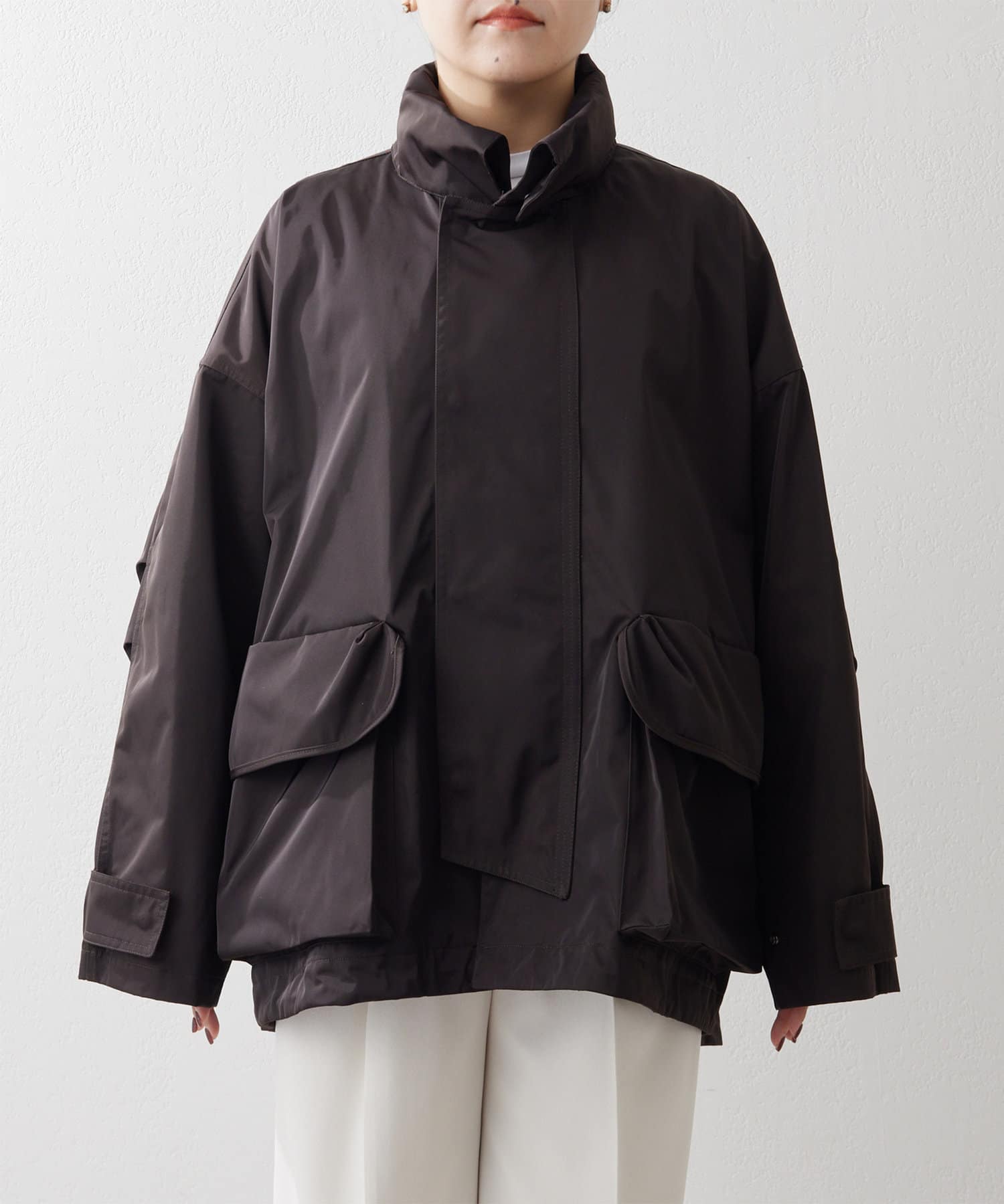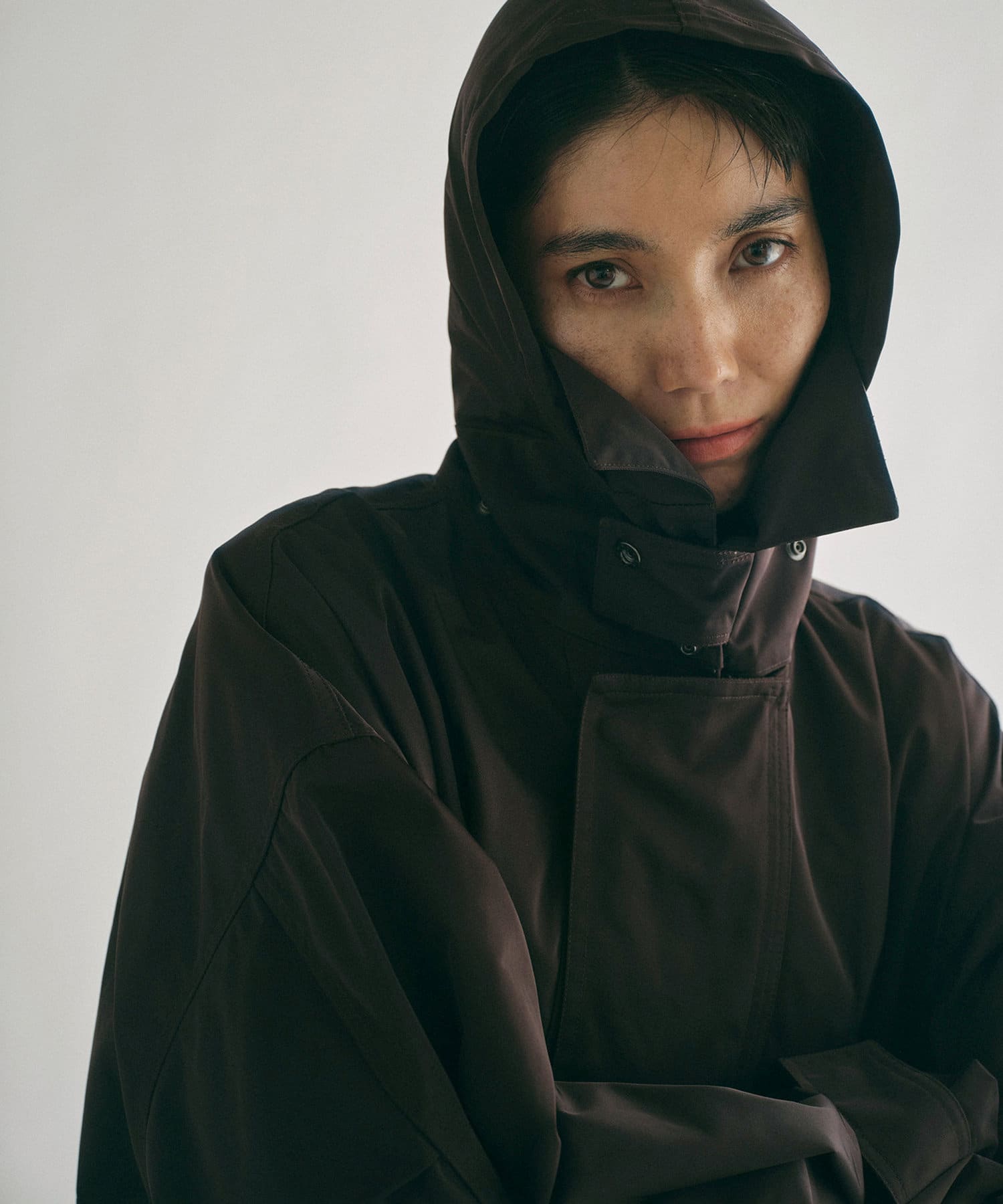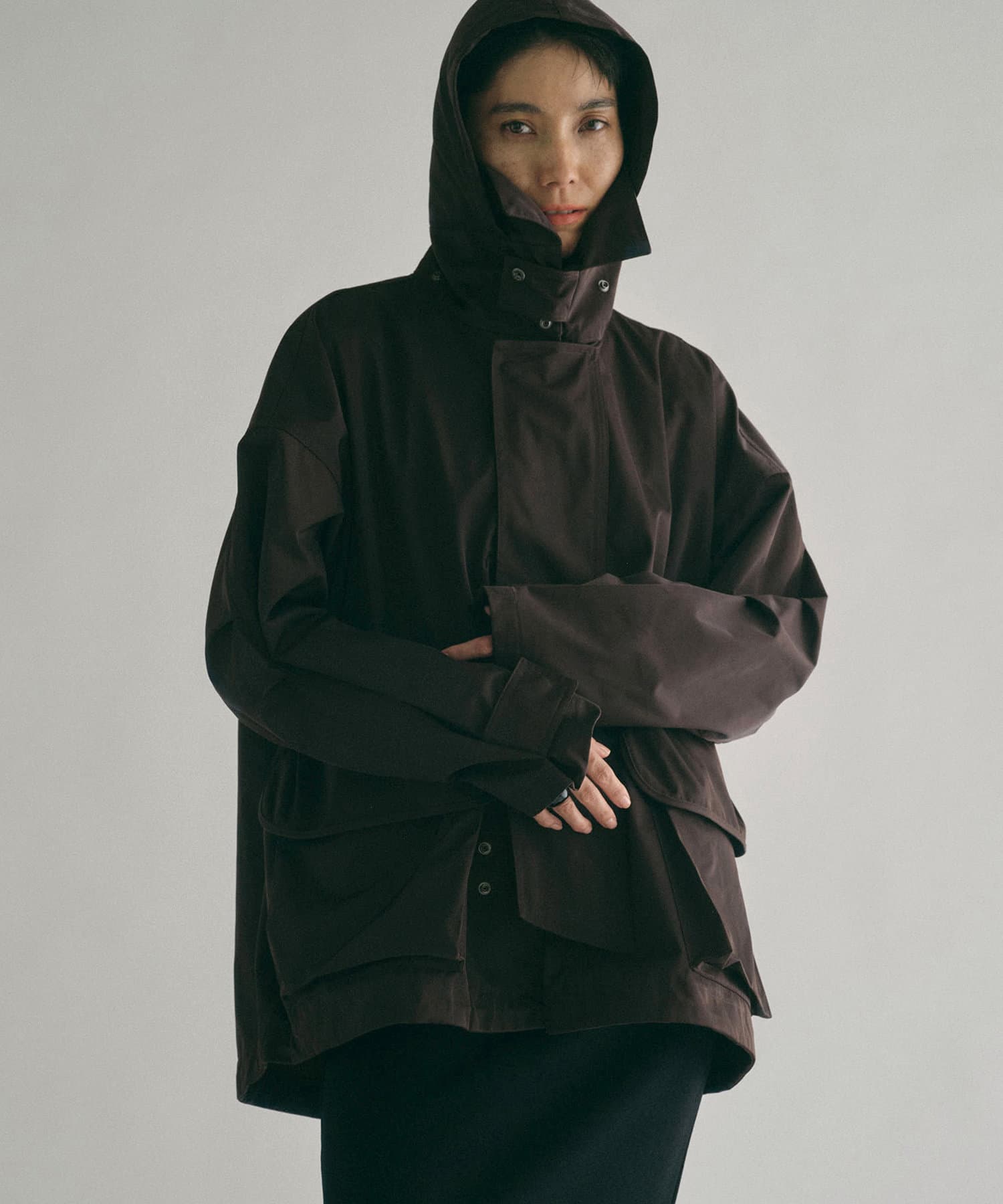 ■ユニセックスなサイズ感のブルゾンは、立体感のあるポケットとフード付きの大きな衿がポイント。