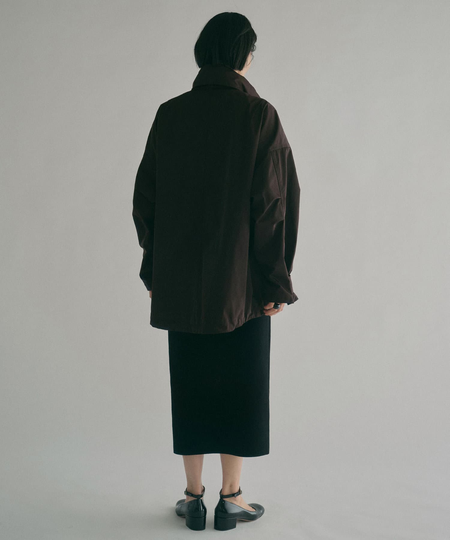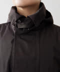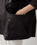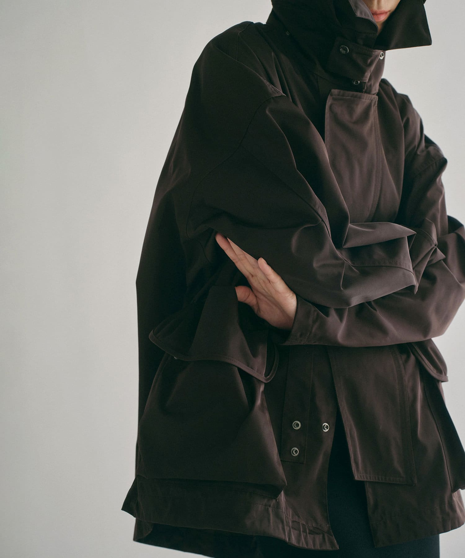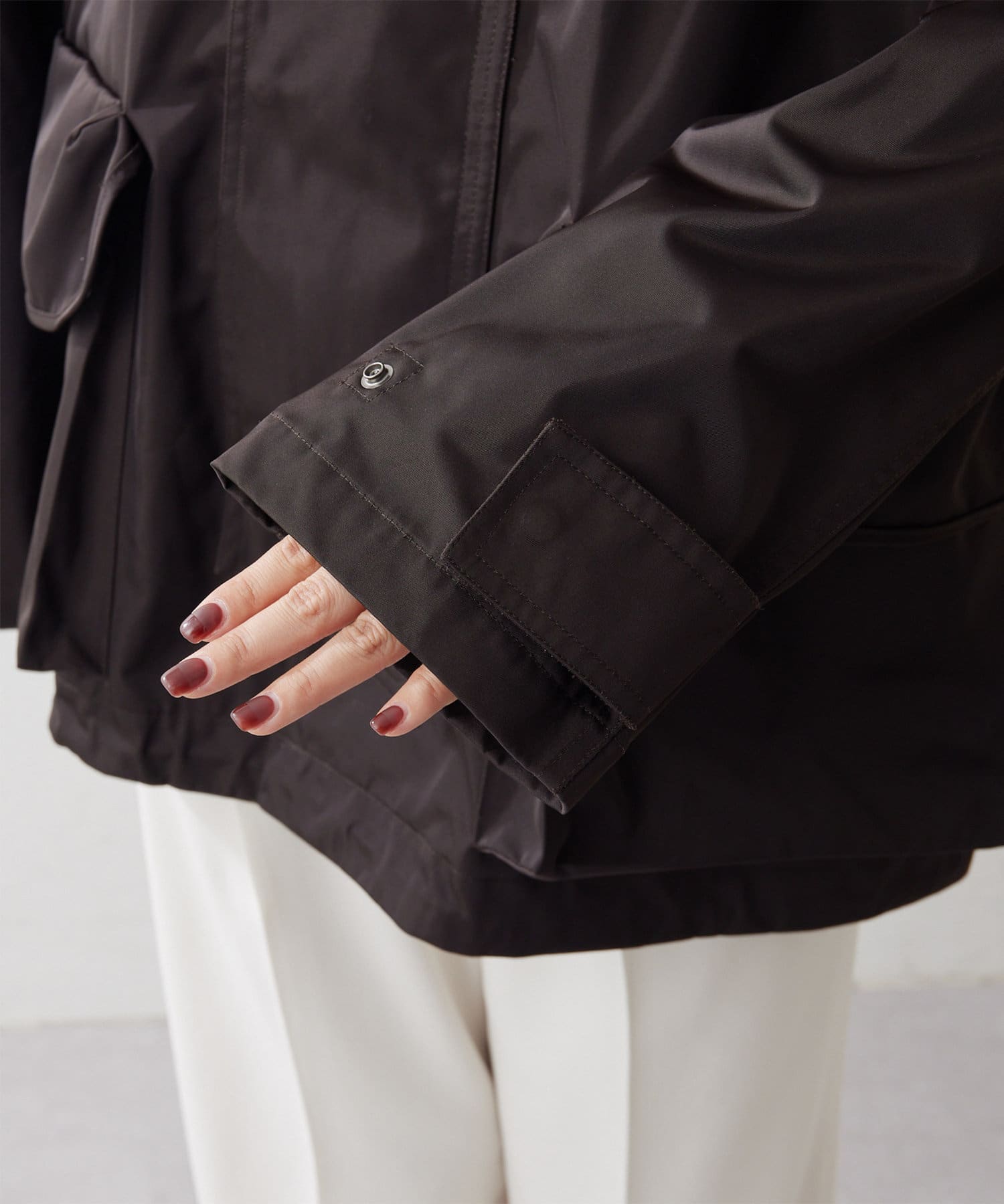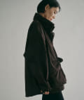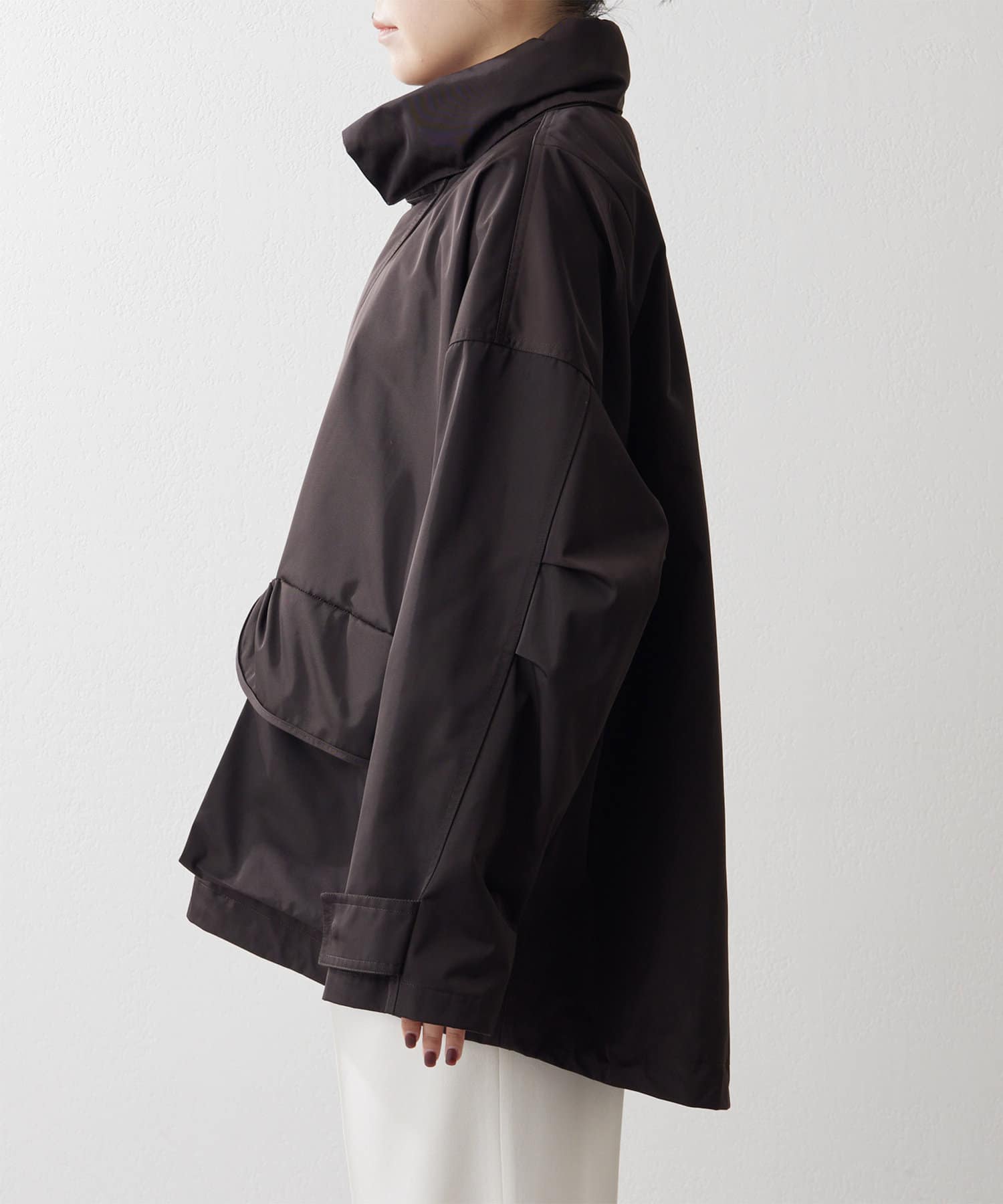 ■ユニセックスなサイズ感のブルゾンは、立体感のあるポケットとフード付きの大きな衿がポイント。