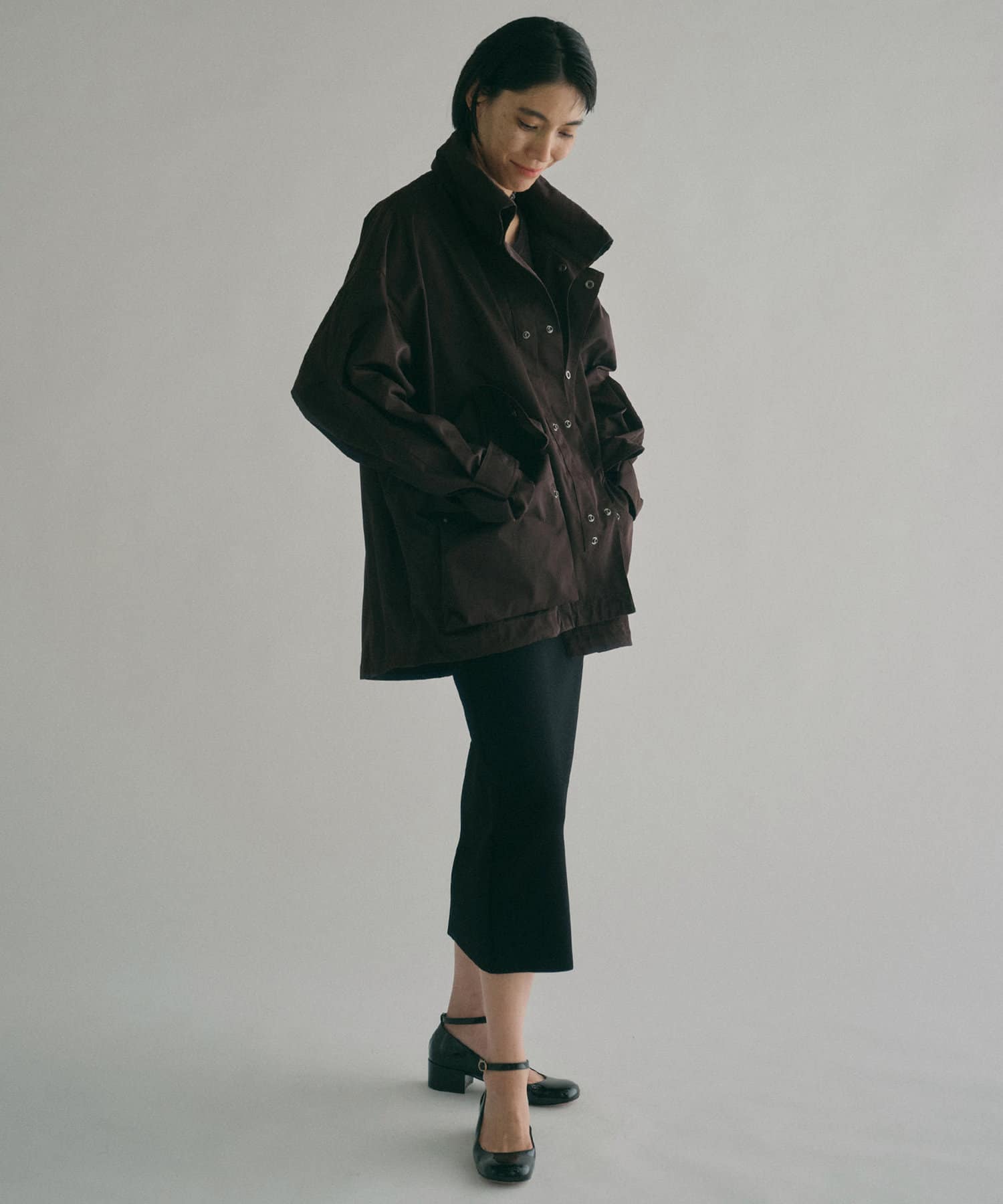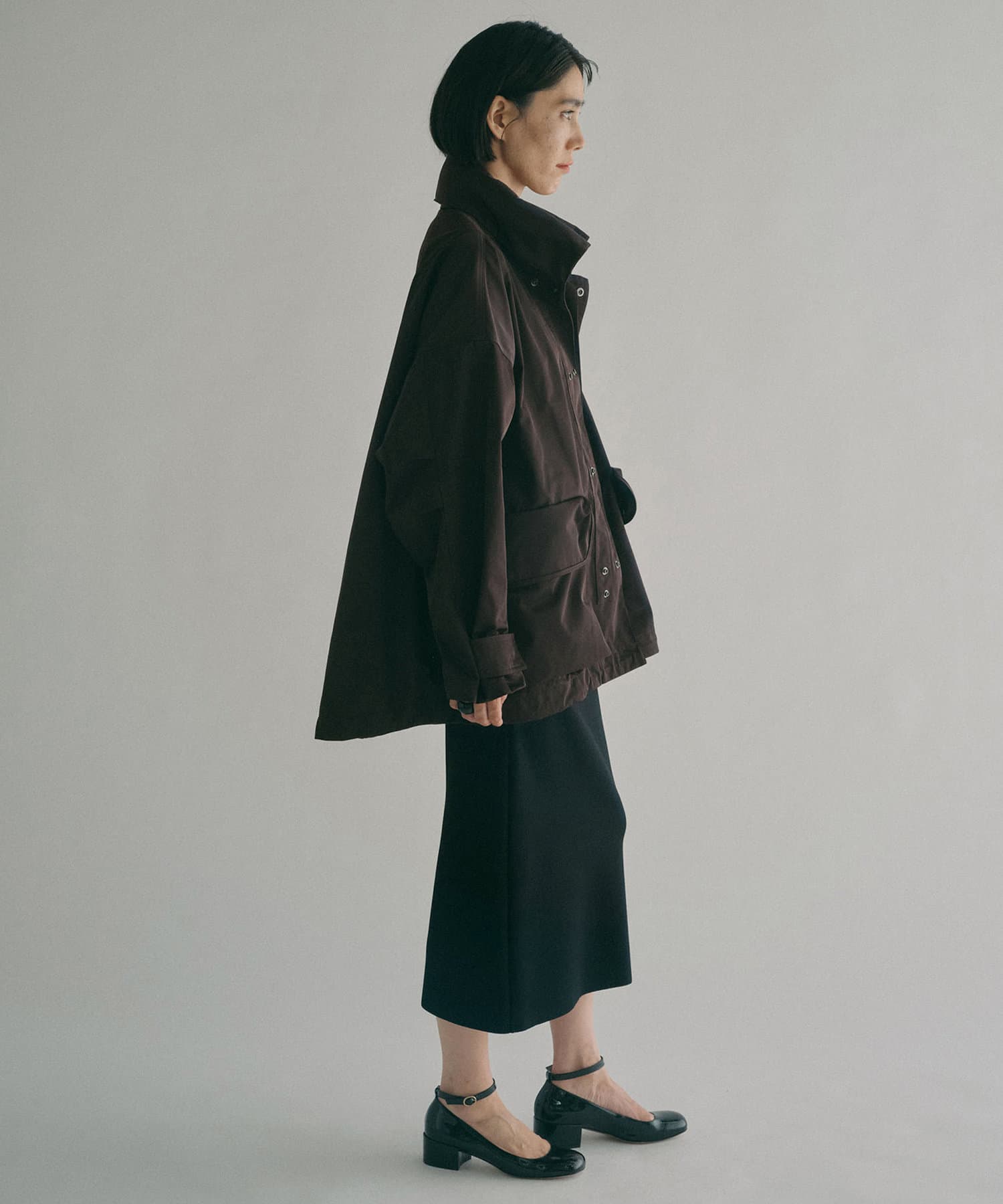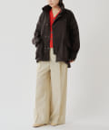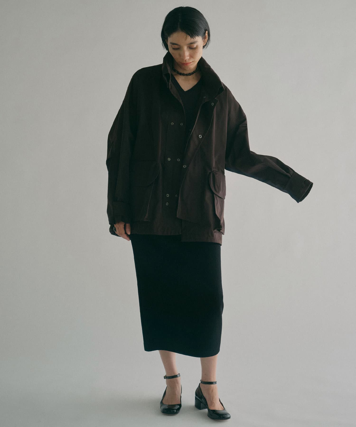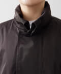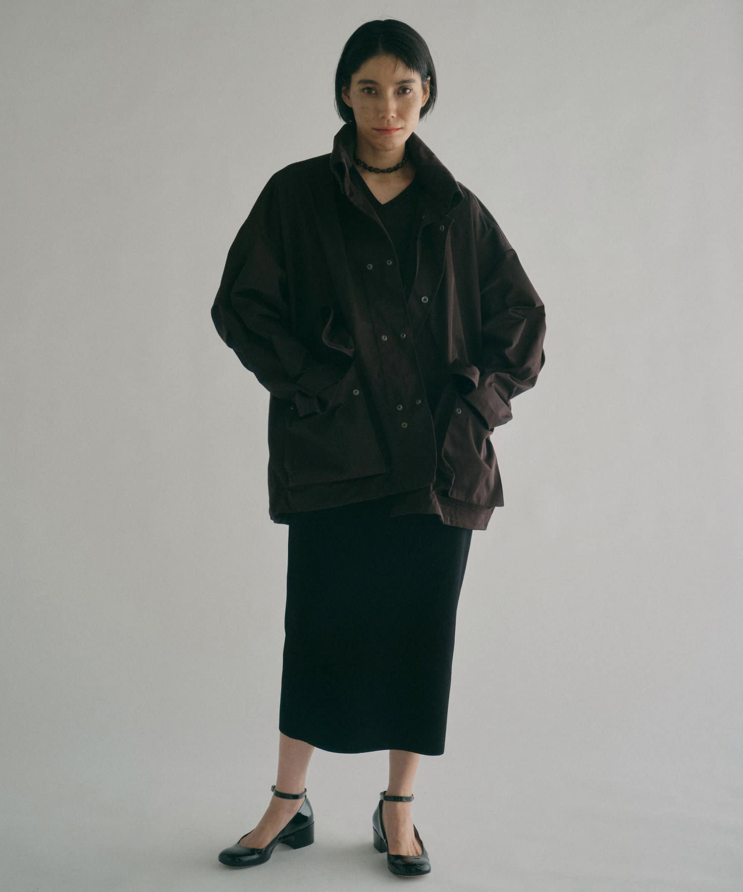 ■ユニセックスなサイズ感のブルゾンは、立体感のあるポケットとフード付きの大きな衿がポイント。