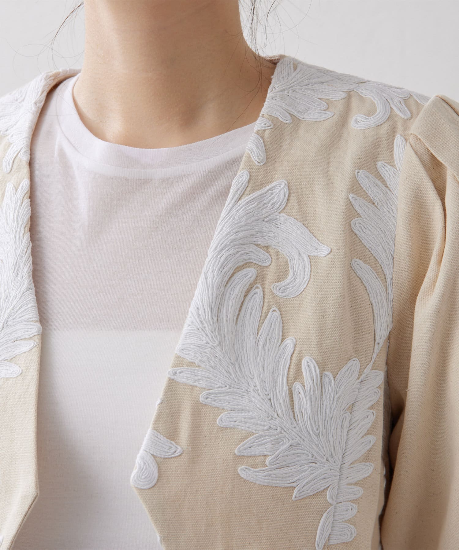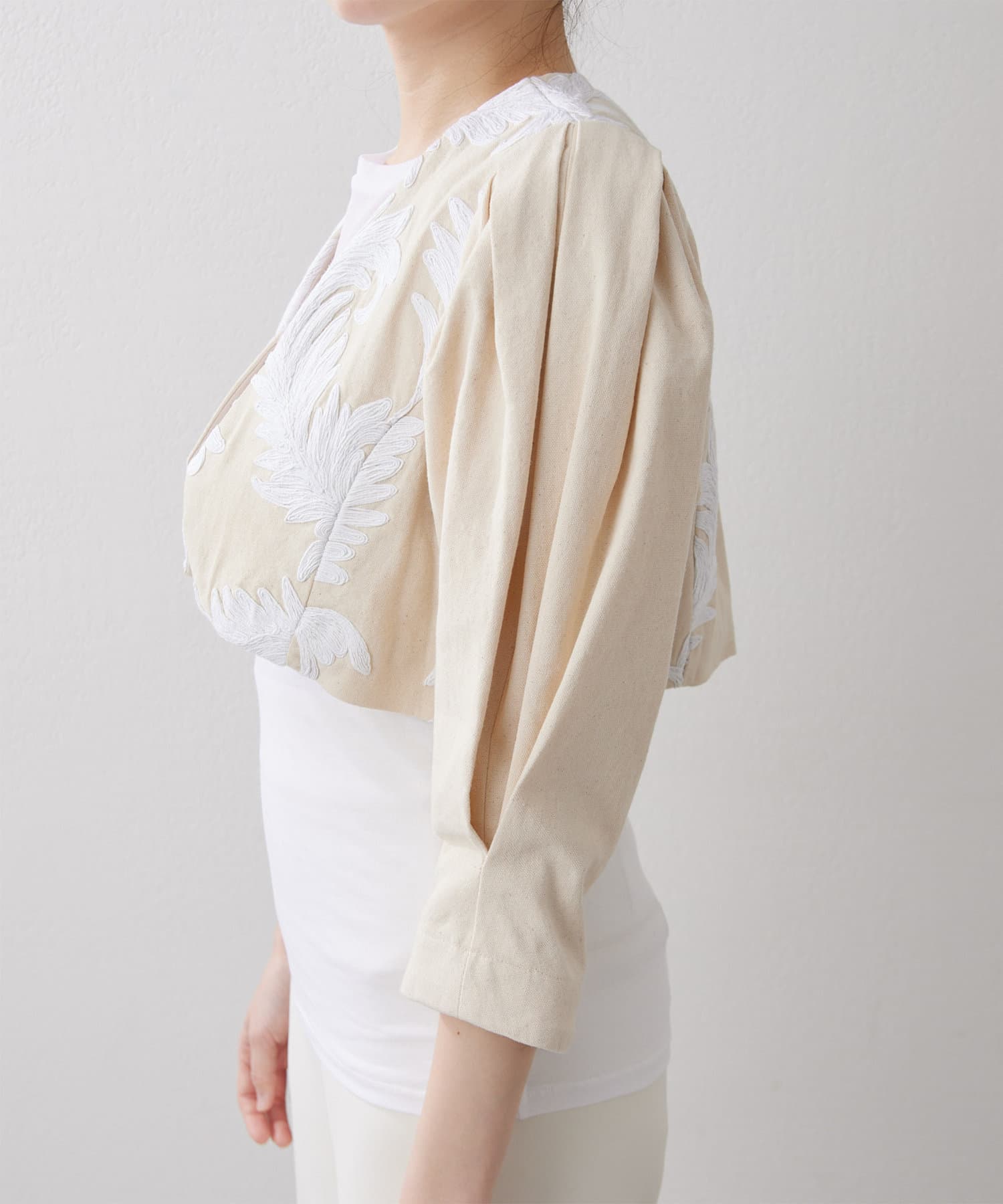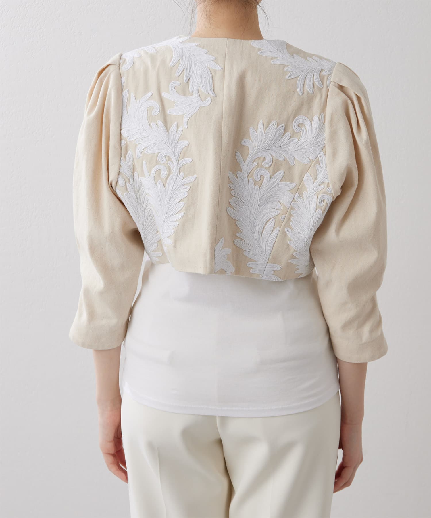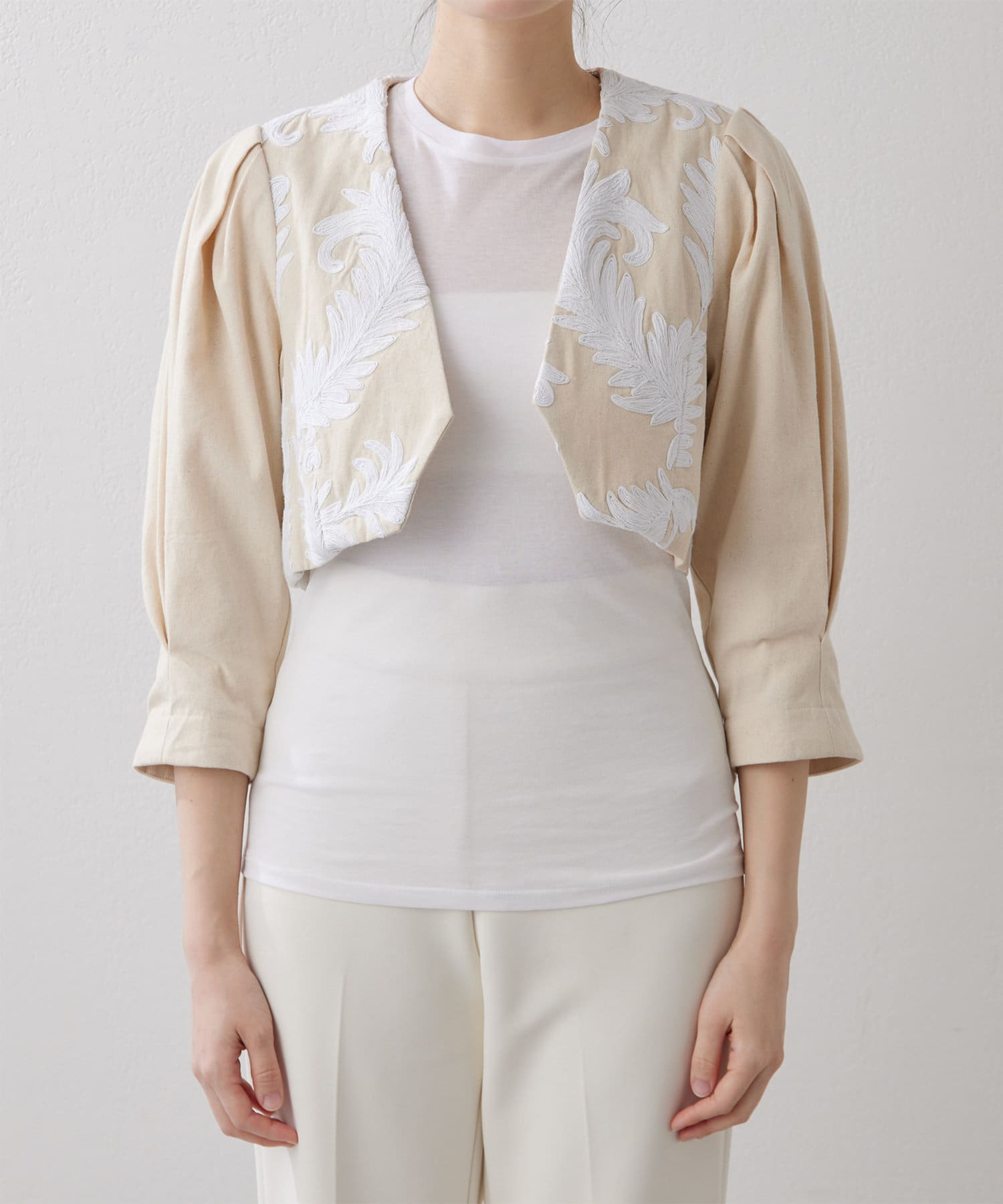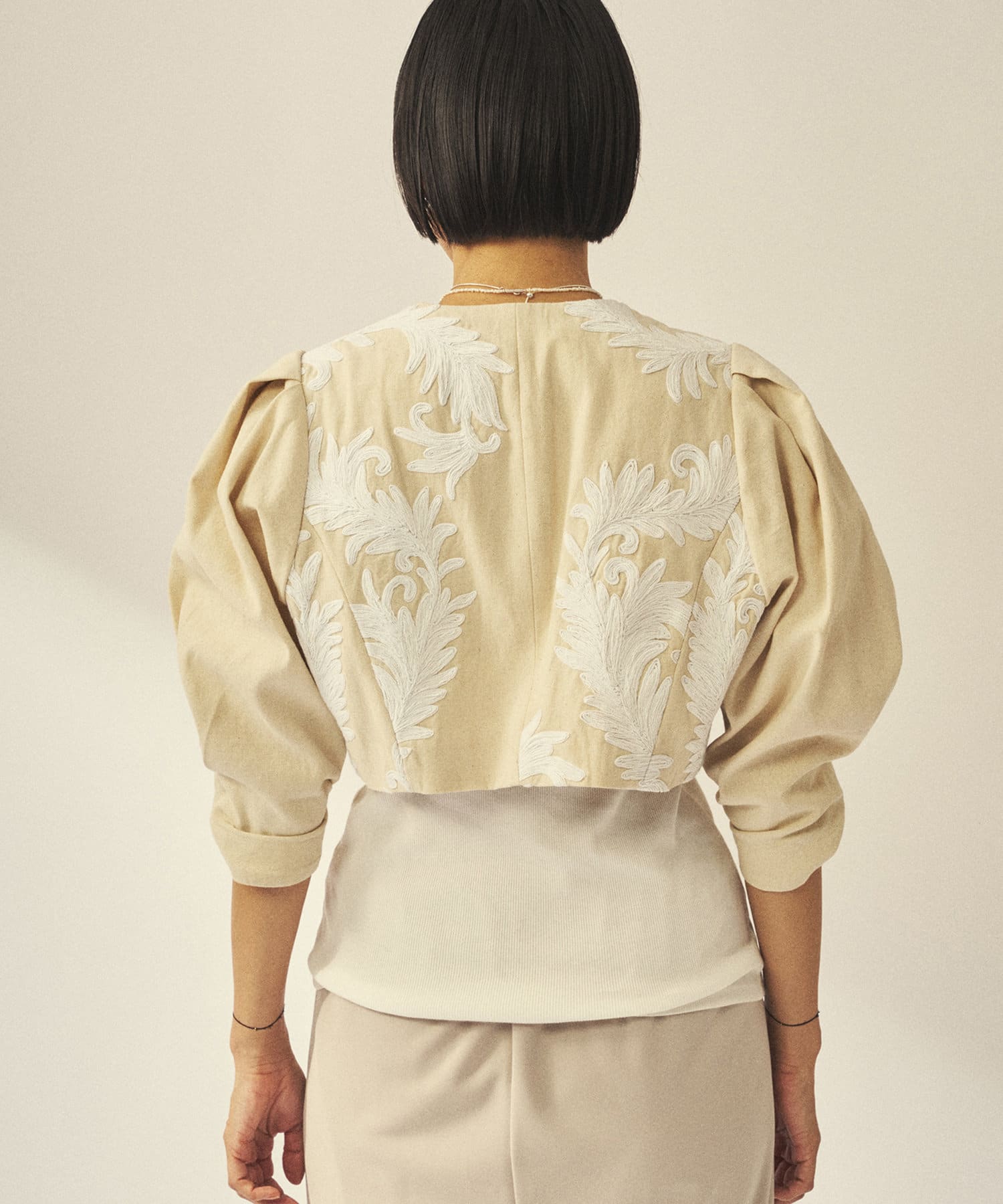 ■コットンオックスの生地にコード刺繍を施したボレロジャケット。