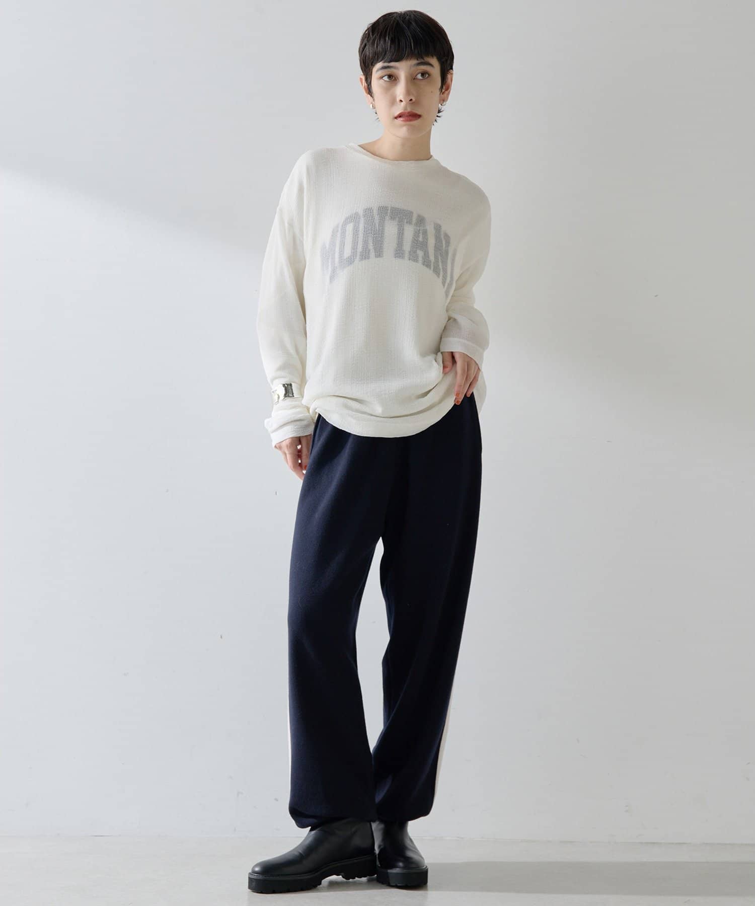 ■ミラノリブ組織で編立たパンツは、梳毛糸に比べ軽さがありしなやかなタッチが特徴。