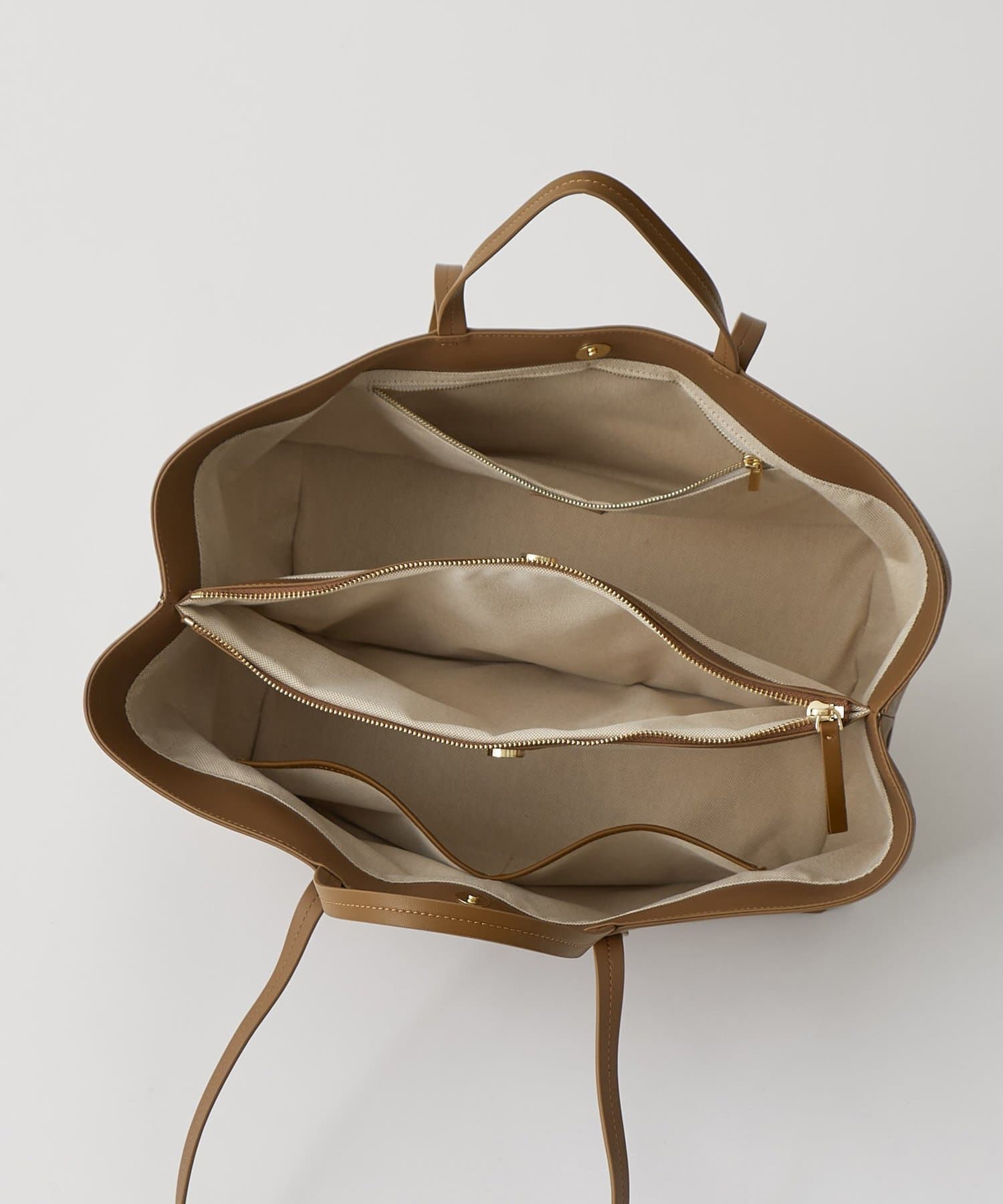 ■マチ幅をたっぷり取り開口部は両サイドと中央のファスナーの3か所に分かれた内装構造で、荷物の整理がしやすい仕様。