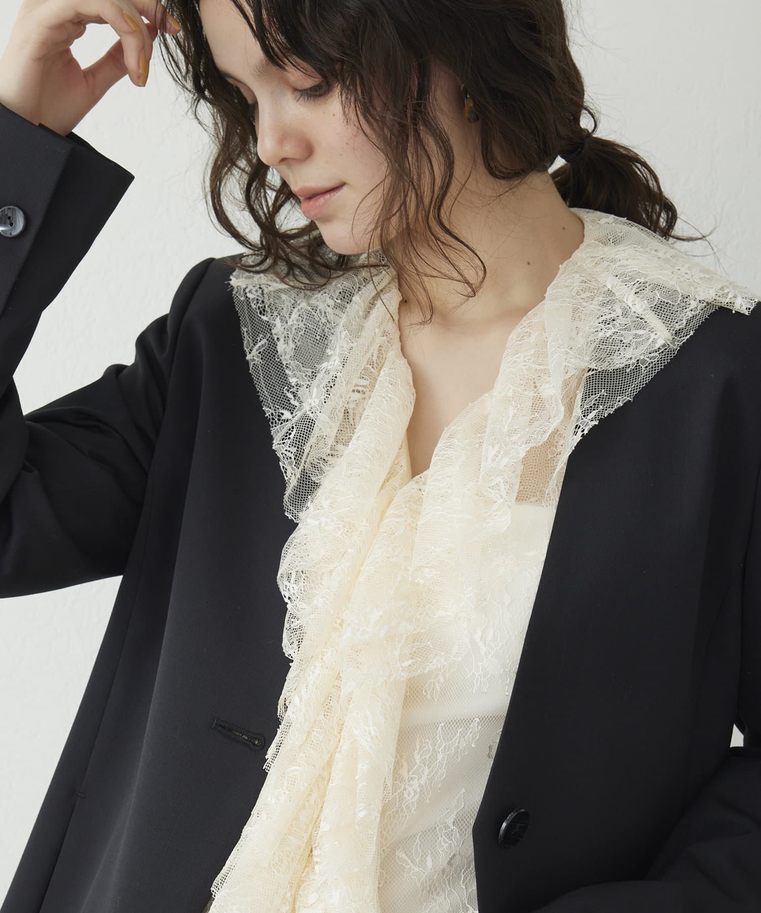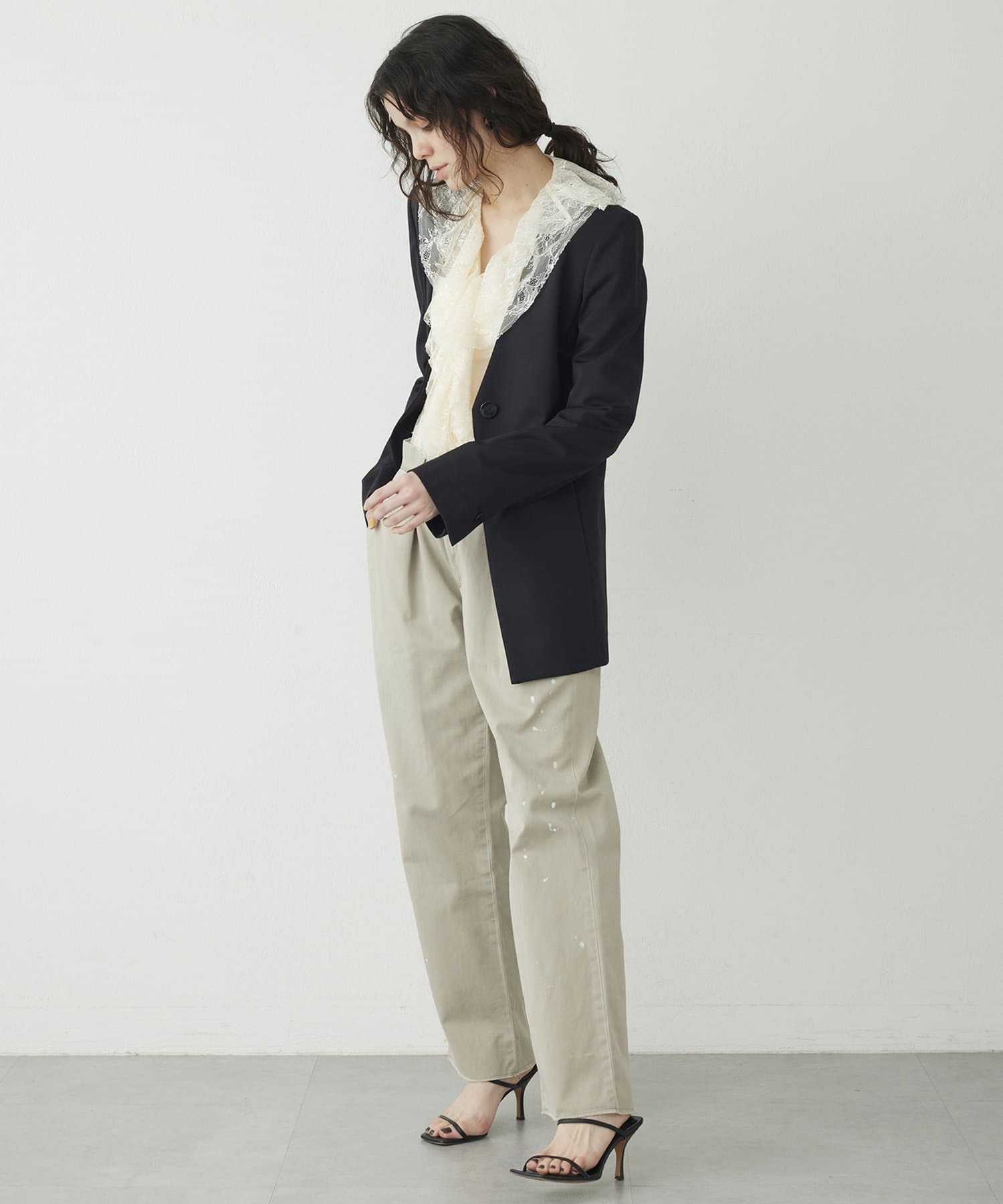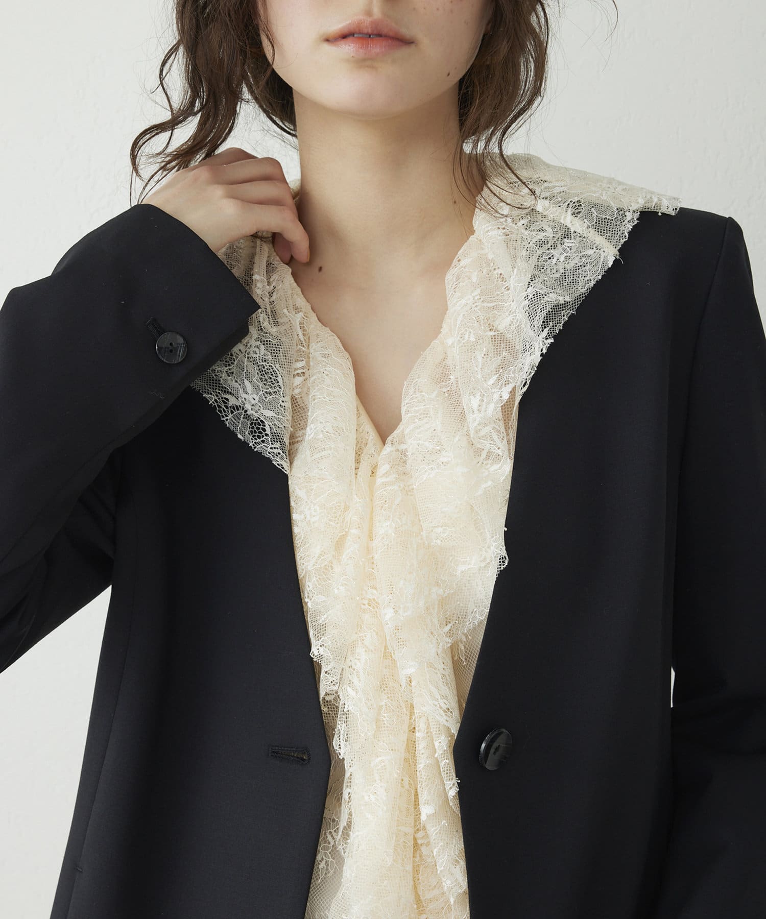 ■ラッフルカラーや袖フリルなどのディテールを入れてフェミニンな雰囲気に仕上げた一枚。