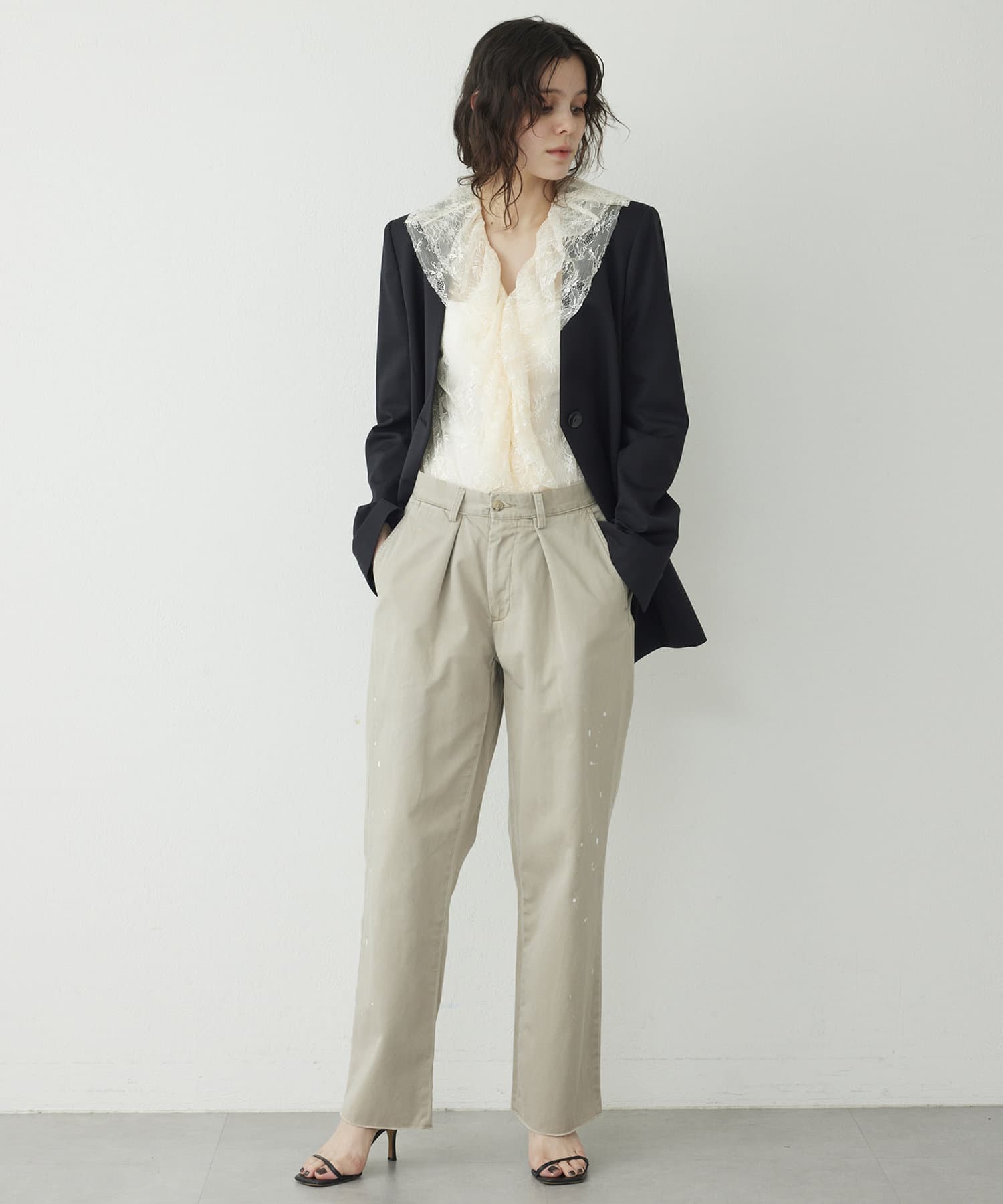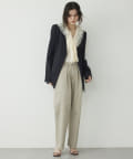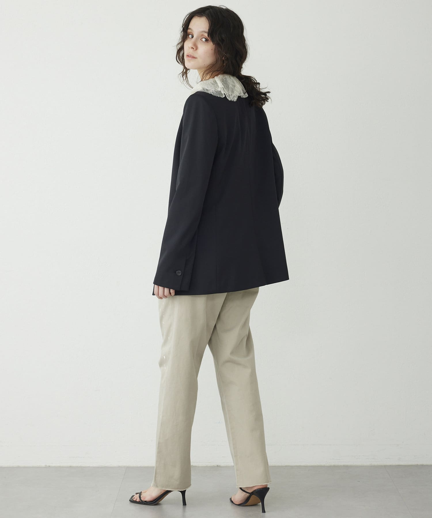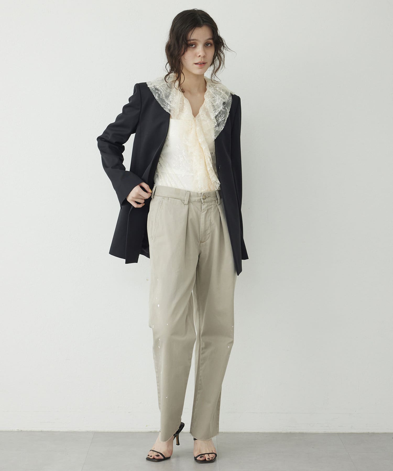 ■ラッフルカラーや袖フリルなどのディテールを入れてフェミニンな雰囲気に仕上げた一枚。