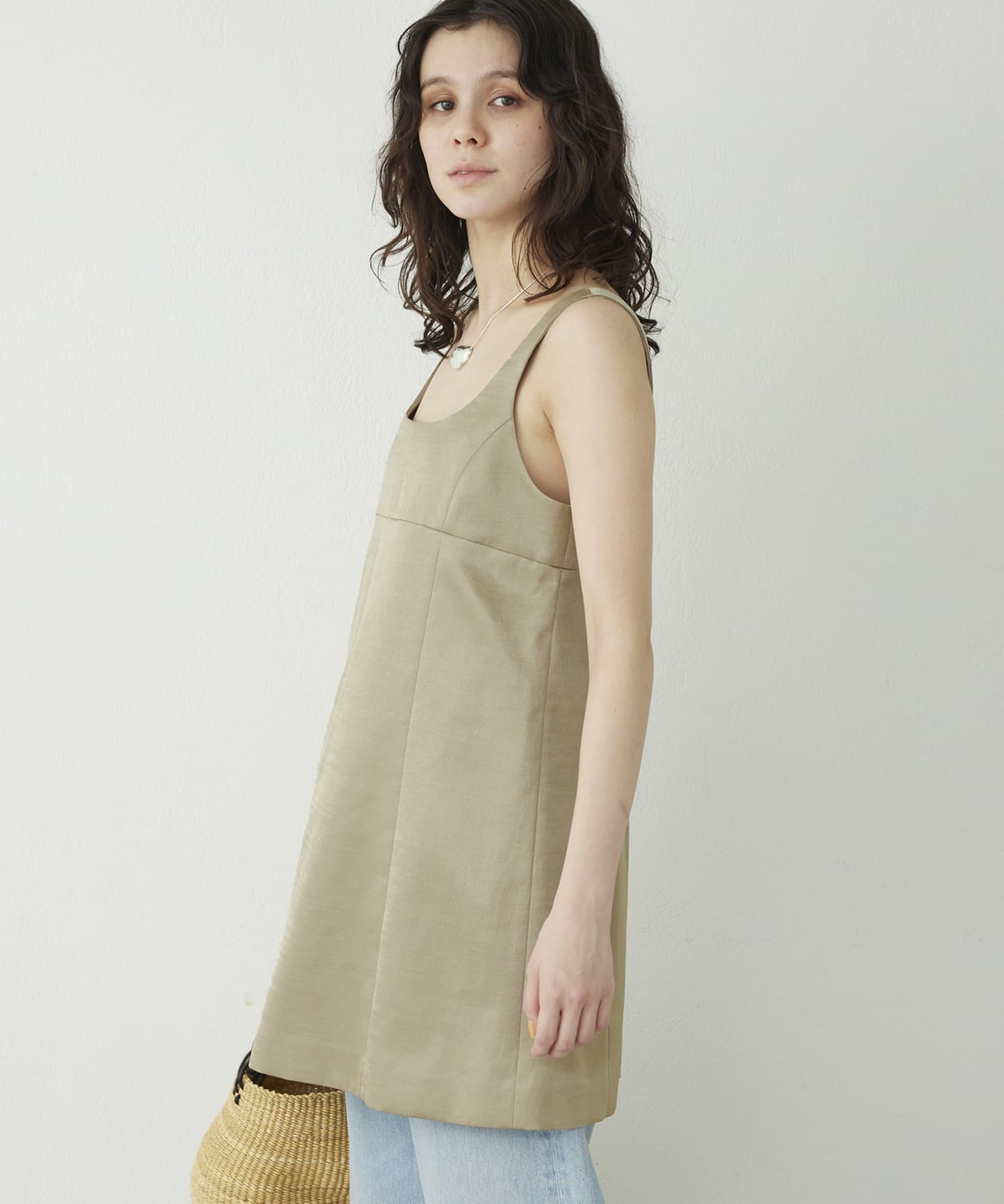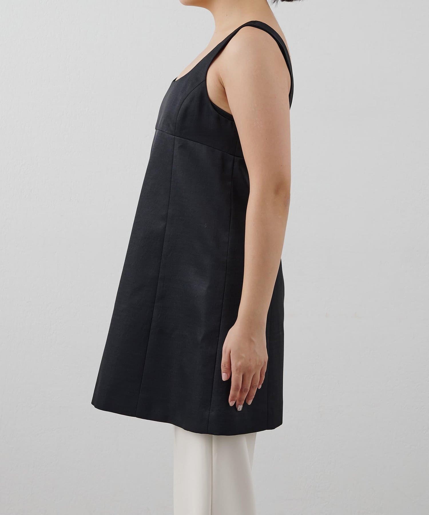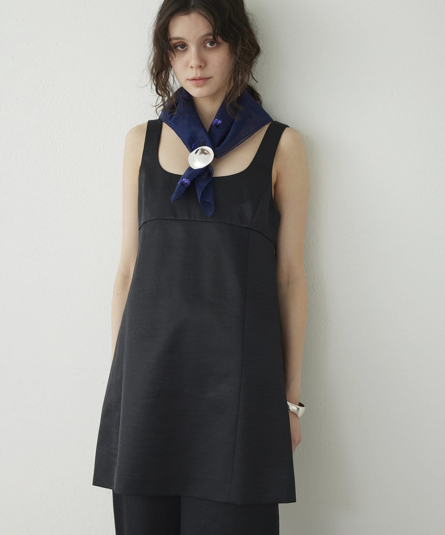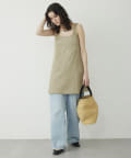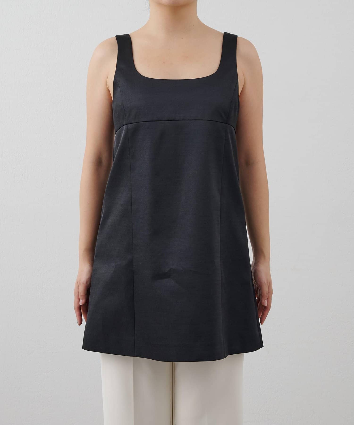■大胆なミニ丈のためボトムを合わせてスリーブレストップスとしてスタイリングするのも◎。