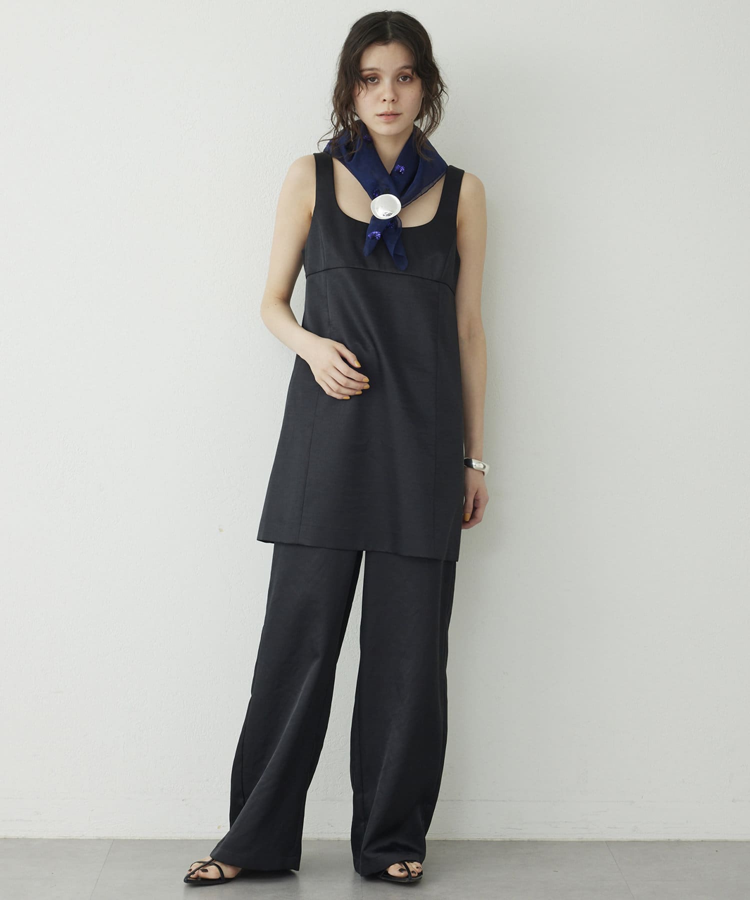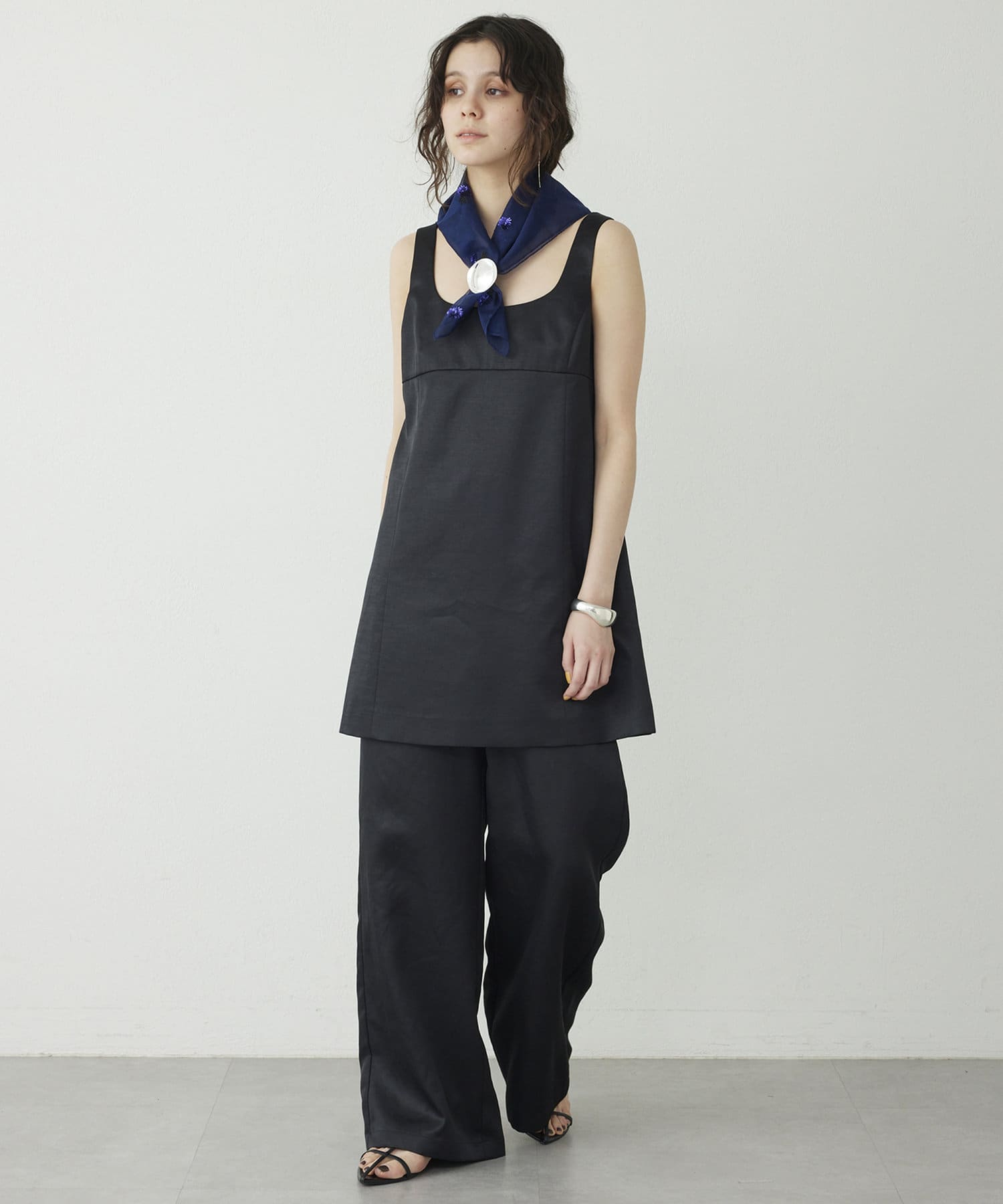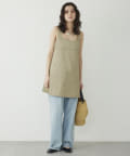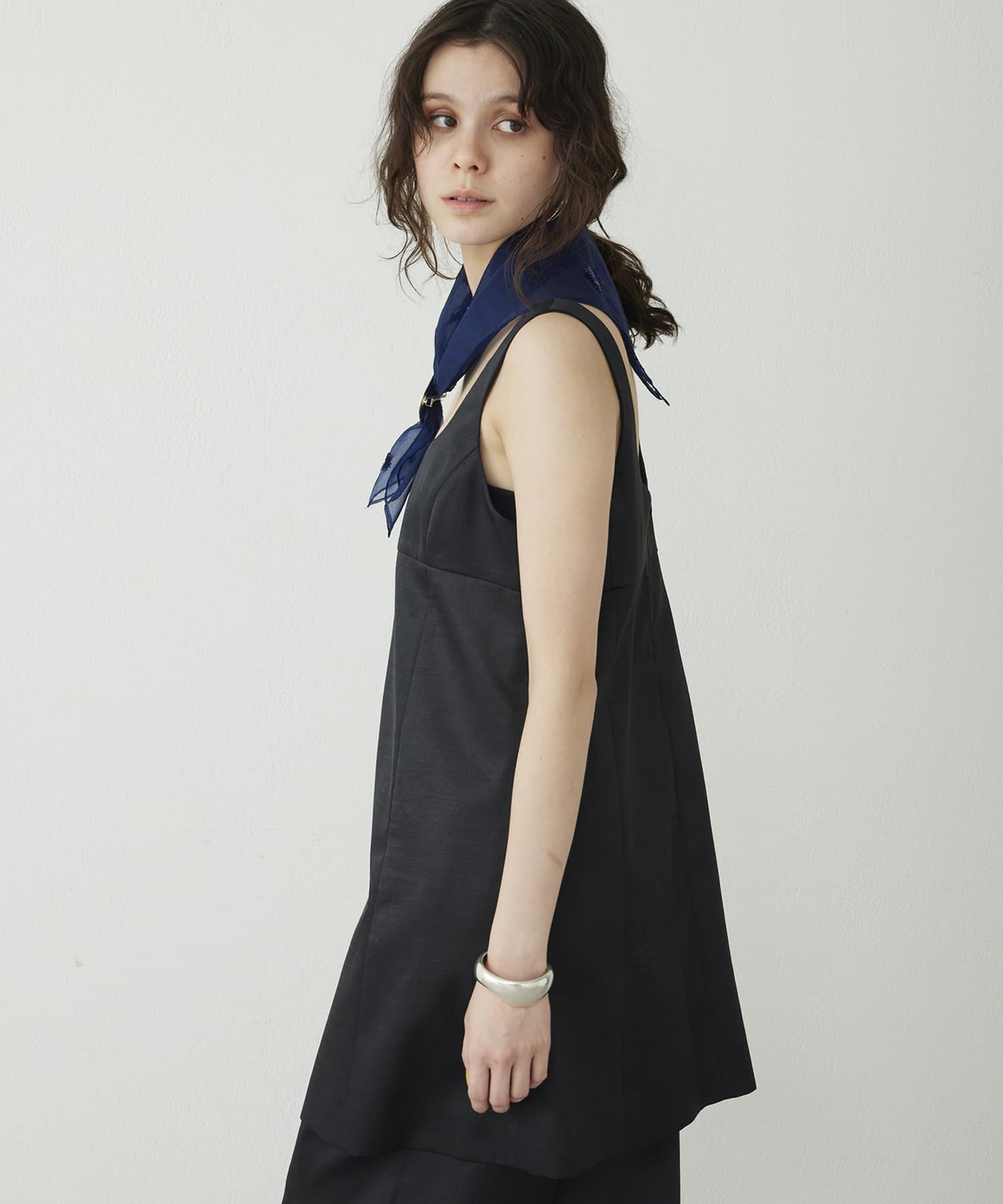 ■大胆なミニ丈のためボトムを合わせてスリーブレストップスとしてスタイリングするのも◎。