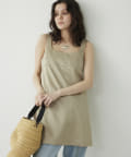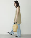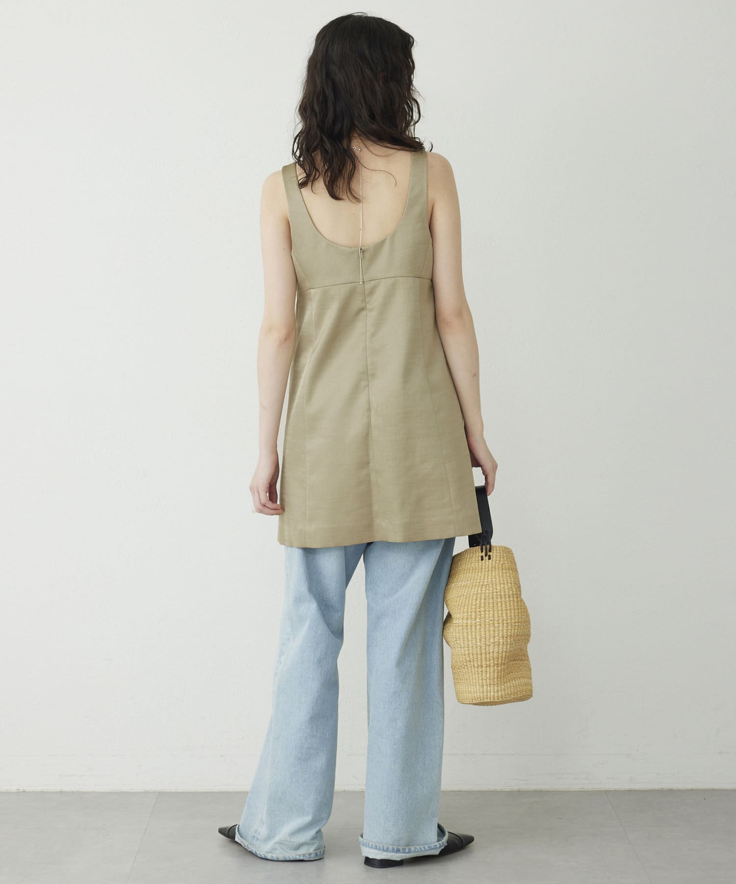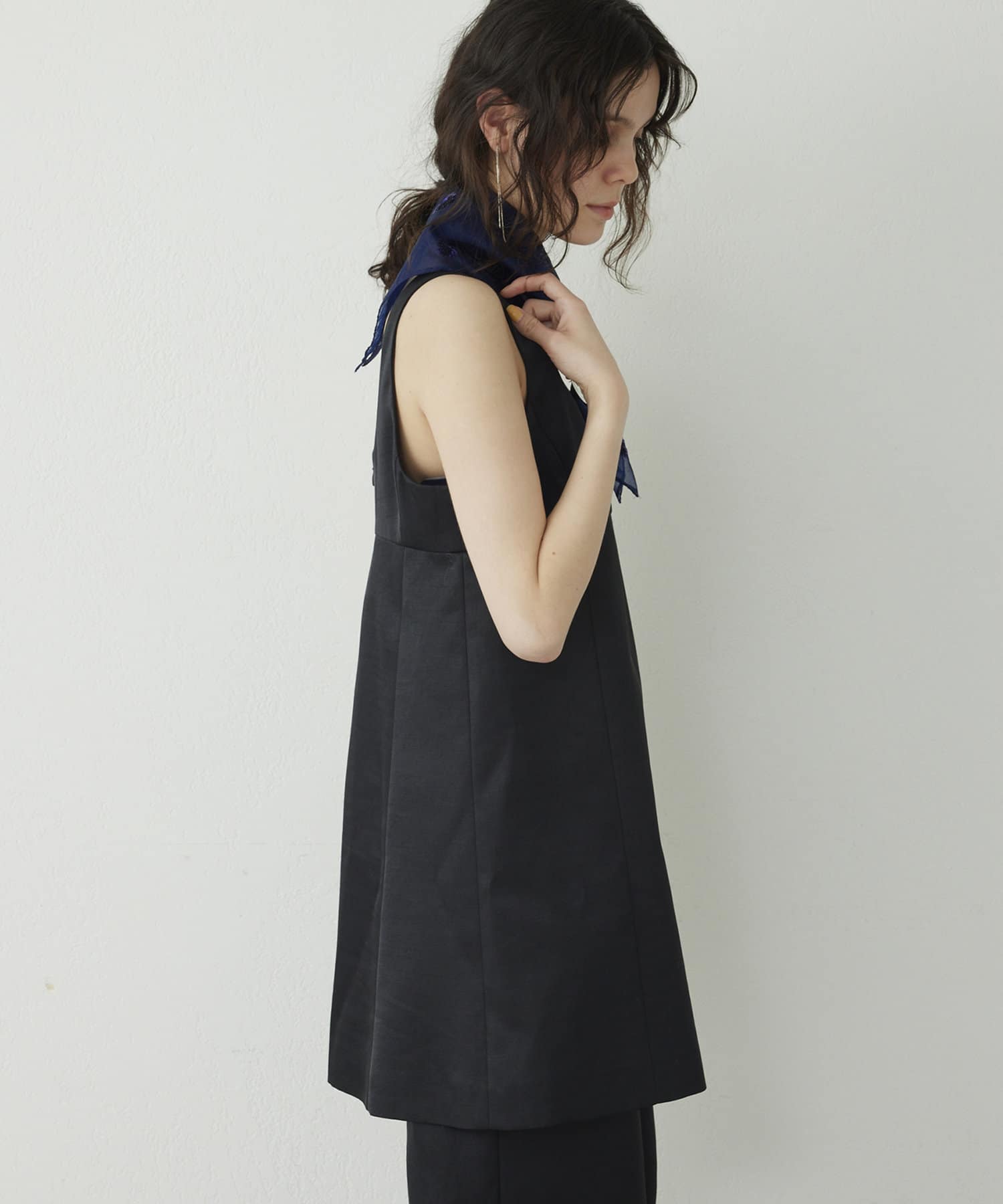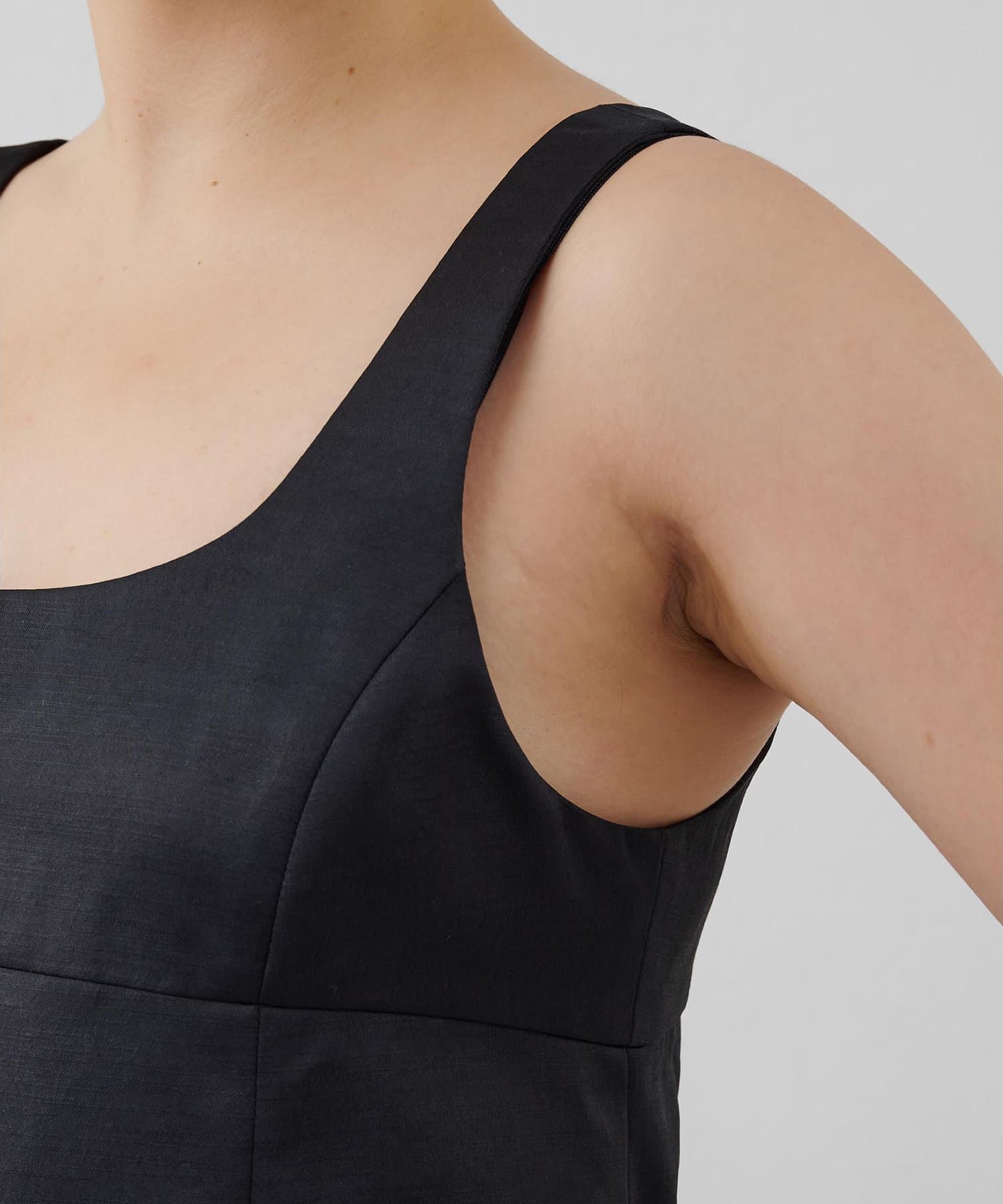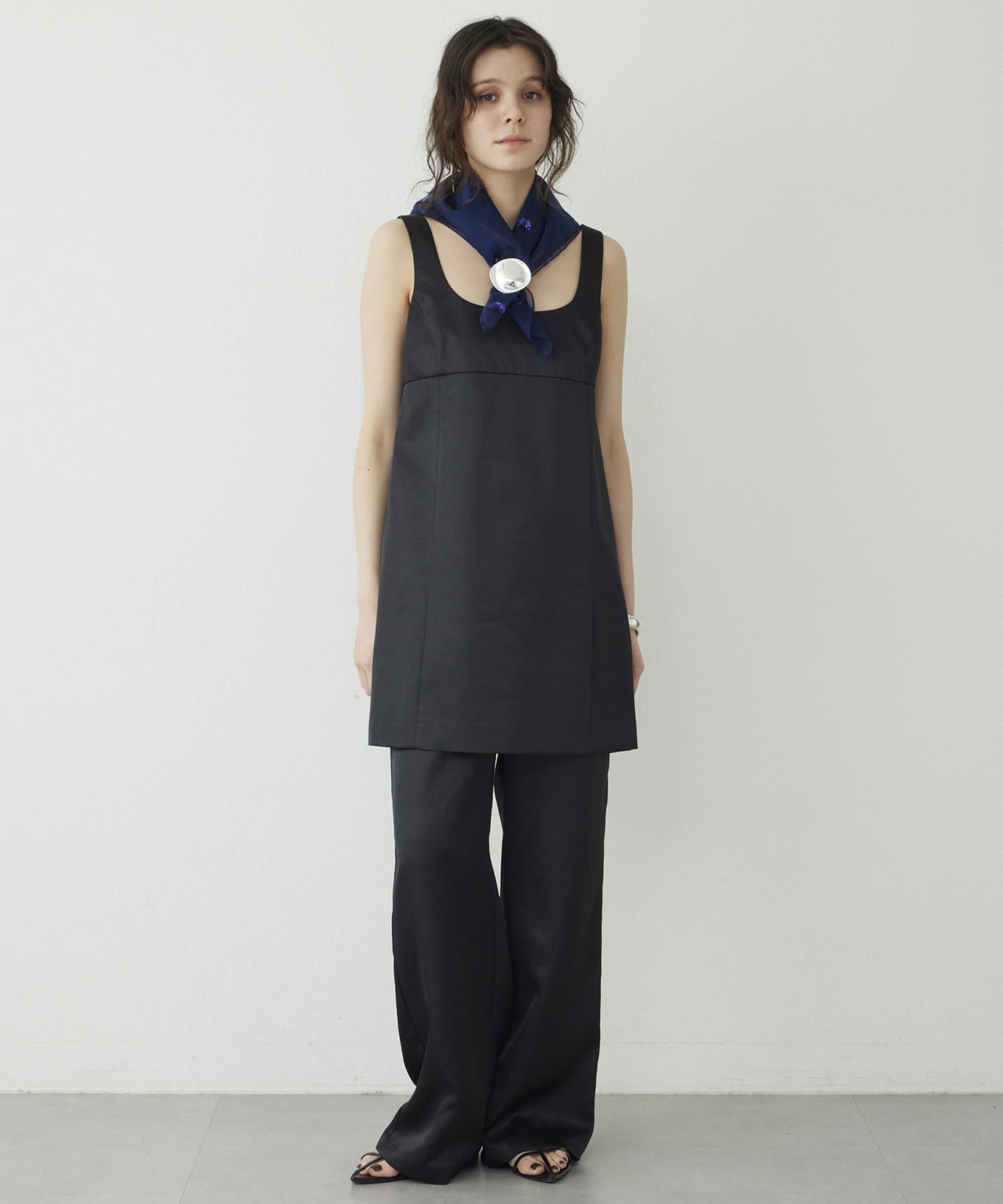 ■大胆なミニ丈のためボトムを合わせてスリーブレストップスとしてスタイリングするのも◎。