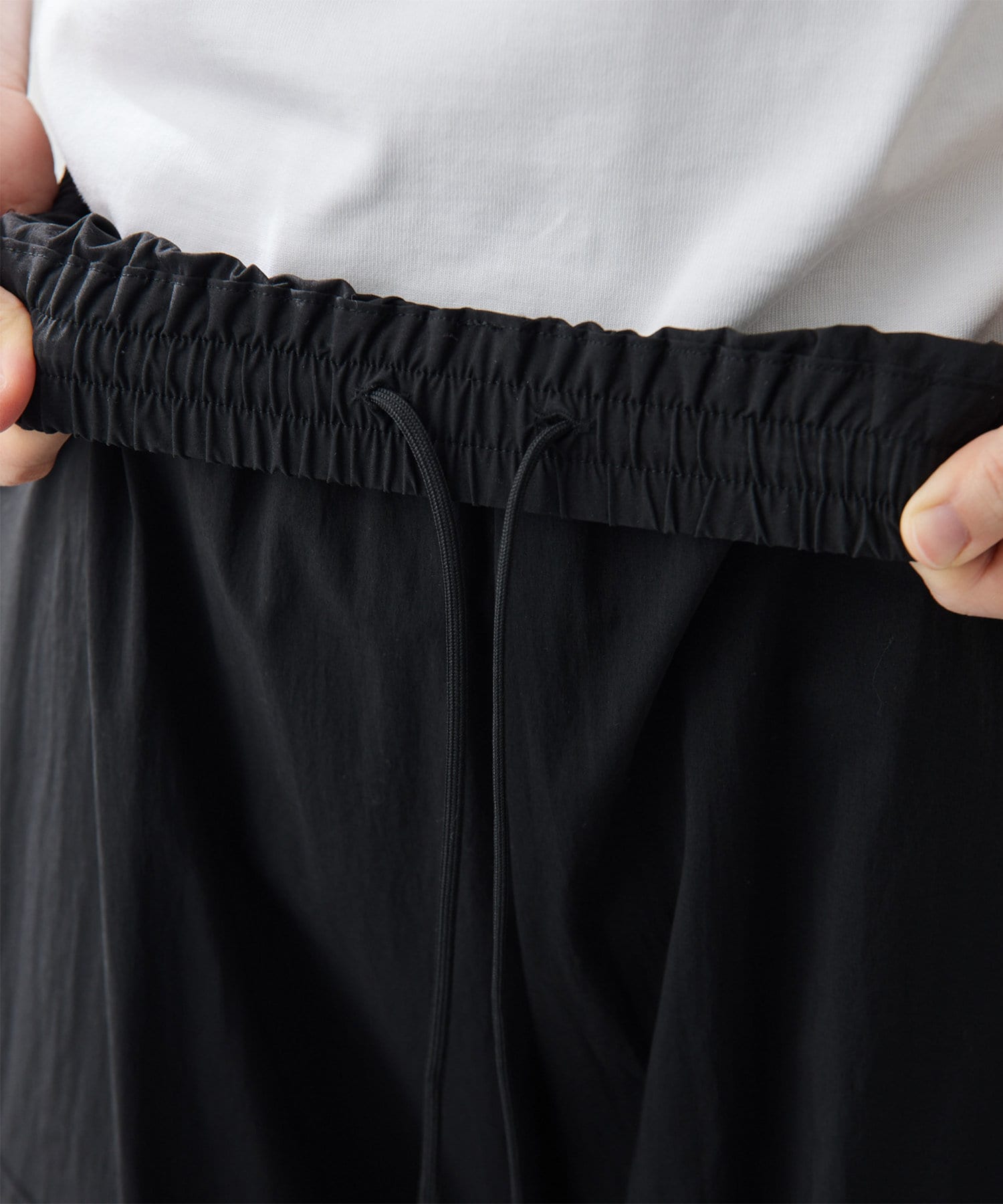 ■薄手のナイロン素材でとても軽く、ウエストゴムのイージーな履き心地が嬉しい一枚。