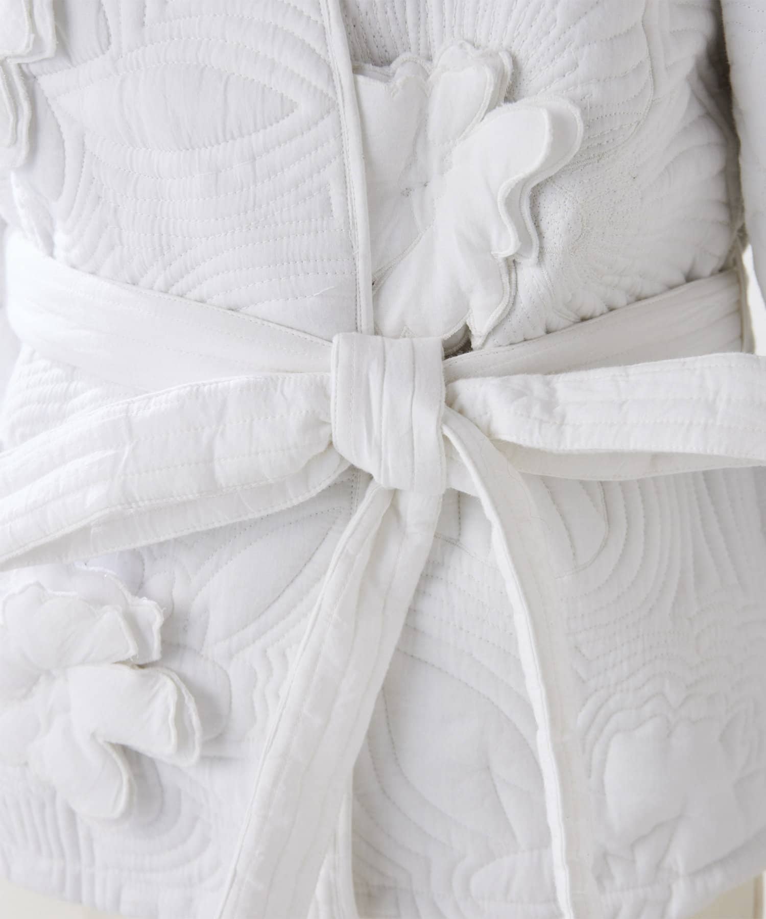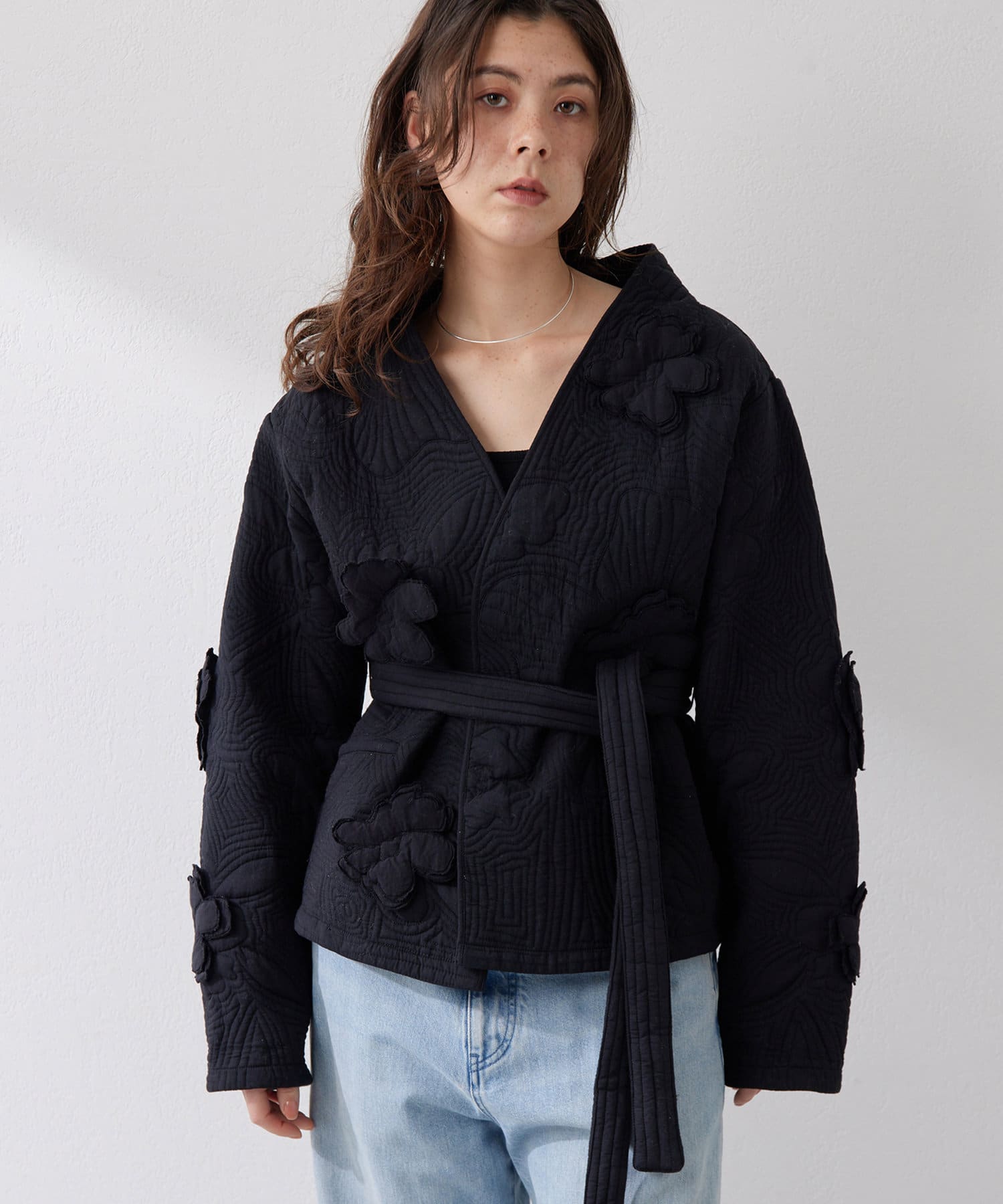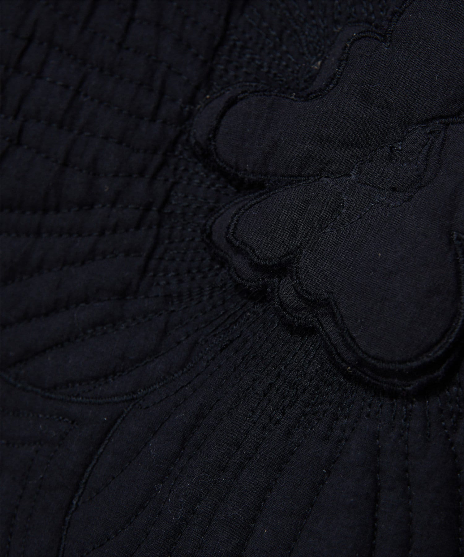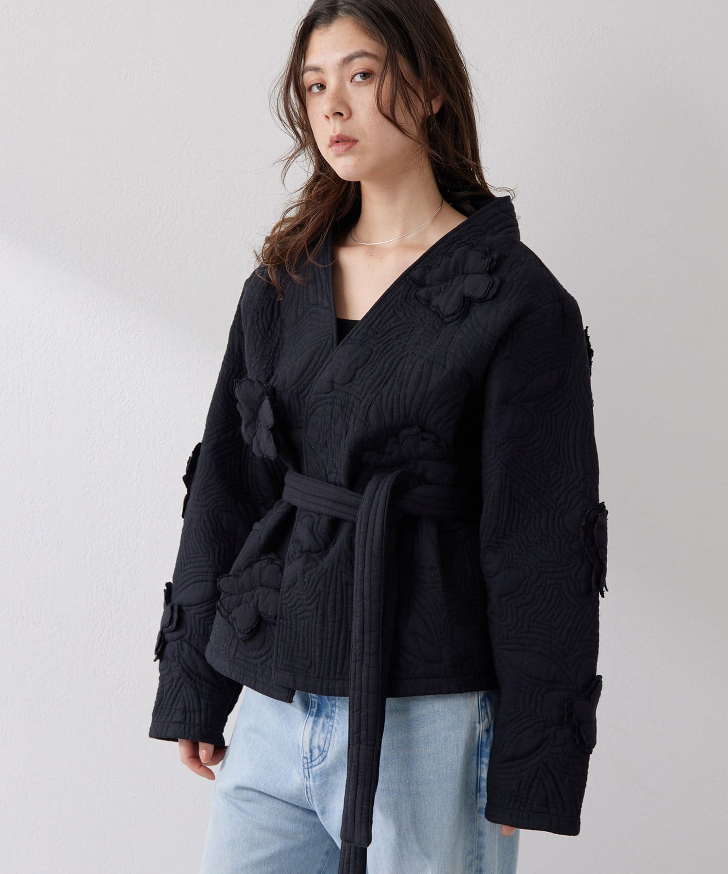 表地と裏地にインド綿を使用し、本体と袖の全体に花柄のキルティングの機械刺繍を入れた生地。