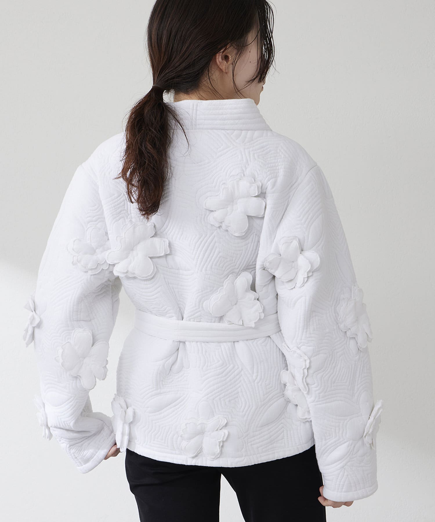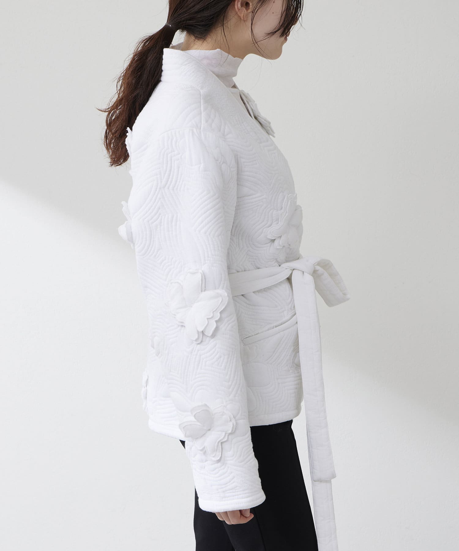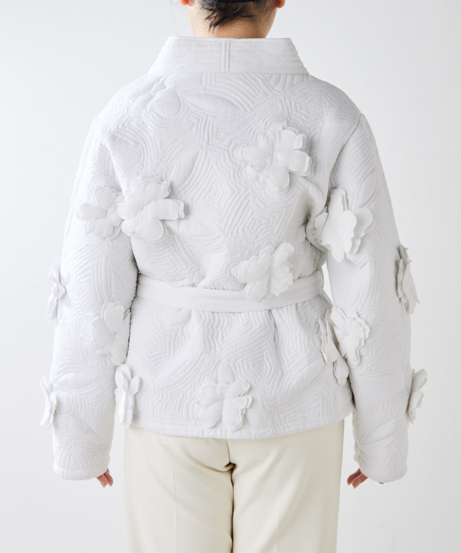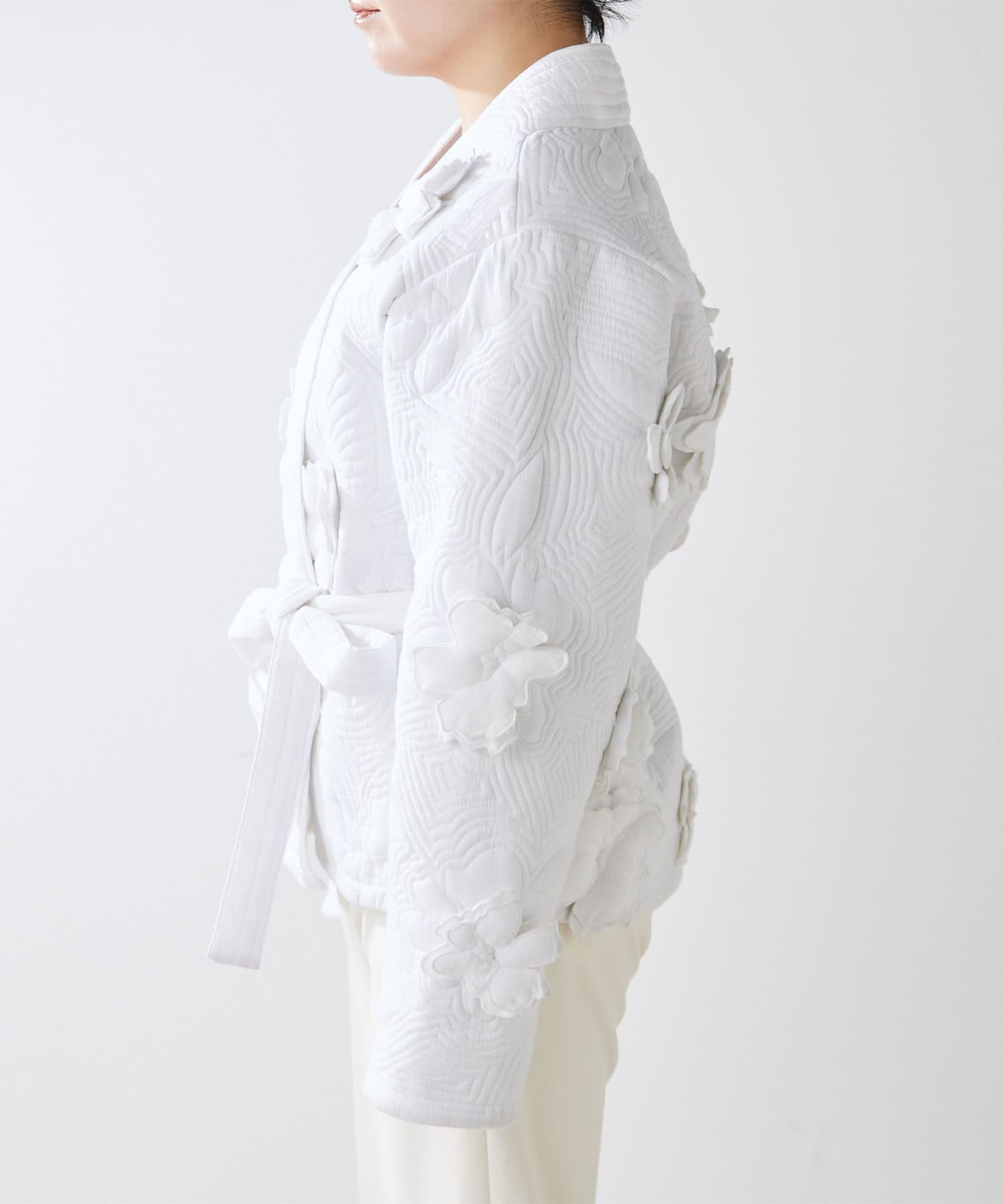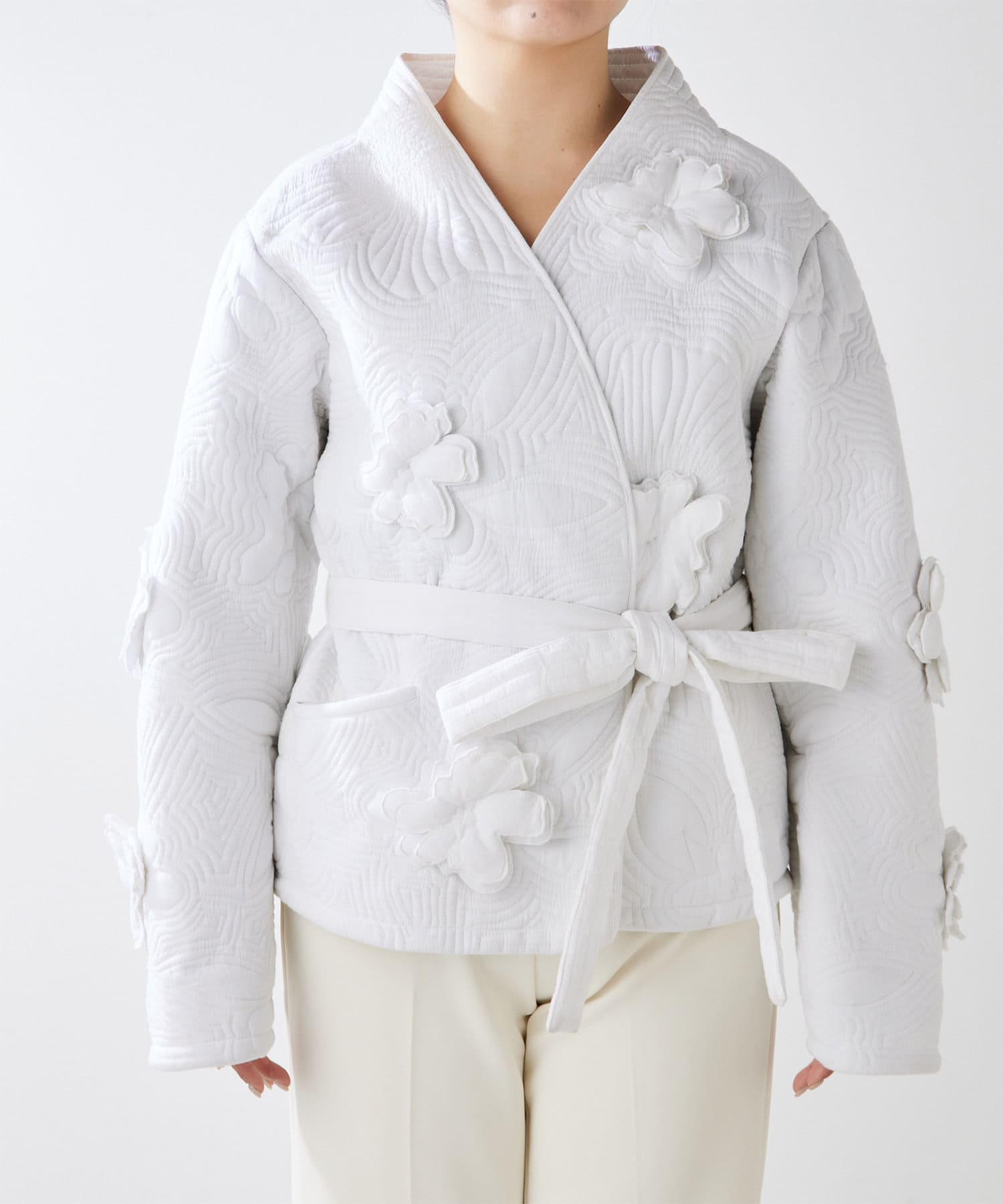 表地と裏地にインド綿を使用し、本体と袖の全体に花柄のキルティングの機械刺繍を入れた生地。