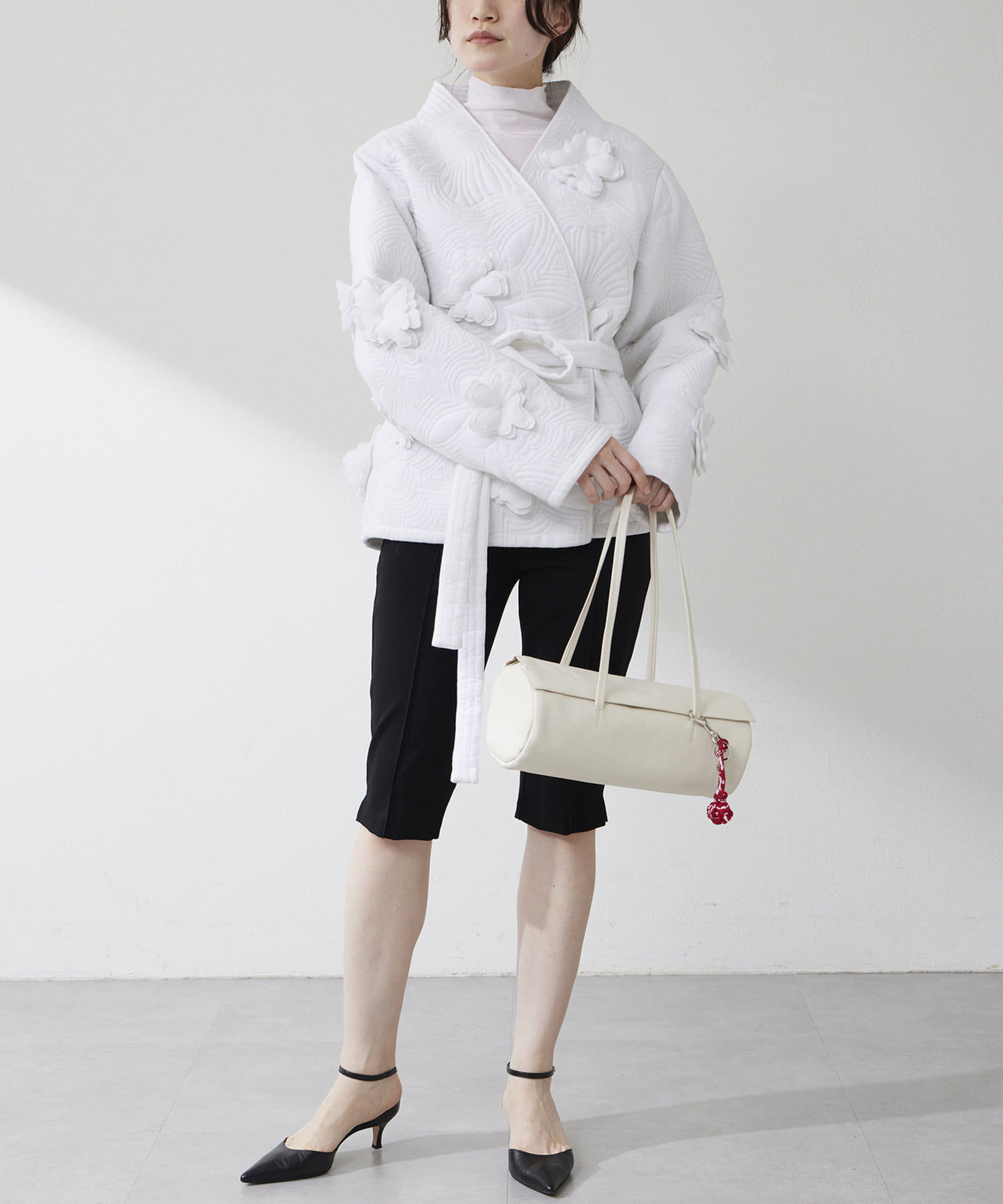■薄い中綿でフォルムを出し、手作業で付けたお花で表面に表情を出したデザイン。