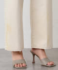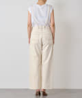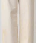 左右アシンメトリーに片足のみセンタープレスラインを日焼け加工で付けており、畳んだ状態での経年変化を表現。
