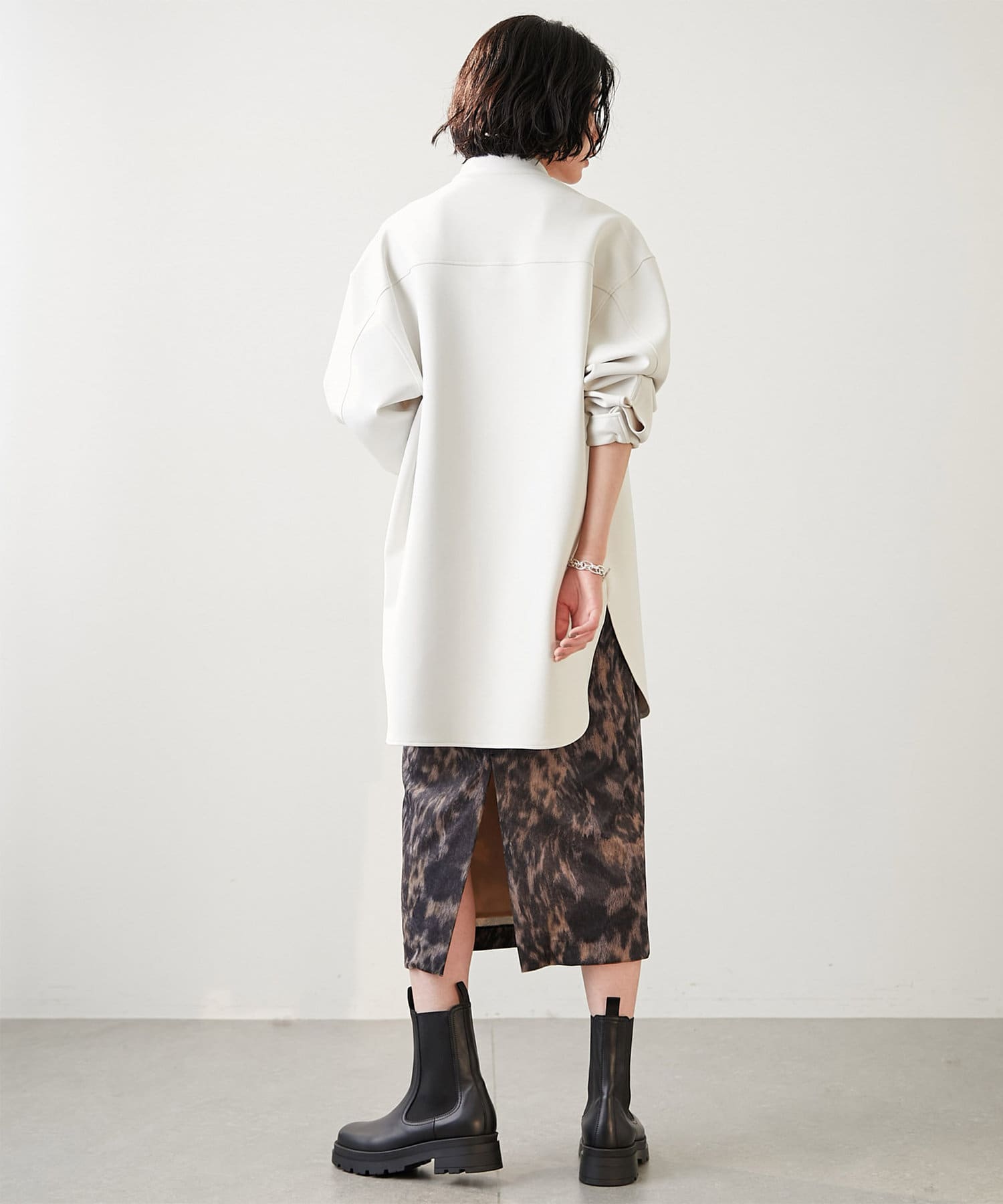 ストレッチ性のあるクラッシュベロア素材を使用し、表面の滑らかな毛羽立ちと優雅な光沢感が美しい一着です。