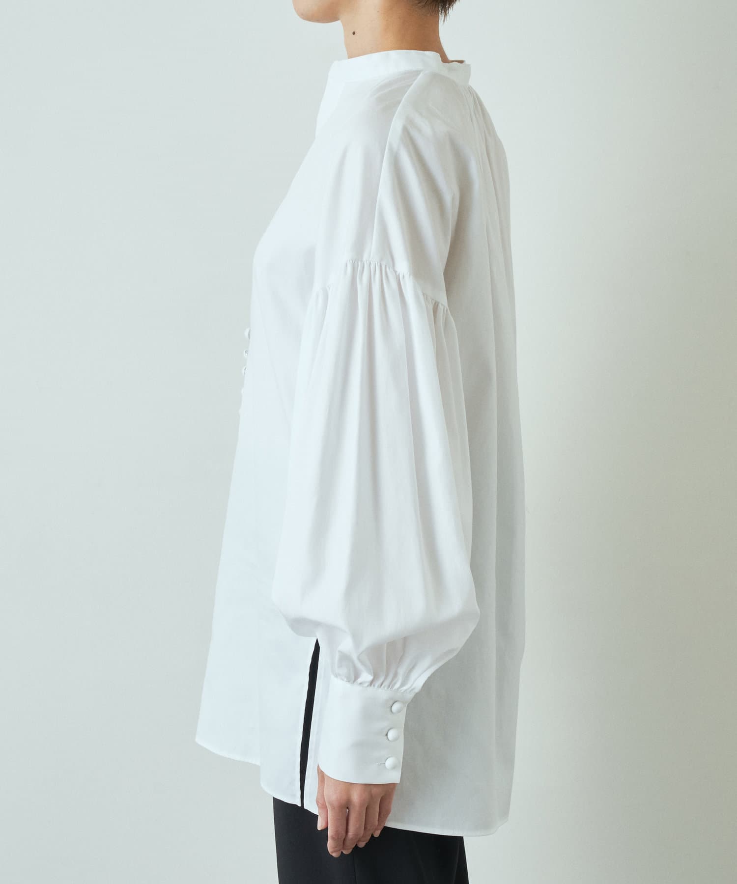 フロントやカフスにあしらわれたくるみボタンがさりげないアクセントで、袖のボリューム感と相まって一枚でも着映えるデザイン。