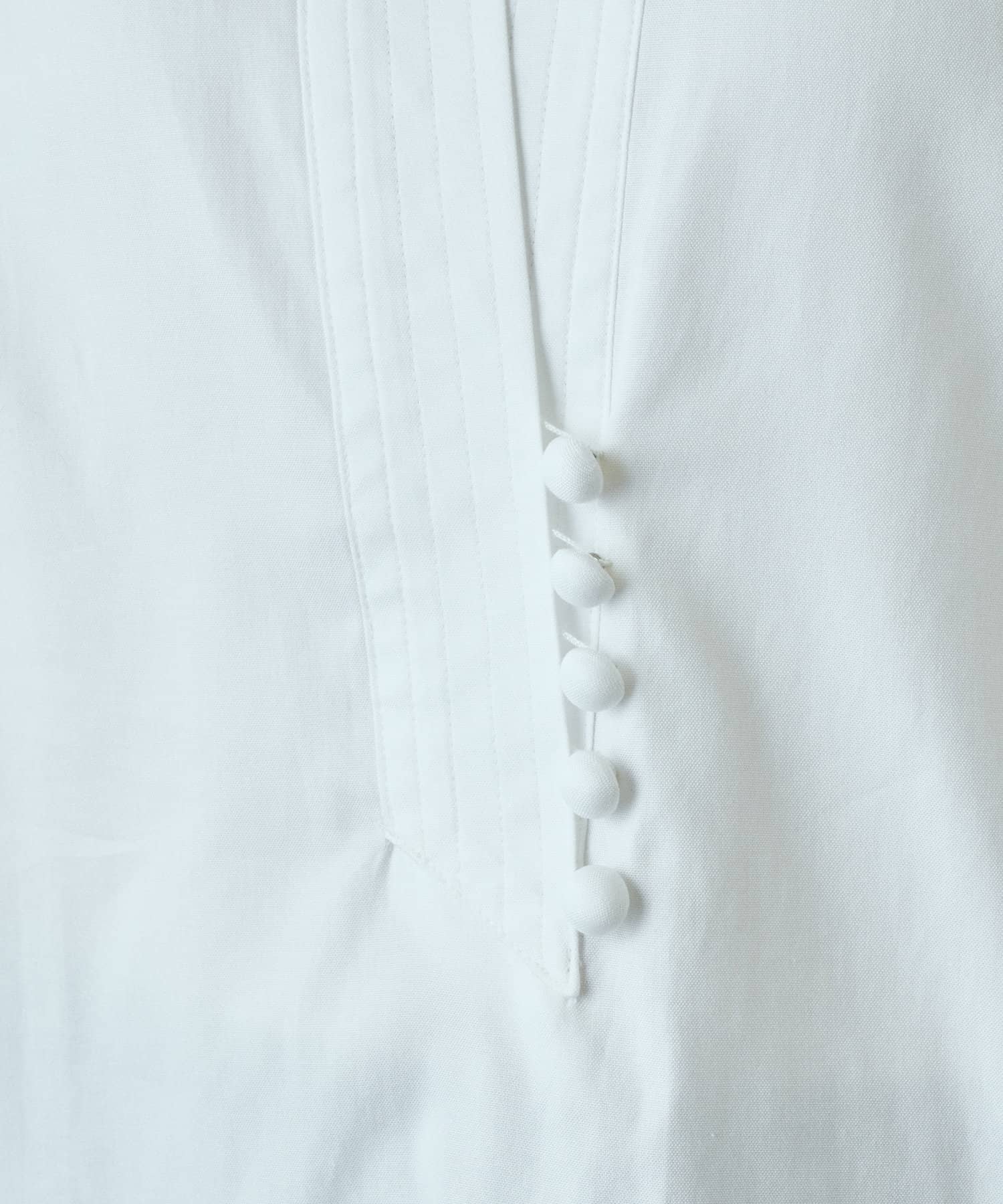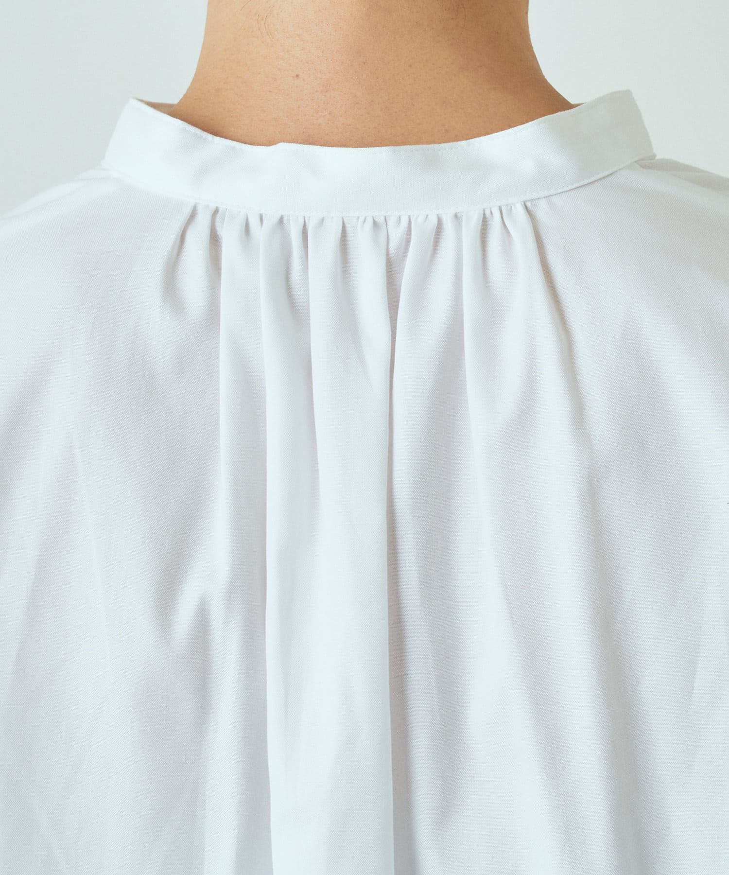 首元をすっきり見せてくれるスキッパーネックや、バックボディに施されたギャザーのディテールが女性らしさを演出してくれます。