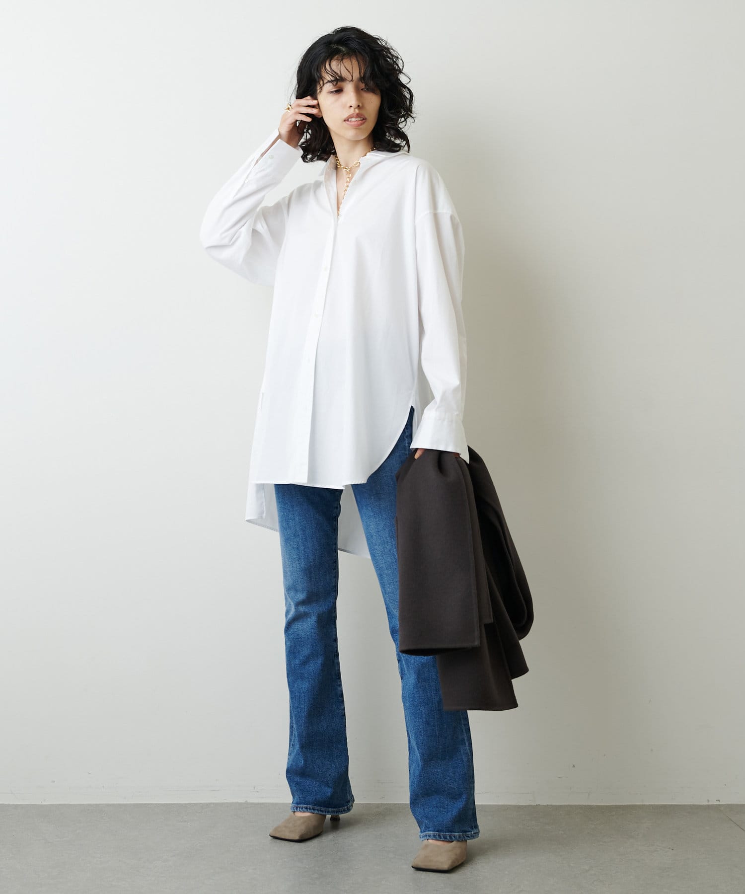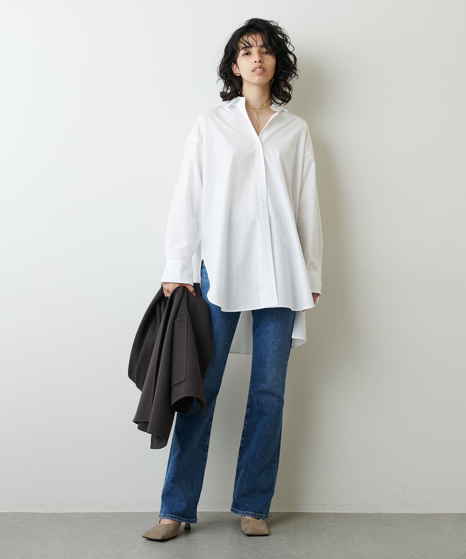 一枚での着用はもちろん、ニットやカットソー、ジャケットの中にも合わせやすく、着まわし力も抜群です。