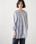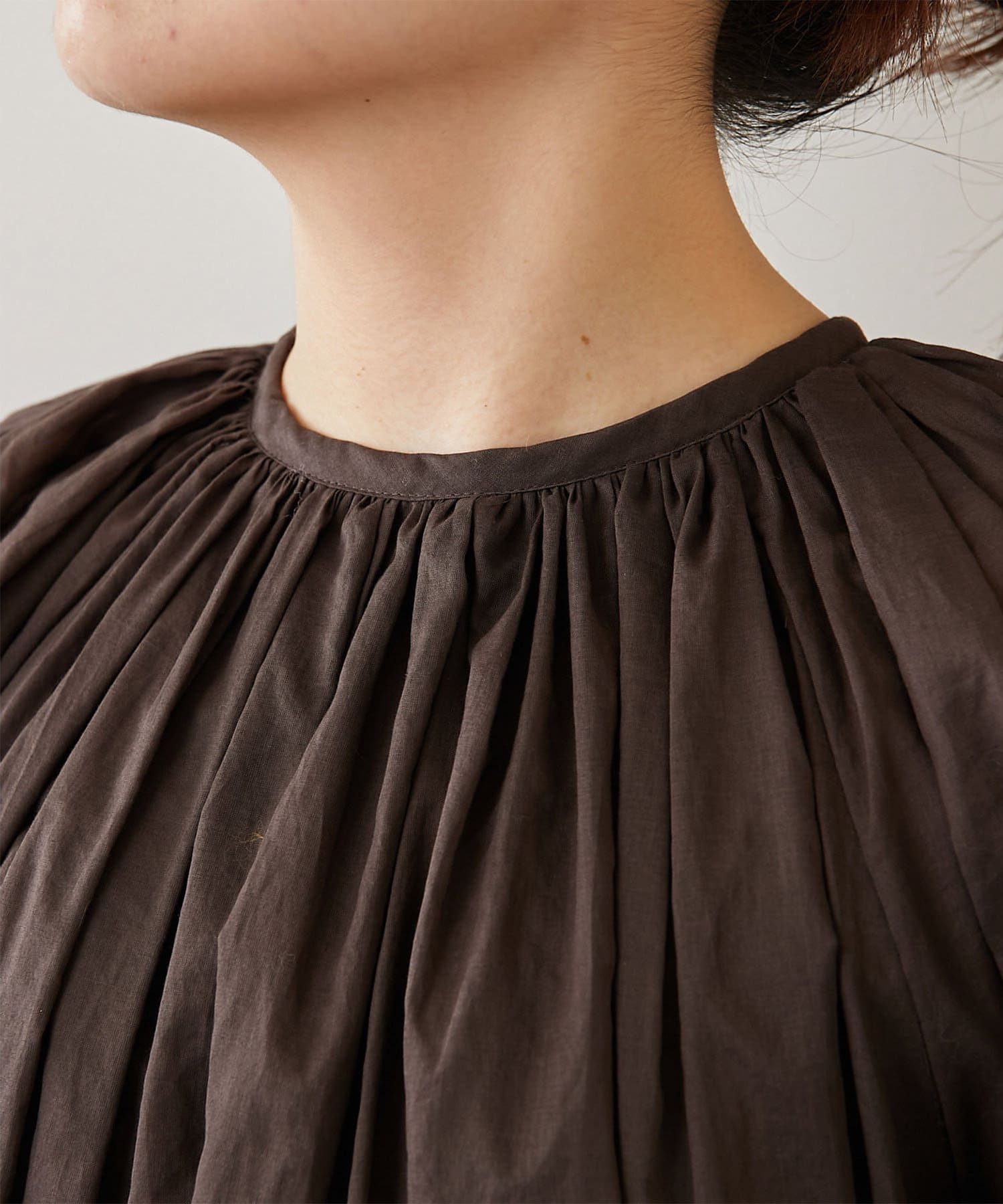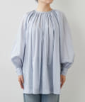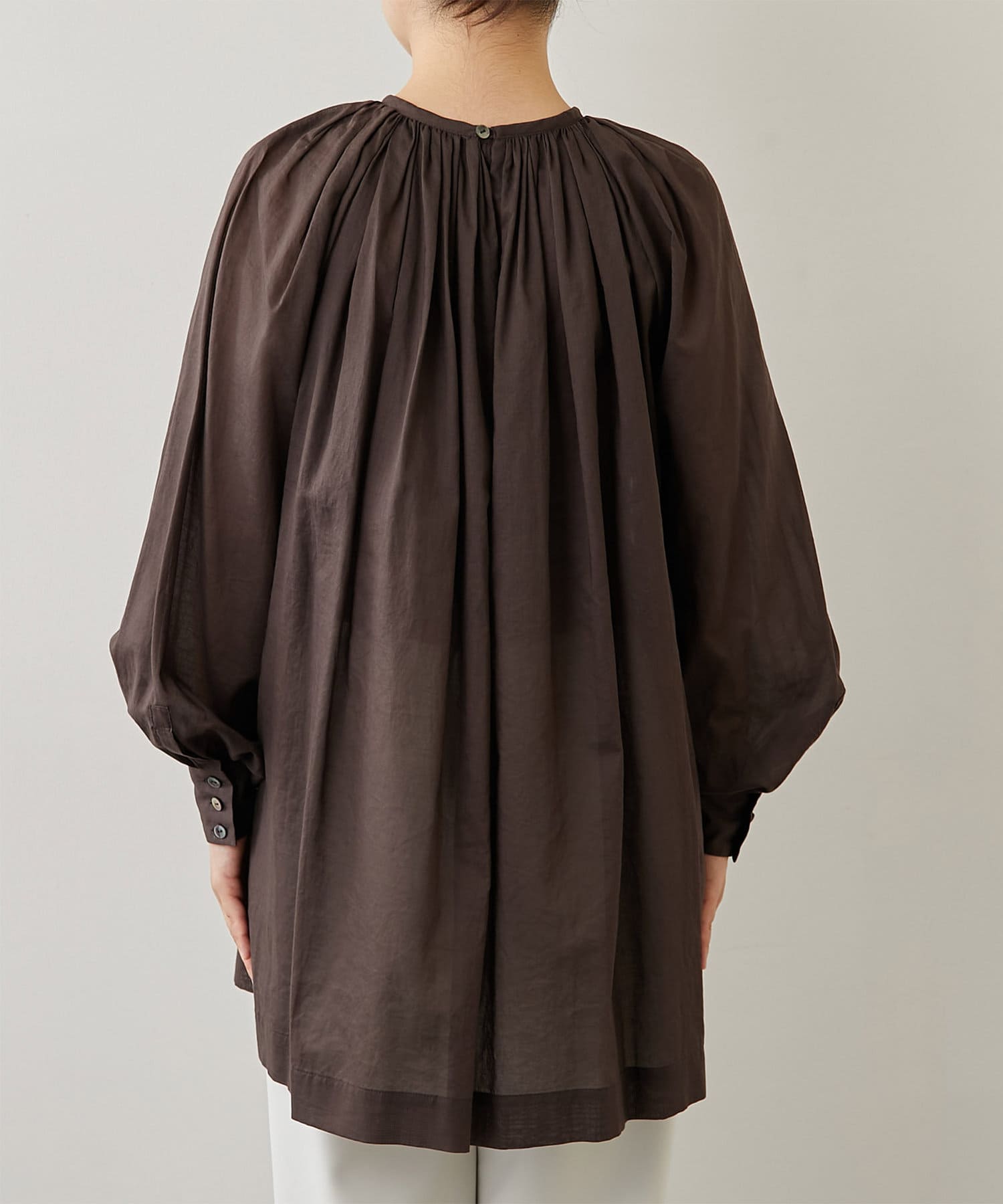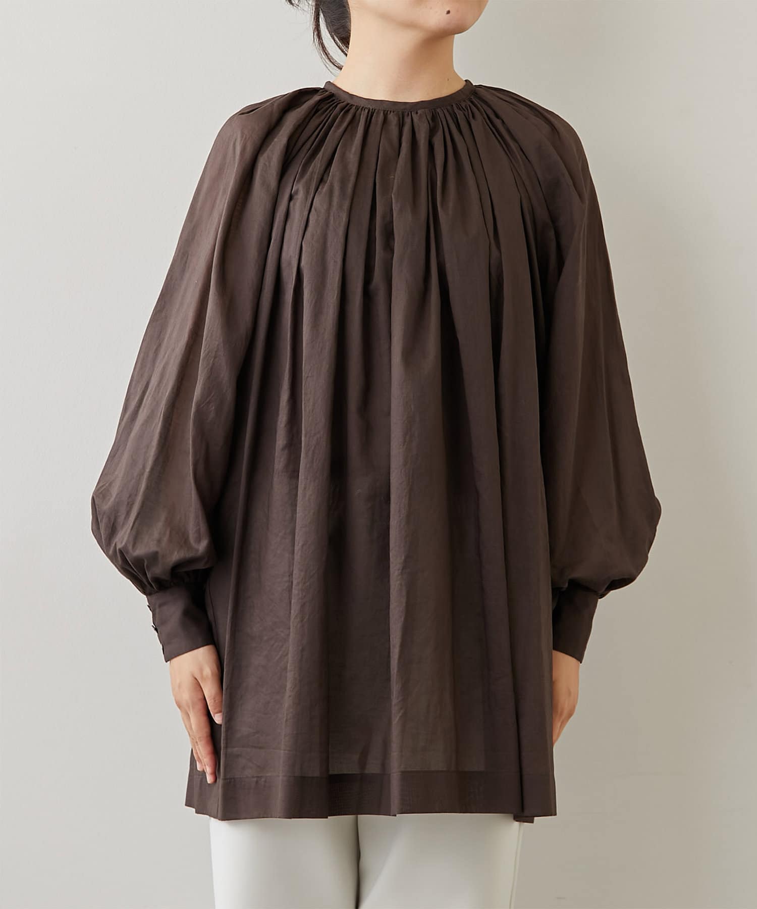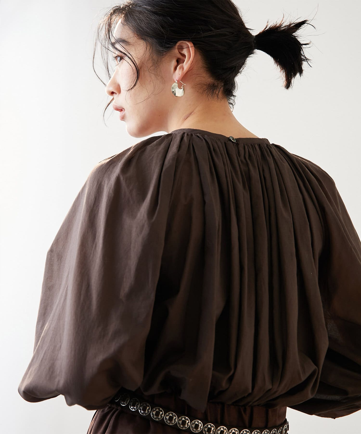コットン100%の透け感あるシフォン素材を使用したボリュームギャザーブラウス。