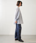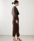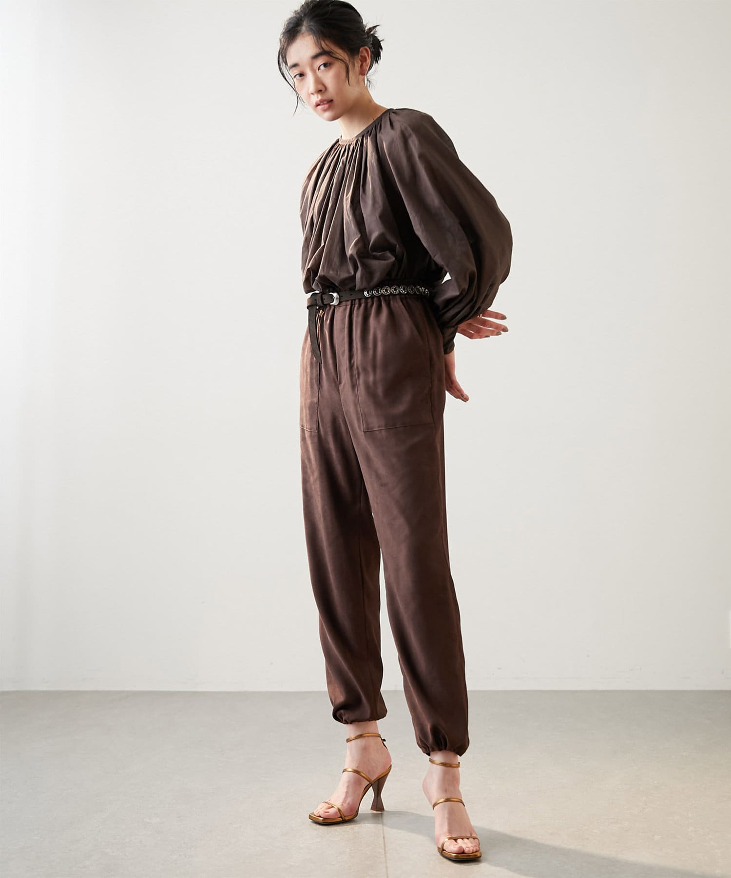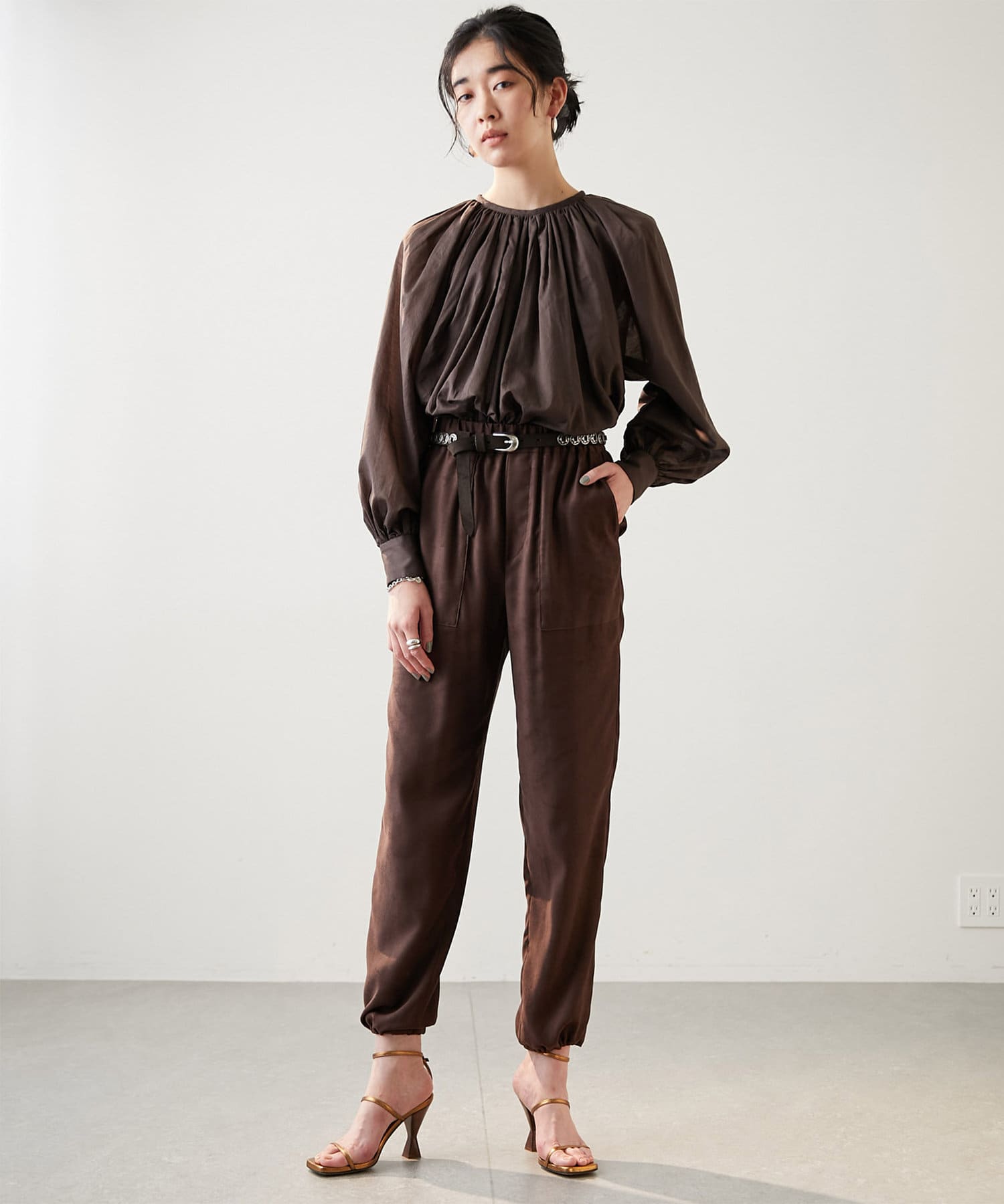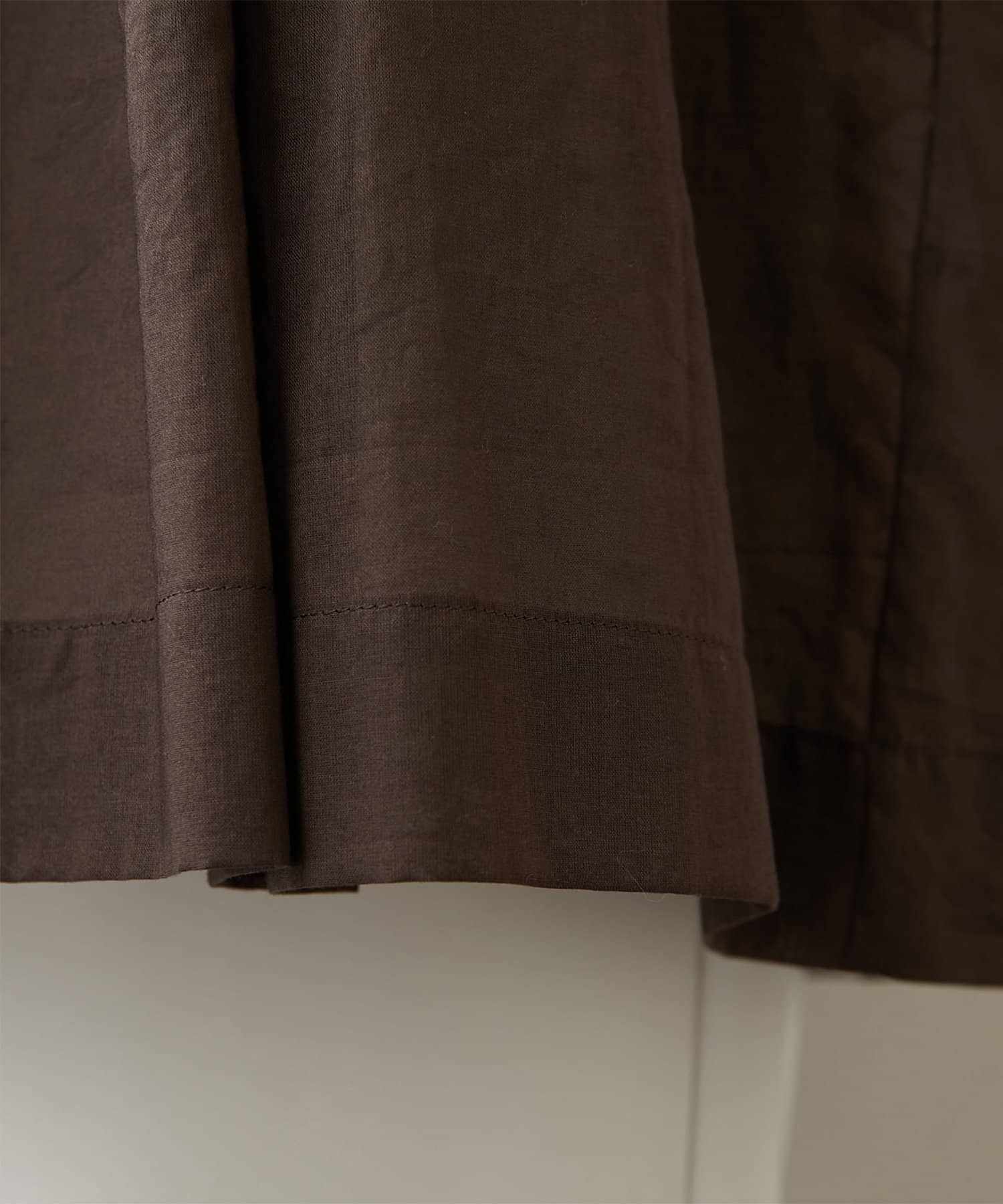 柔らかい素材なのでギャザーのボリュームが出すぎず、トップスイン、アウトどちらでもきれいなシルエットで着ていただけます。