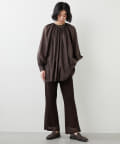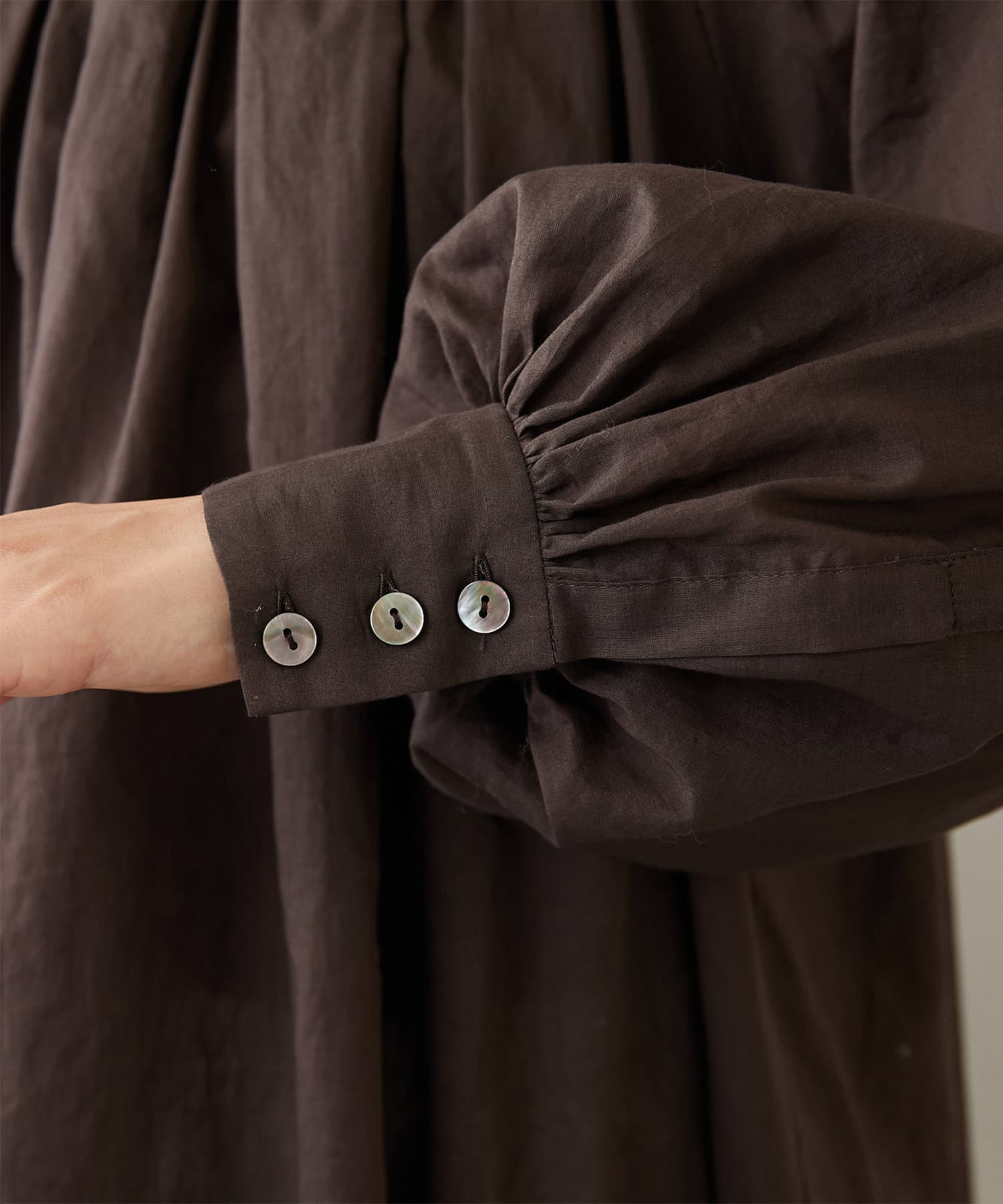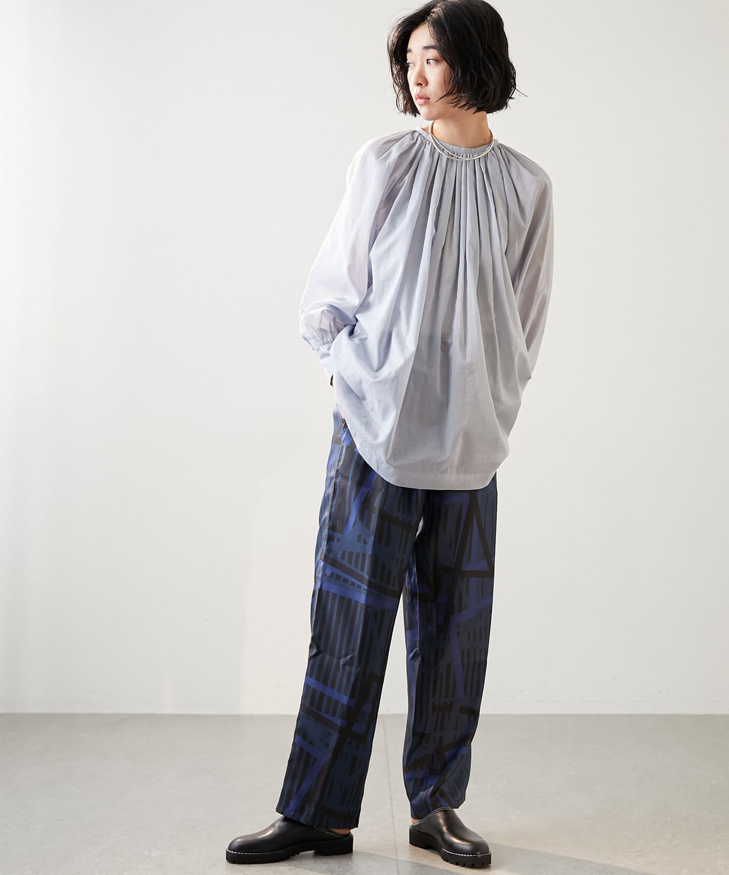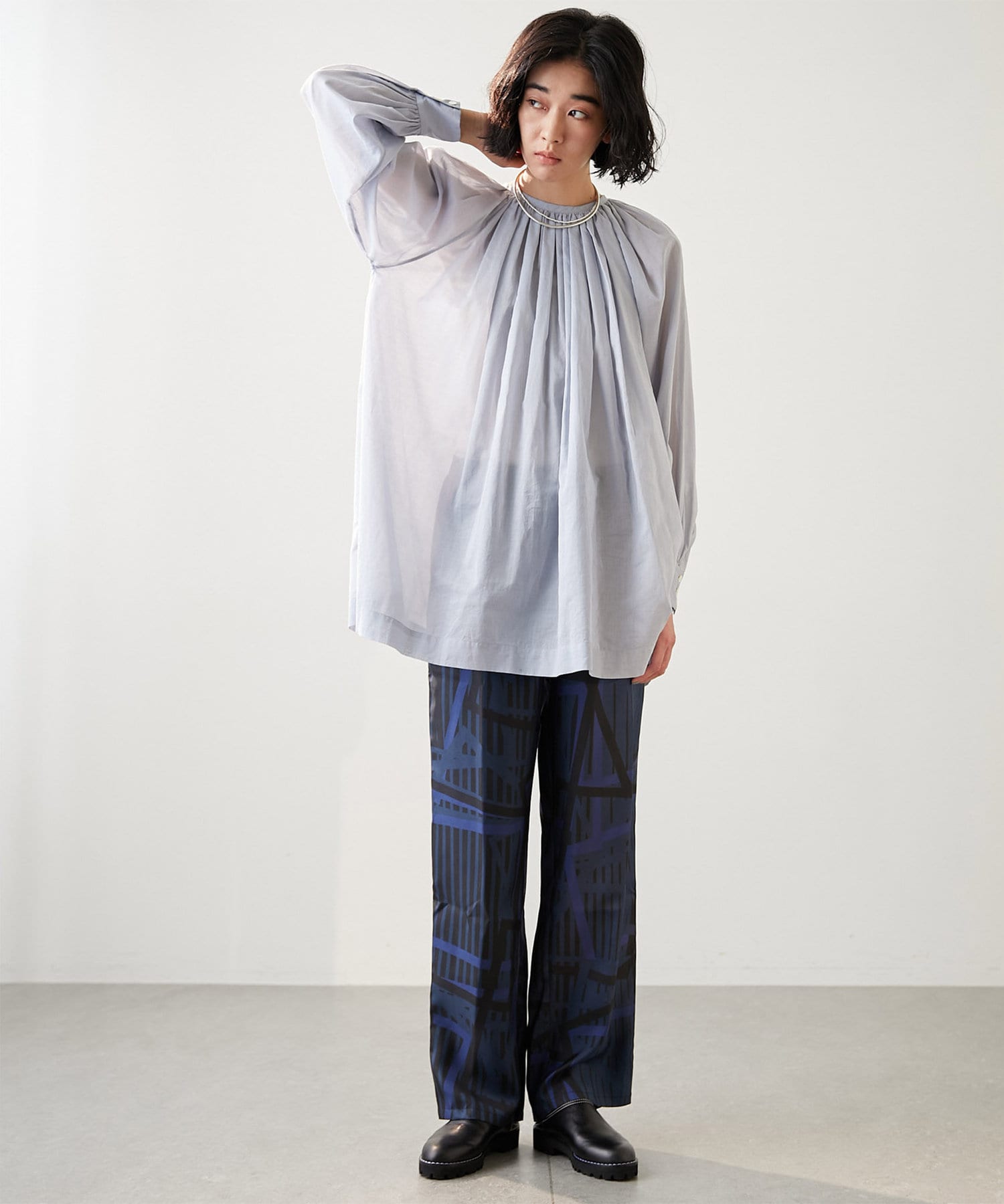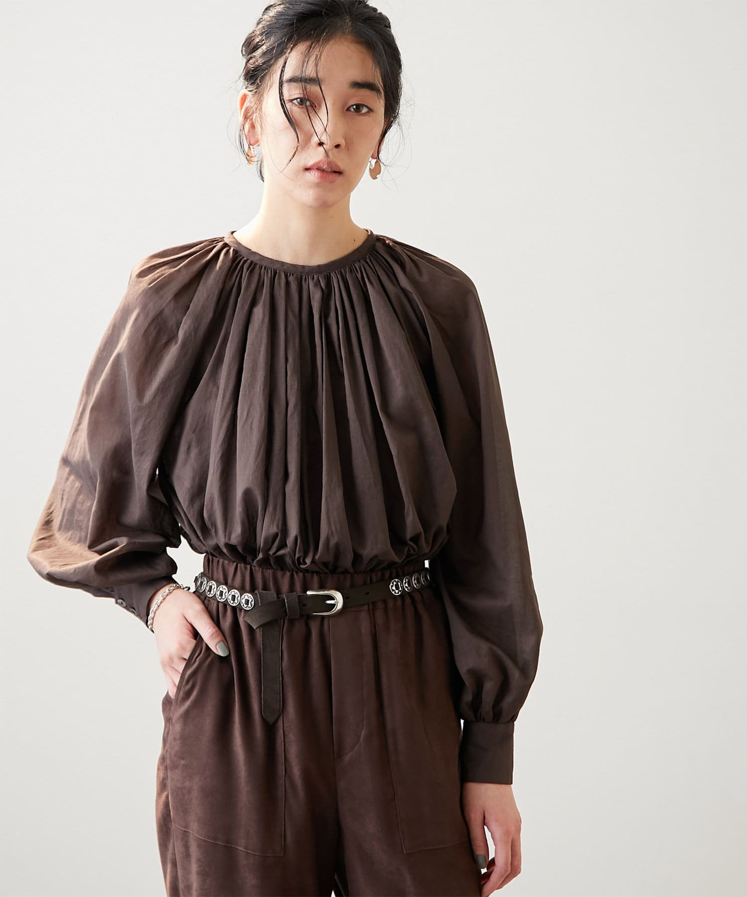 首元と袖口にたっぷりと入ったギャザーがフェミニンさを感じさせつつも、ロングカフスですっきりと仕上げてメリハリをつけました。