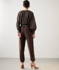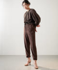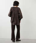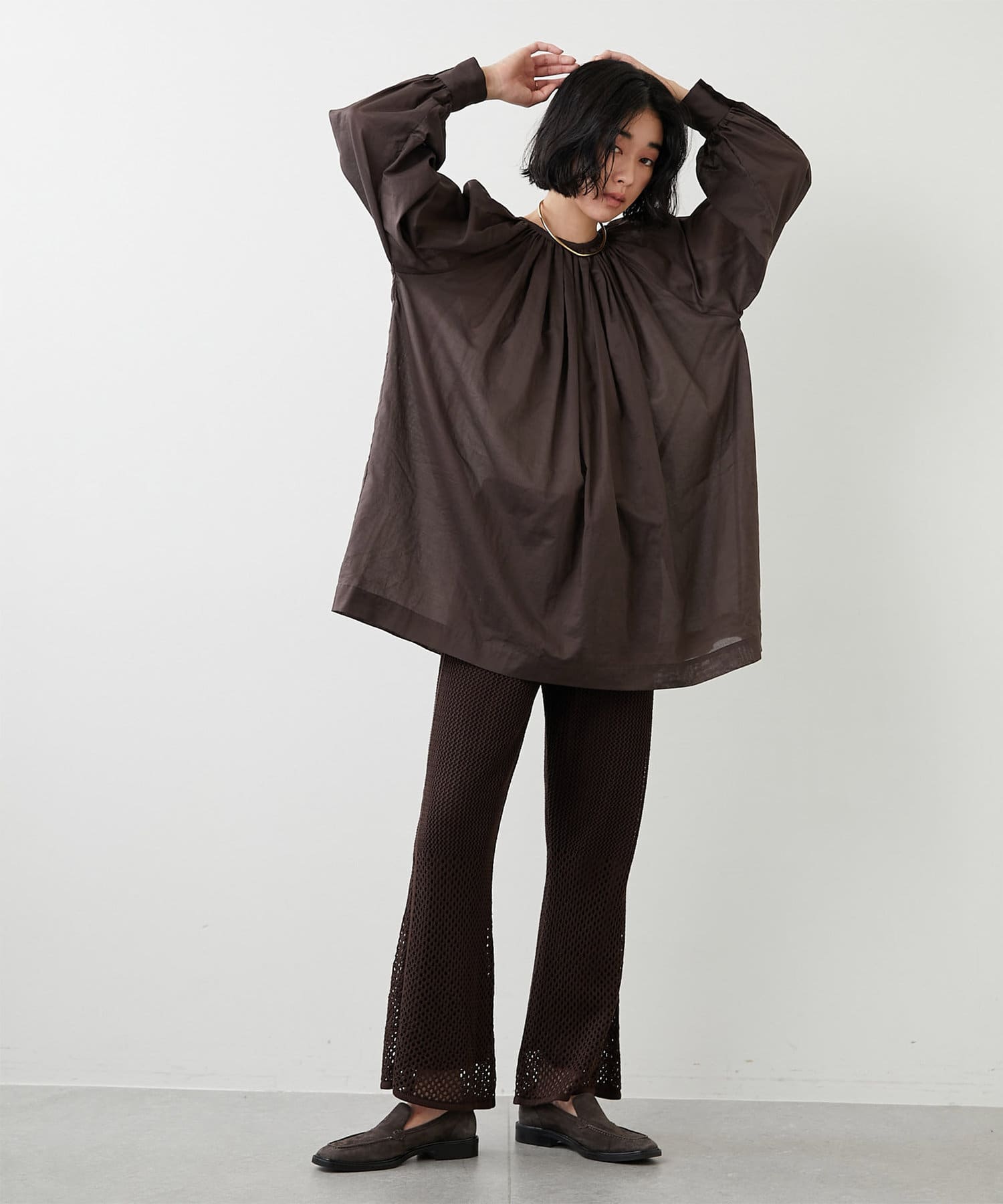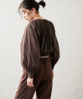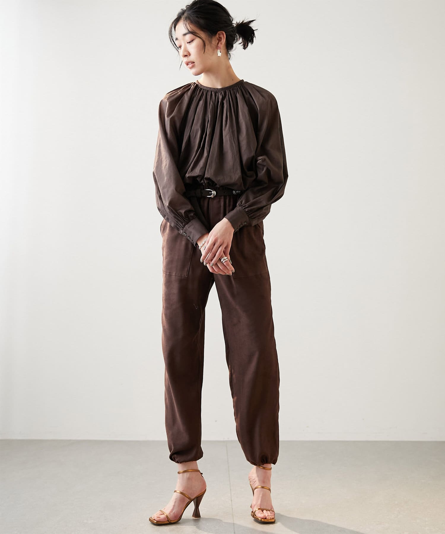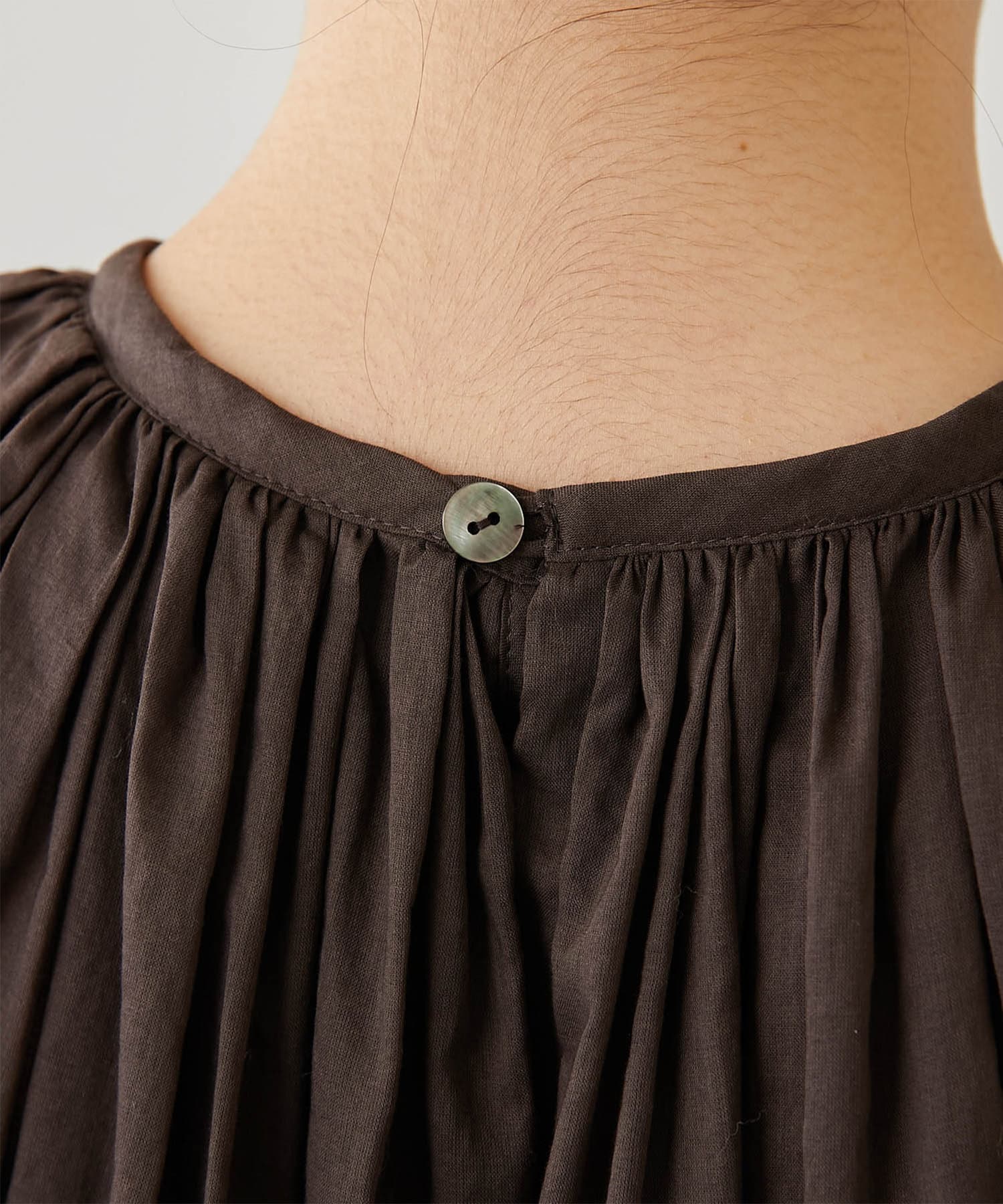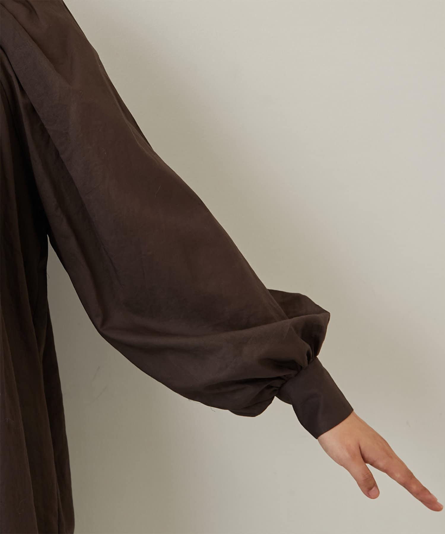 首元と袖口にたっぷりと入ったギャザーがフェミニンさを感じさせつつも、ロングカフスですっきりと仕上げてメリハリをつけました。
