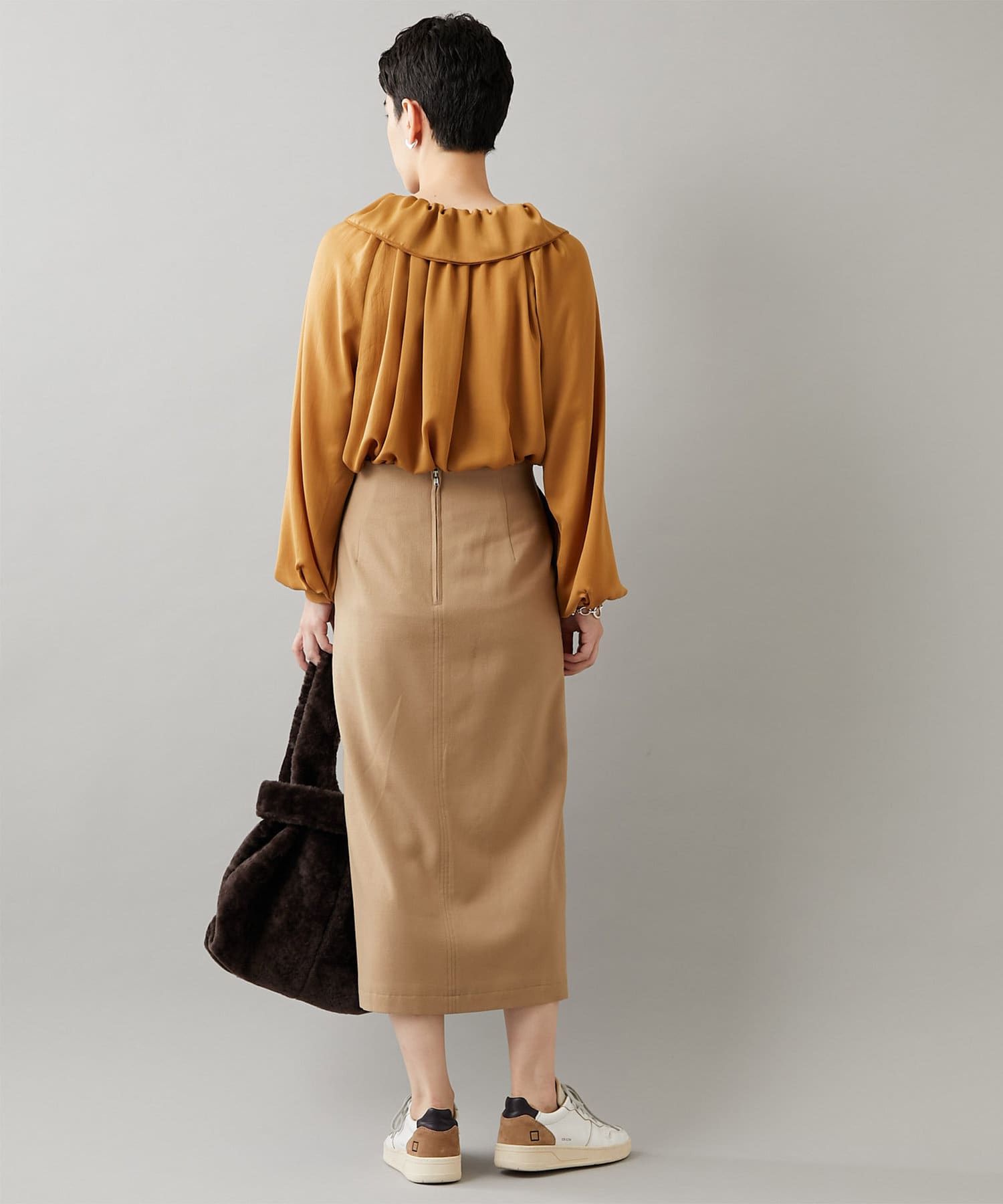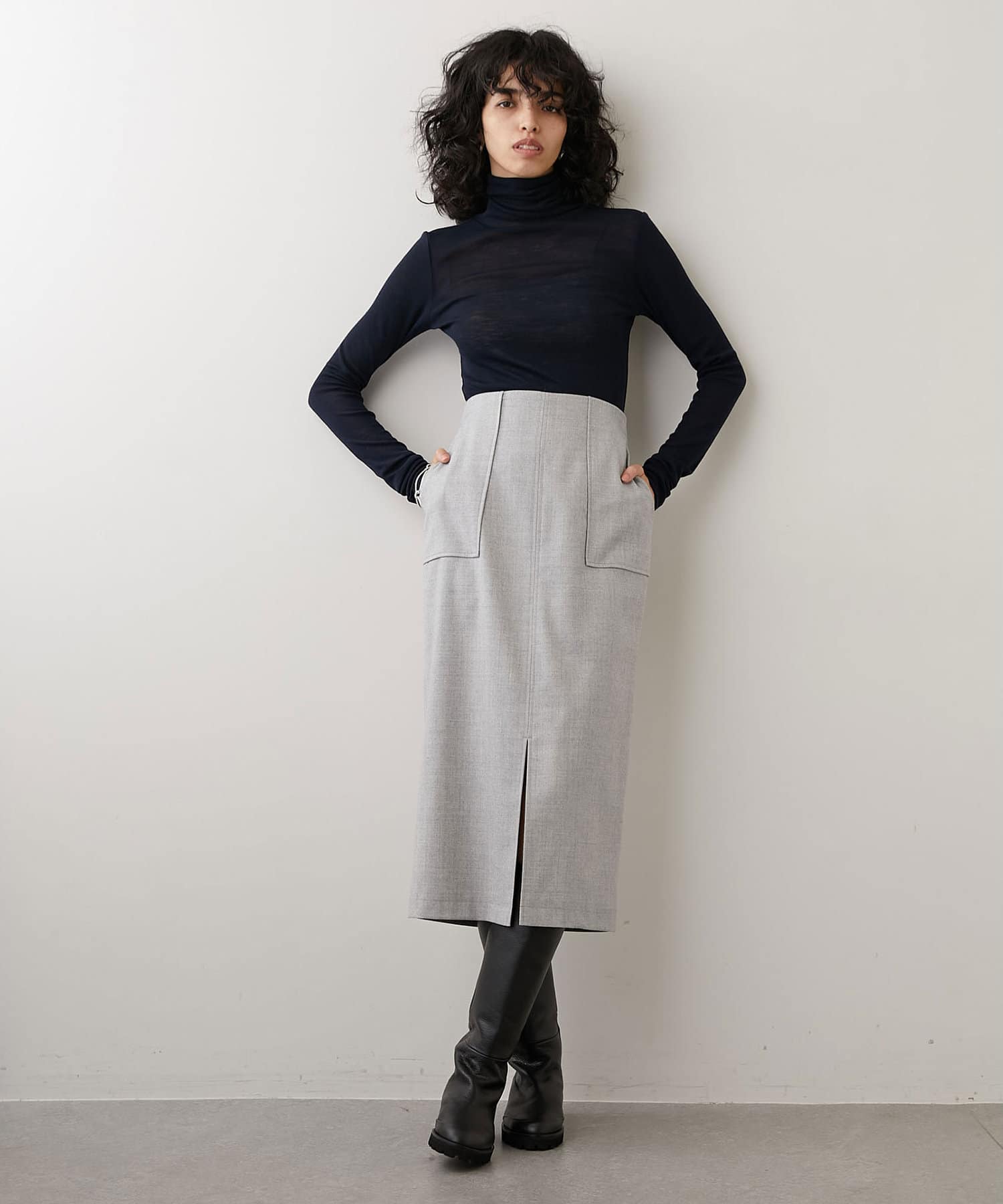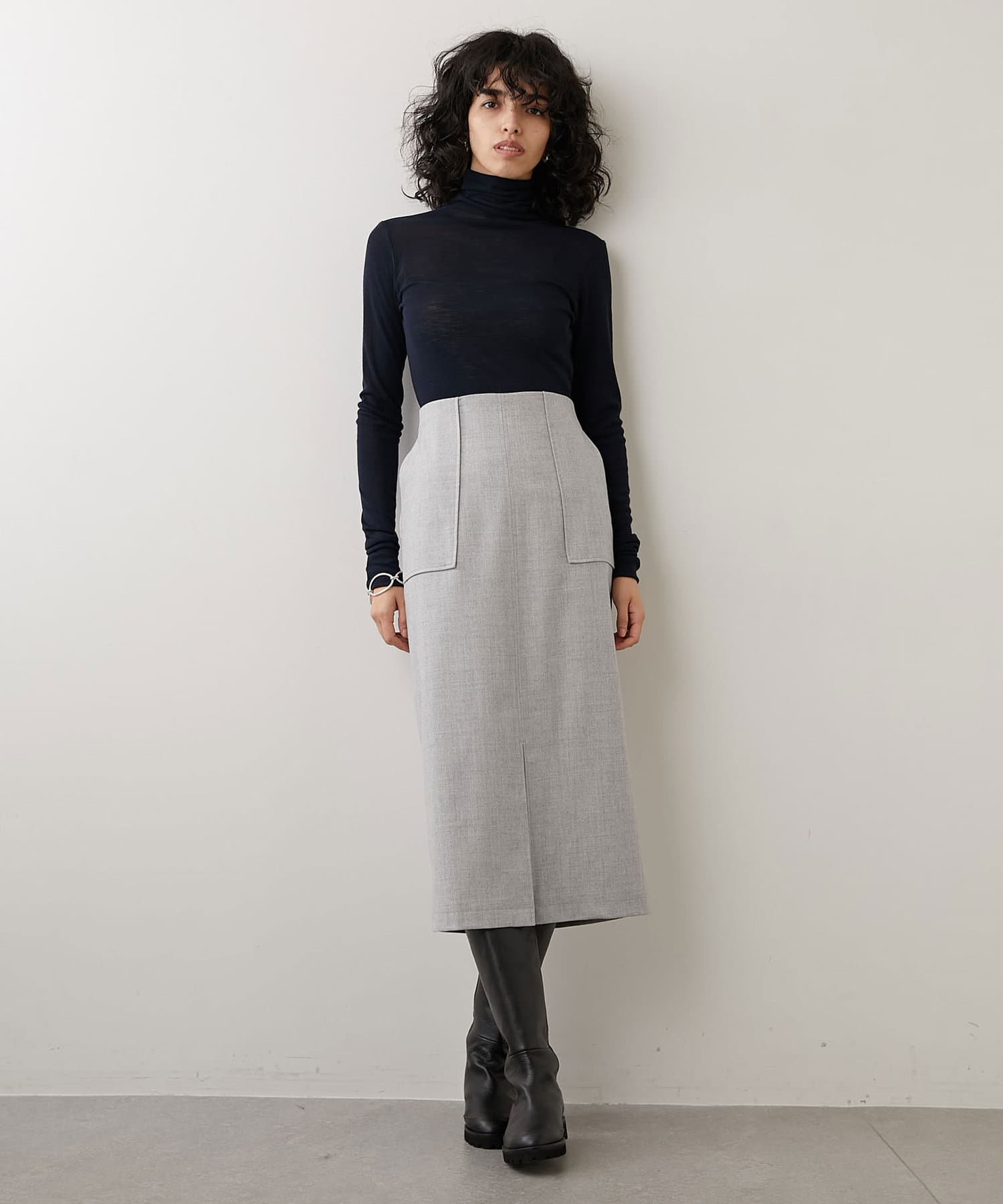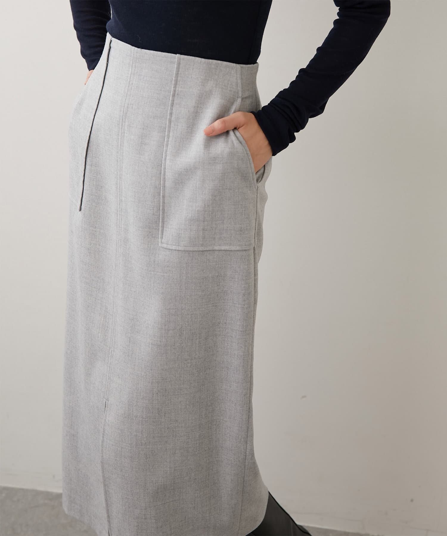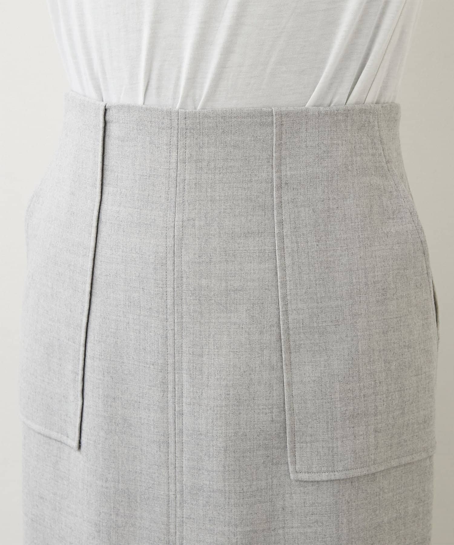 ウエスト周りはすっきりとさせつつ、程よい厚みのフラノ素材が身体のラインを拾いすぎず、美しいシルエットを演出します。