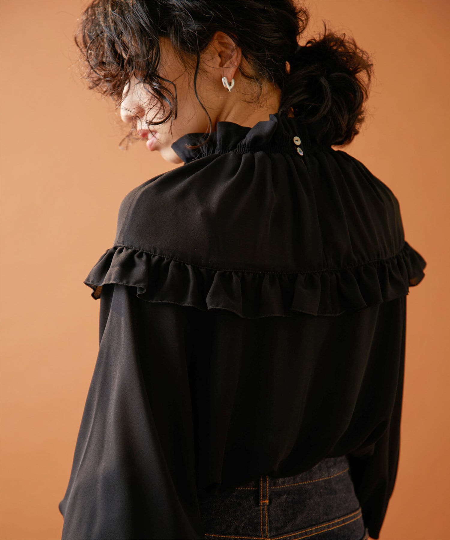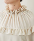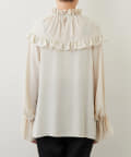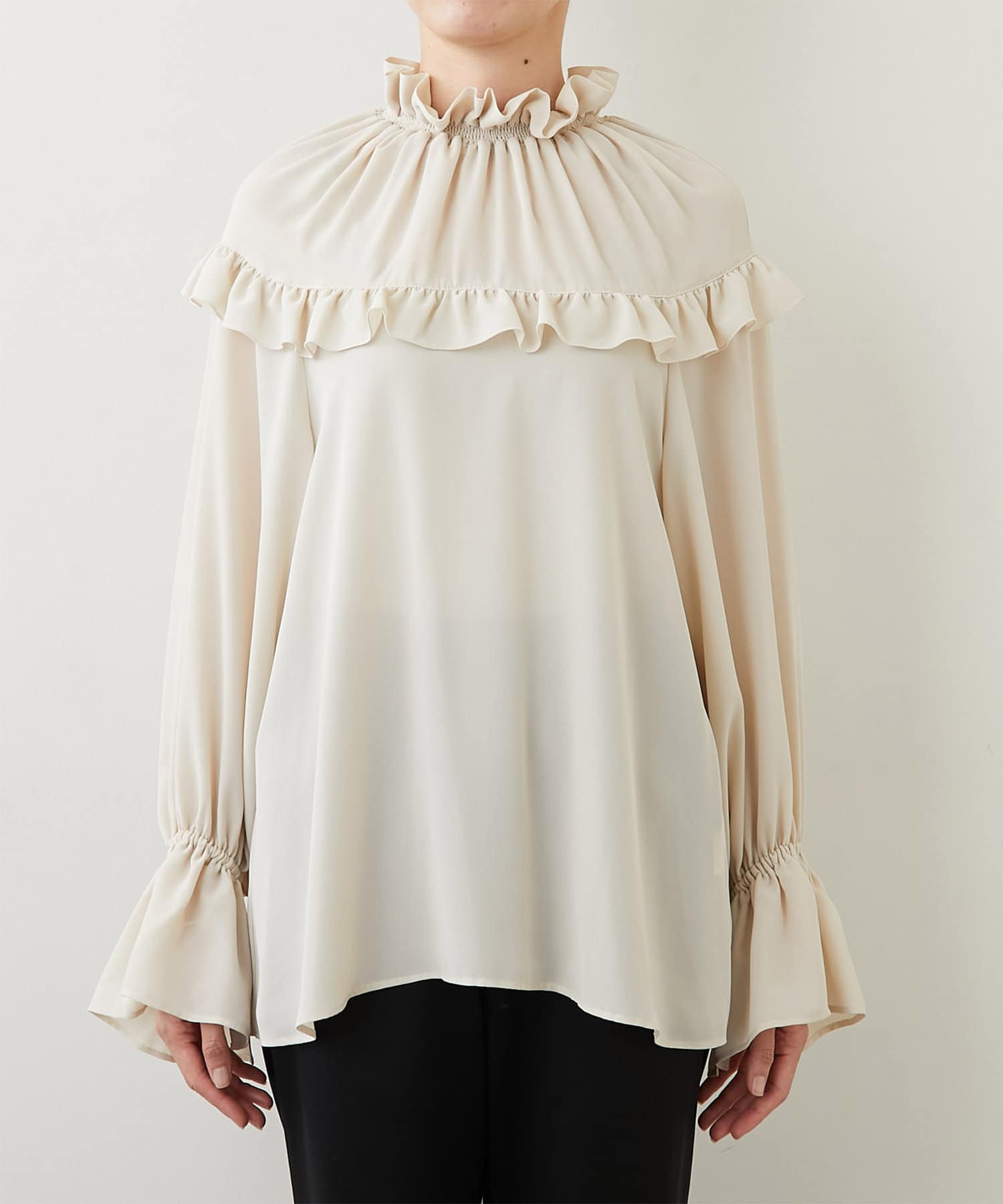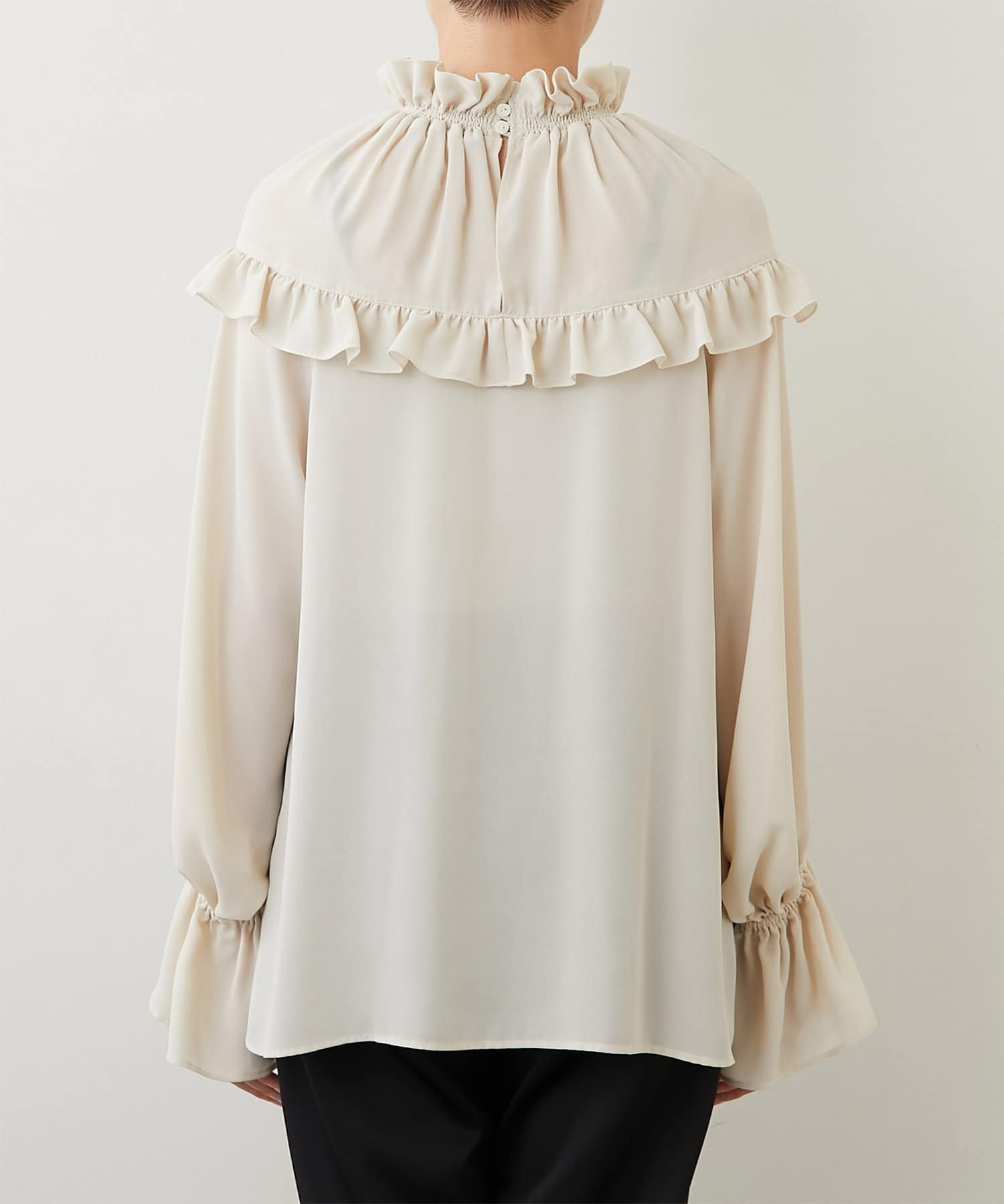 ネックから肩にかけて施されたギャザーフリルが目を惹くデザインブラウス。