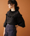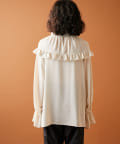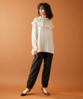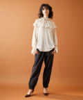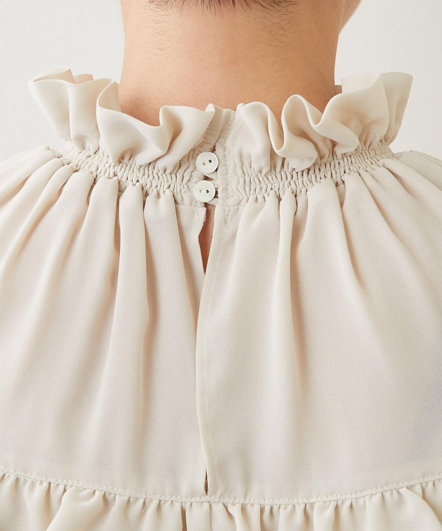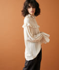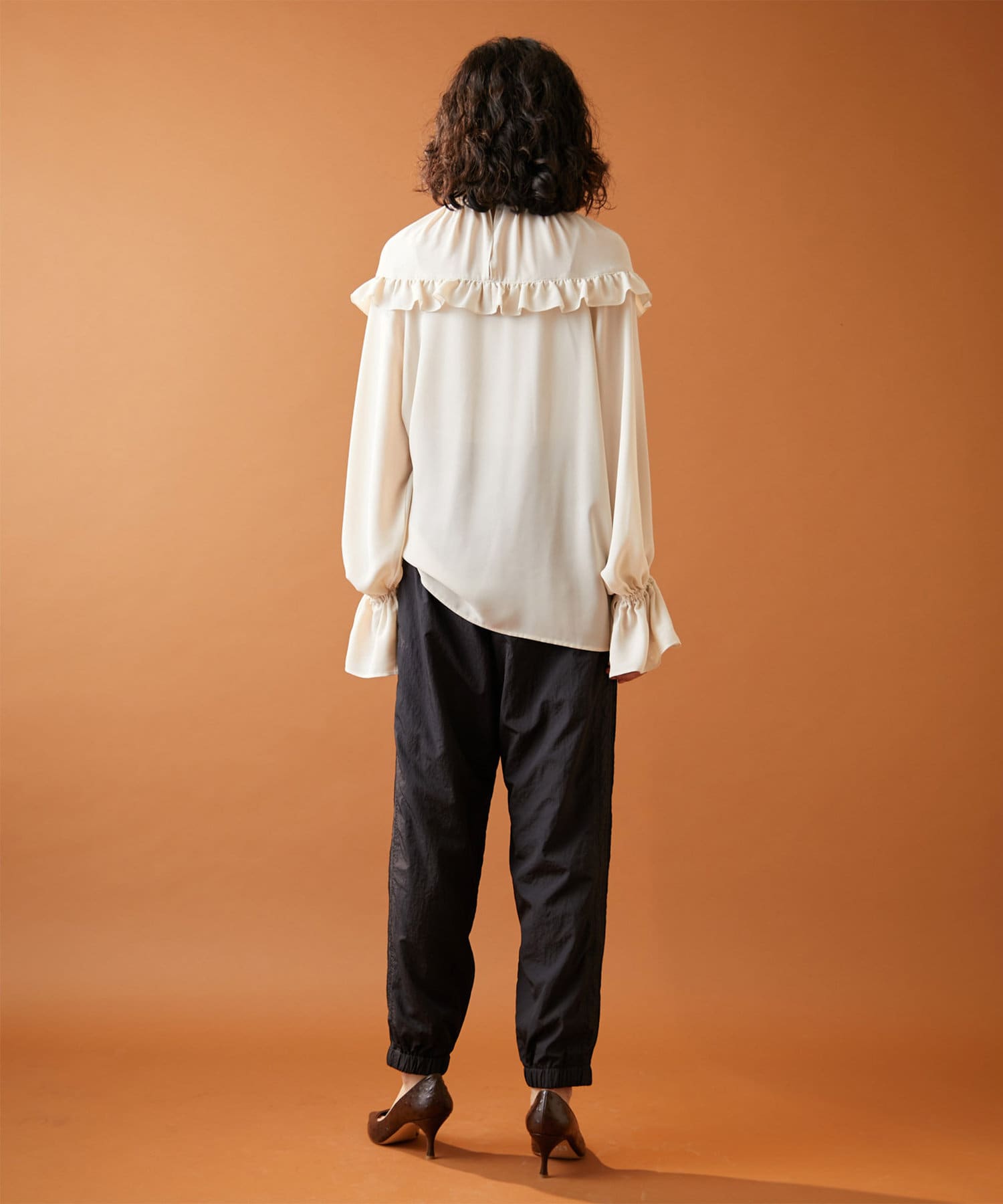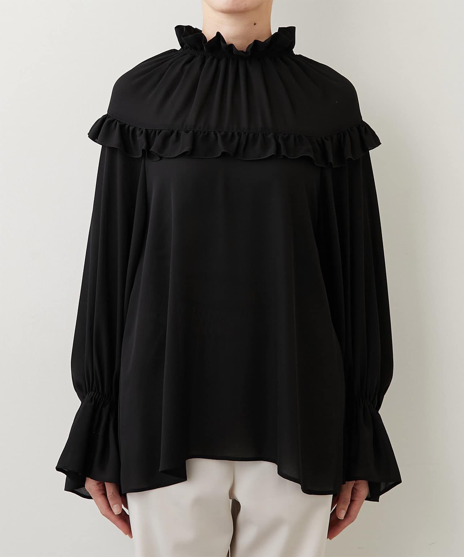 ネックから肩にかけて施されたギャザーフリルが目を惹くデザインブラウス。