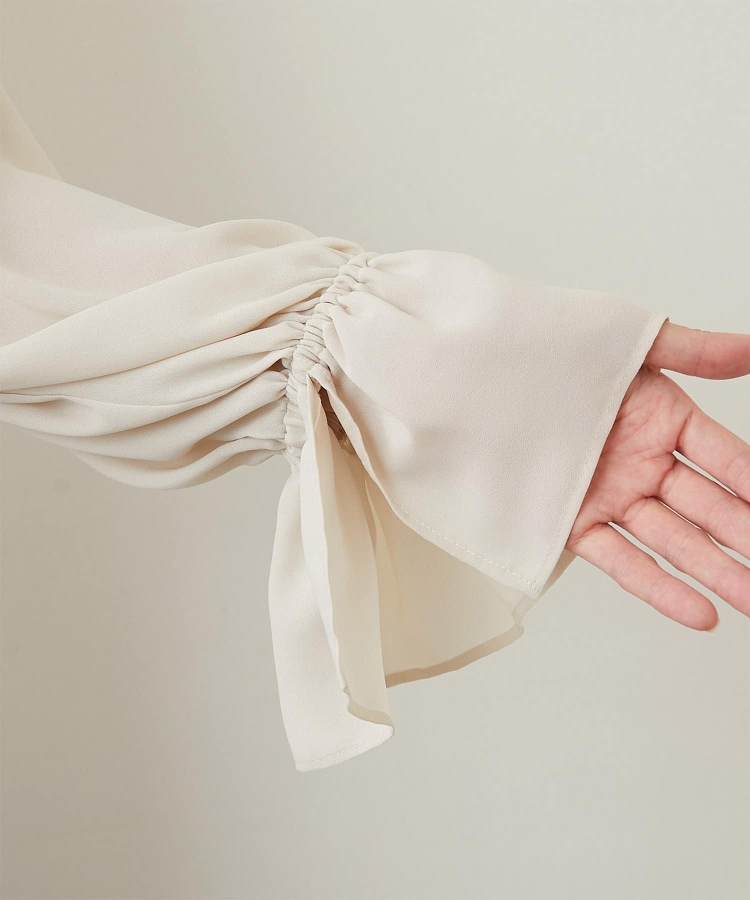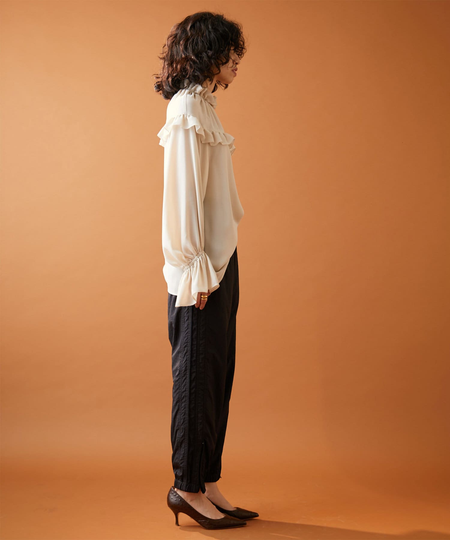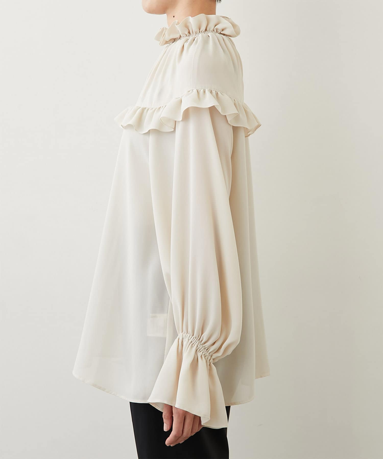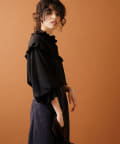 贅沢にギャザーを施したスタンドネック、肩周りに贅沢に施したフリルや袖口のギャザーディテールなどフェミニンな要素がたっぷり詰まった女性らしい一着。