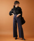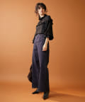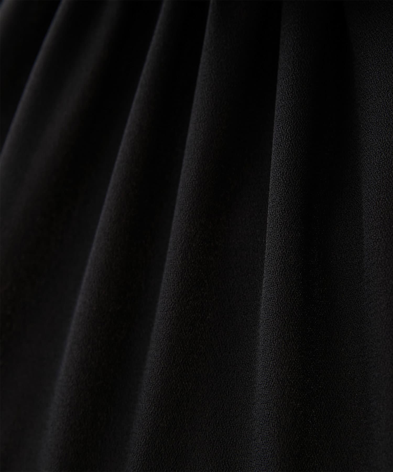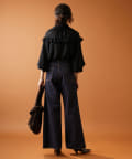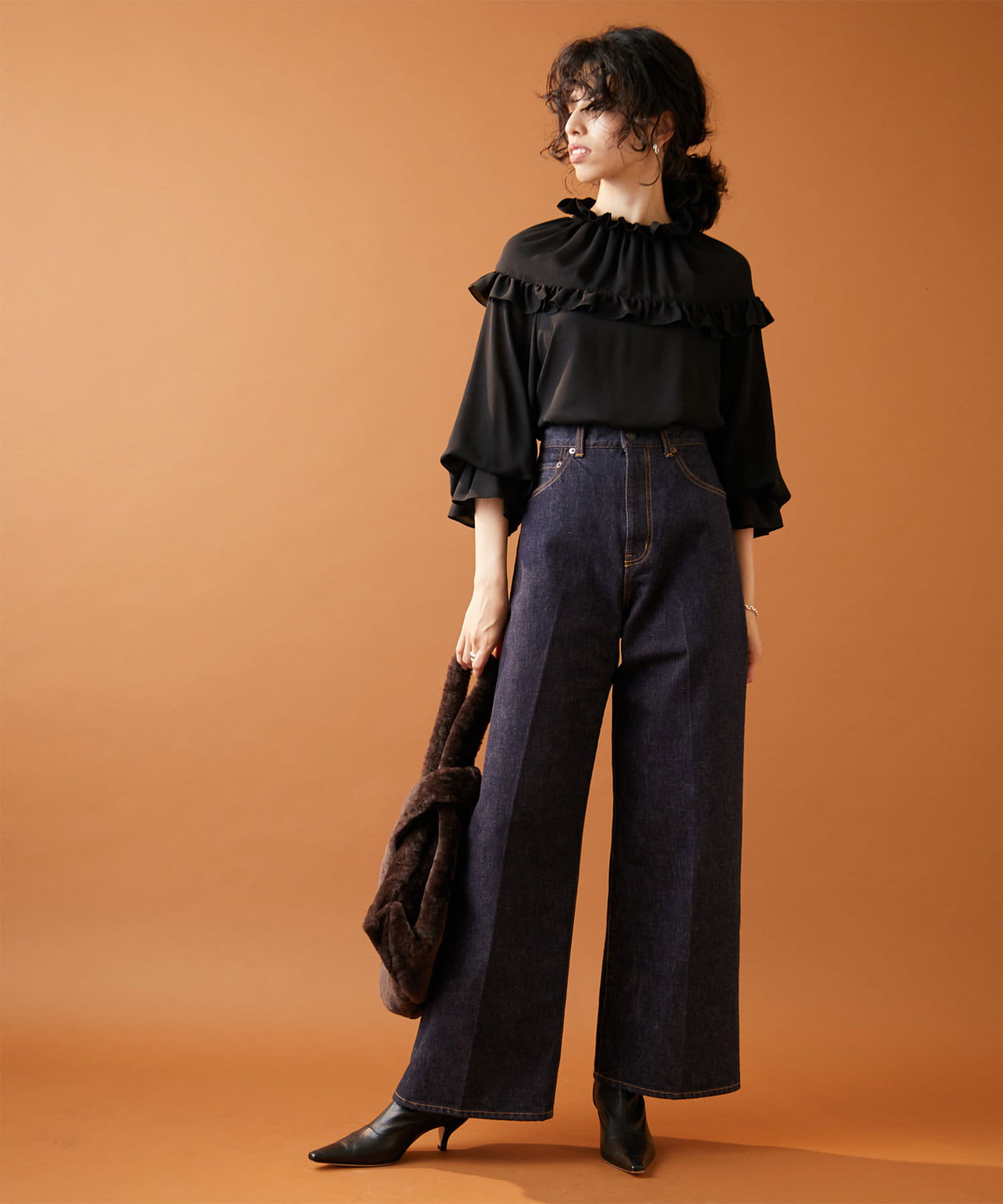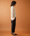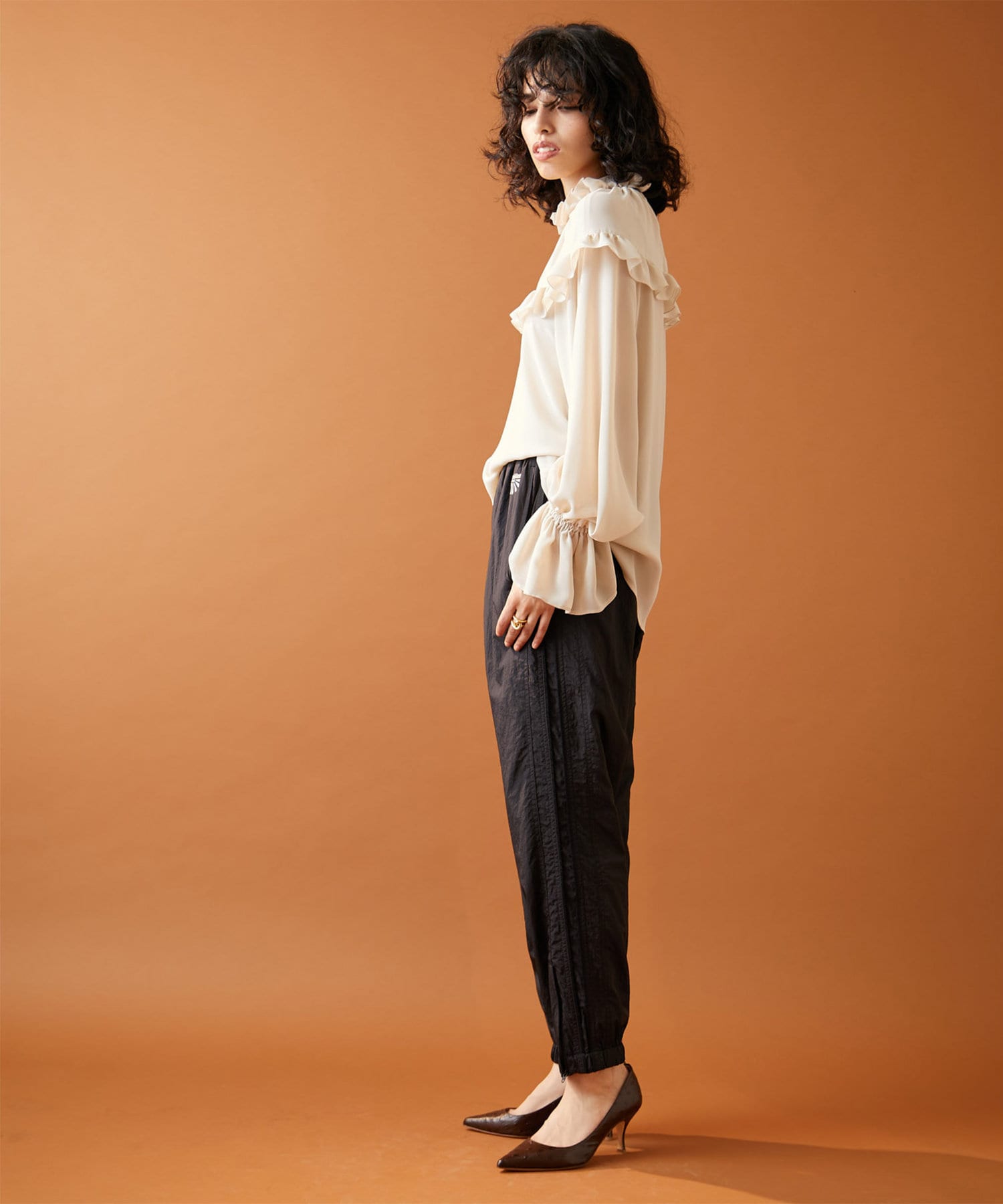 贅沢にギャザーを施したスタンドネック、肩周りに贅沢に施したフリルや袖口のギャザーディテールなどフェミニンな要素がたっぷり詰まった女性らしい一着。