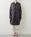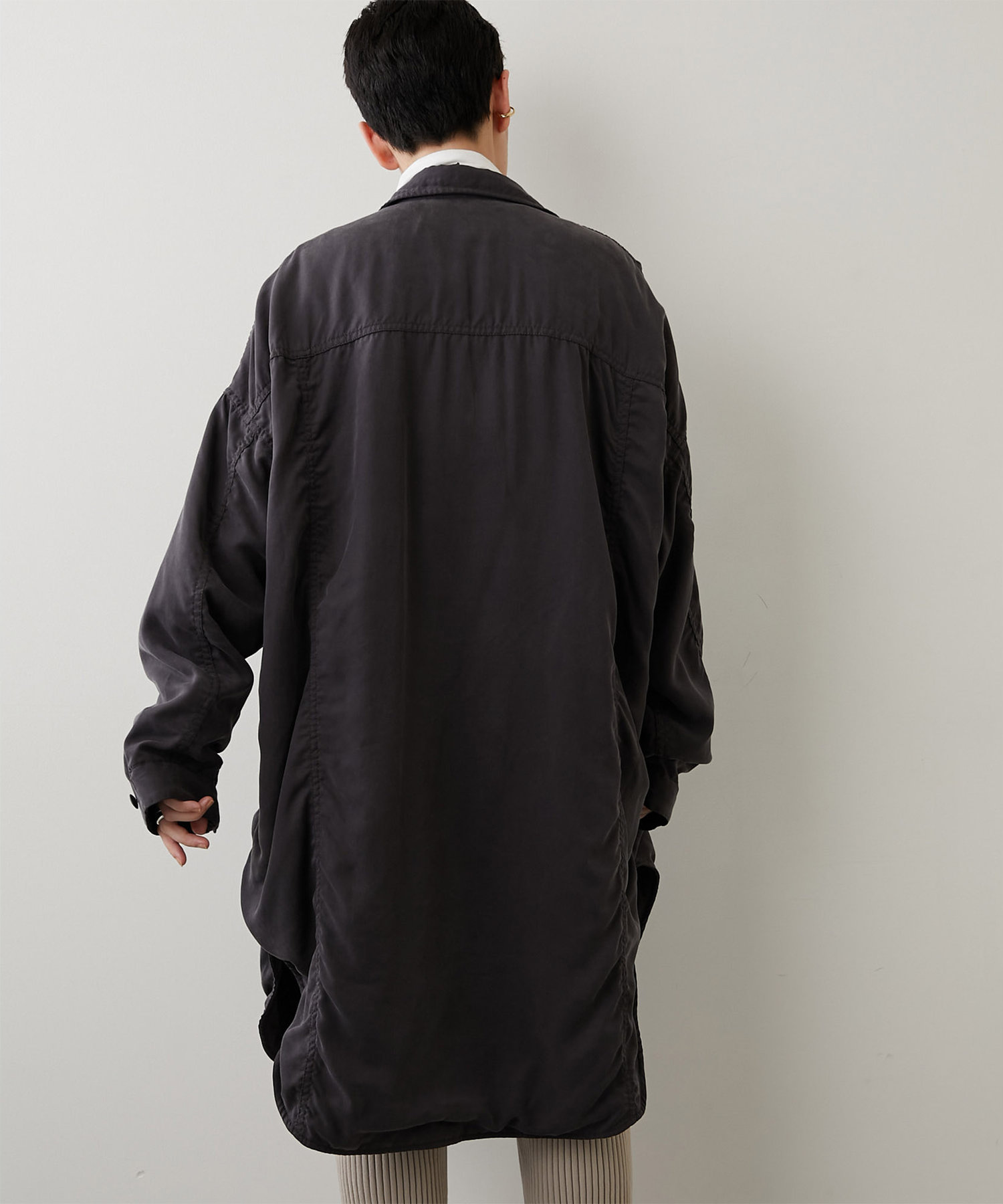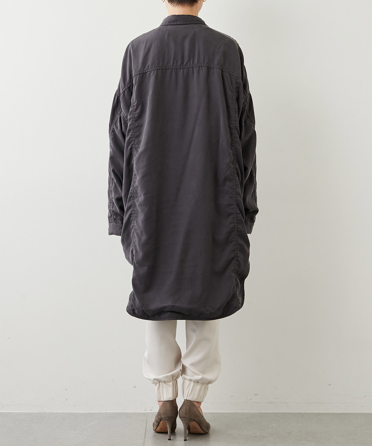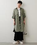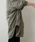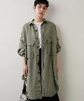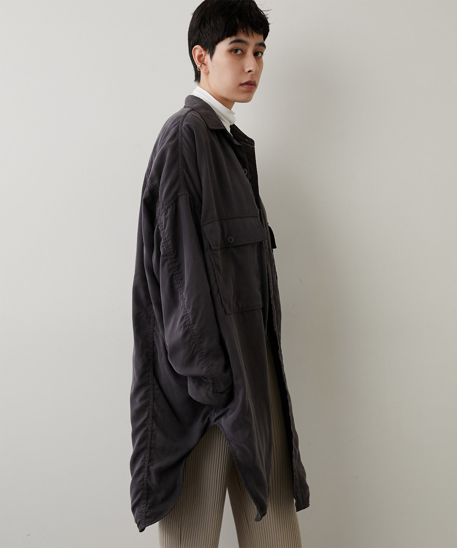 大きめのパッチポケットや大胆にカーブを描いたラウンドヘムもポイントで、羽織りとしてはもちろん、ボタンを留めてシャツワンピースのように着こなしても様になります。