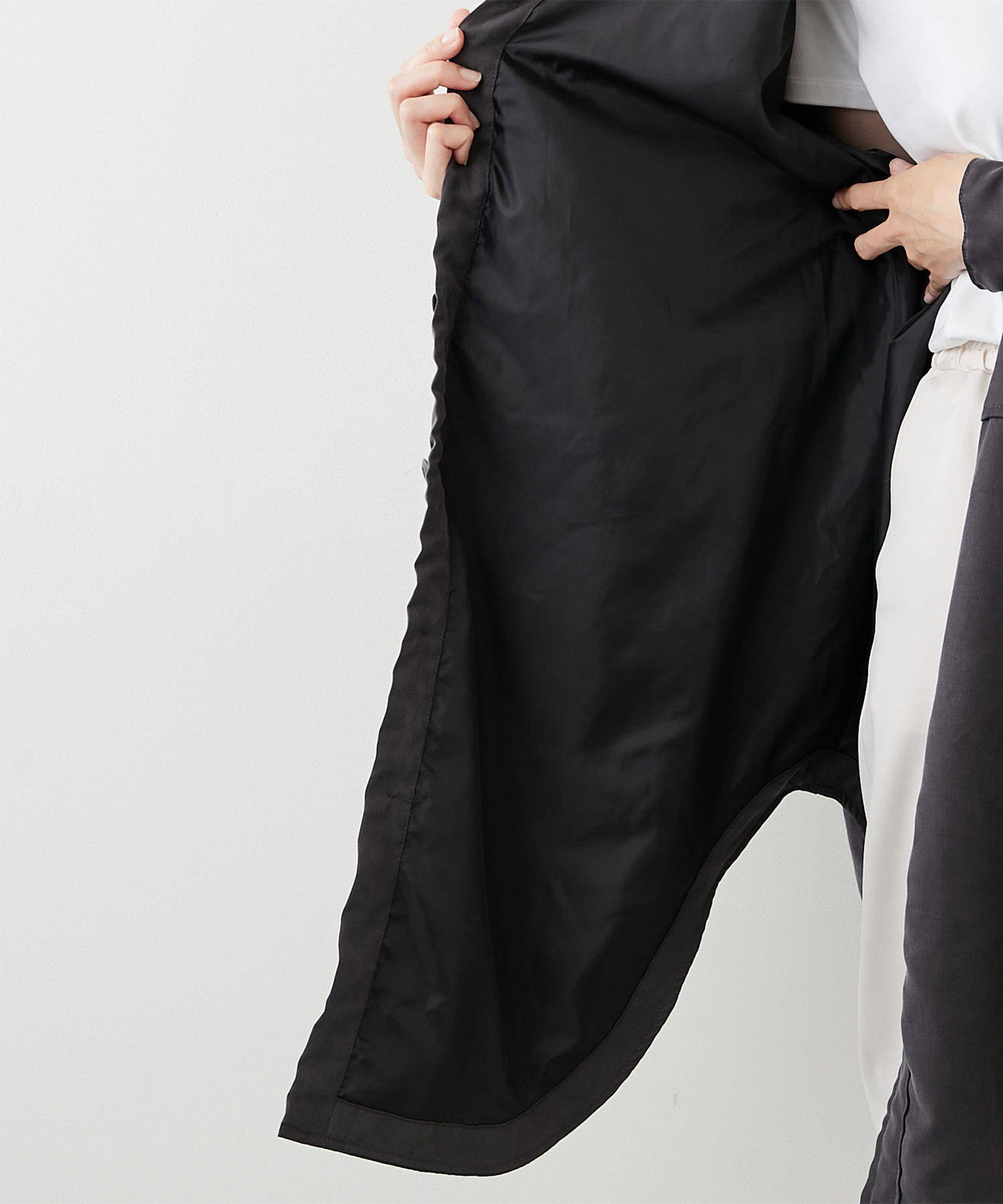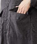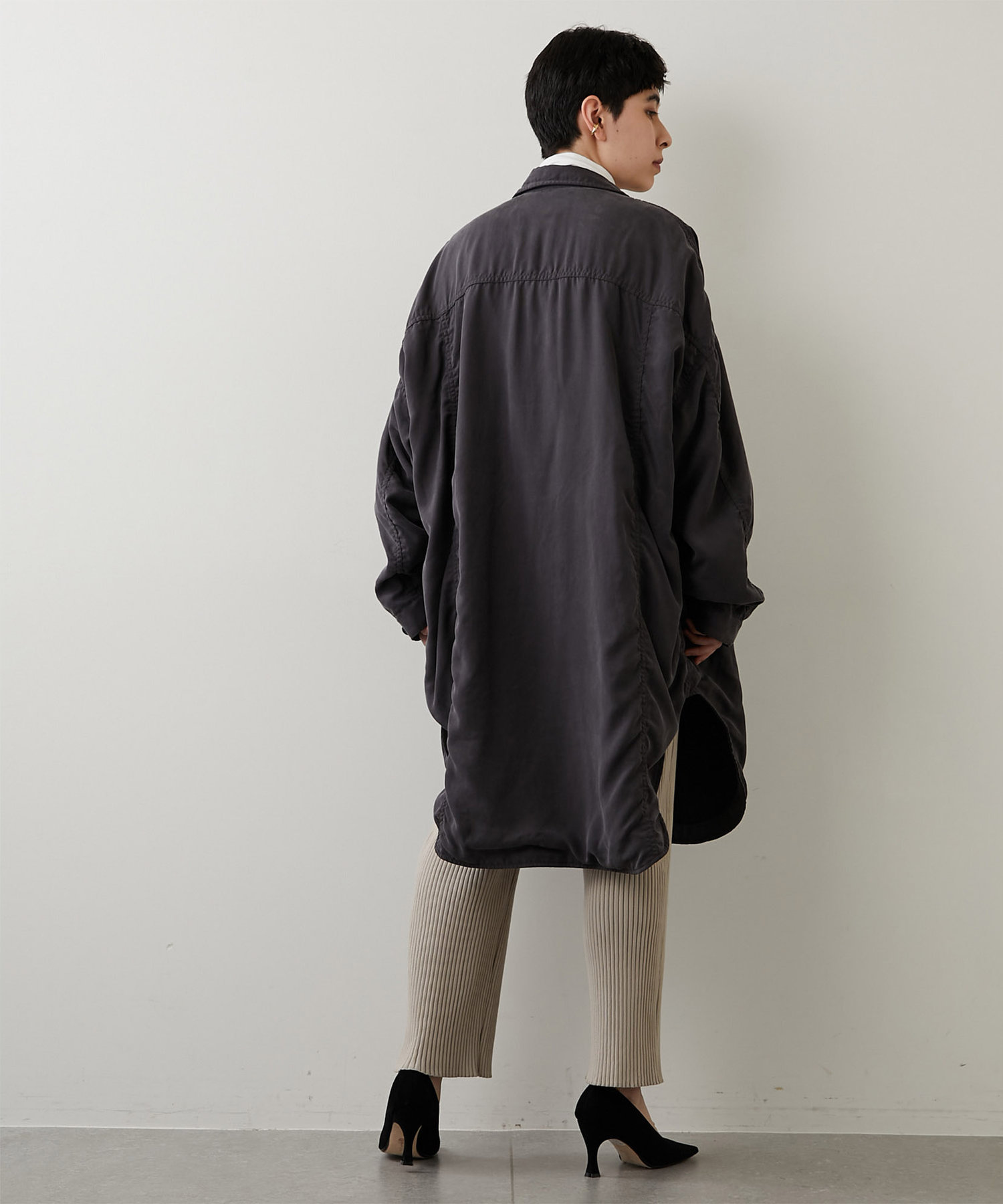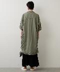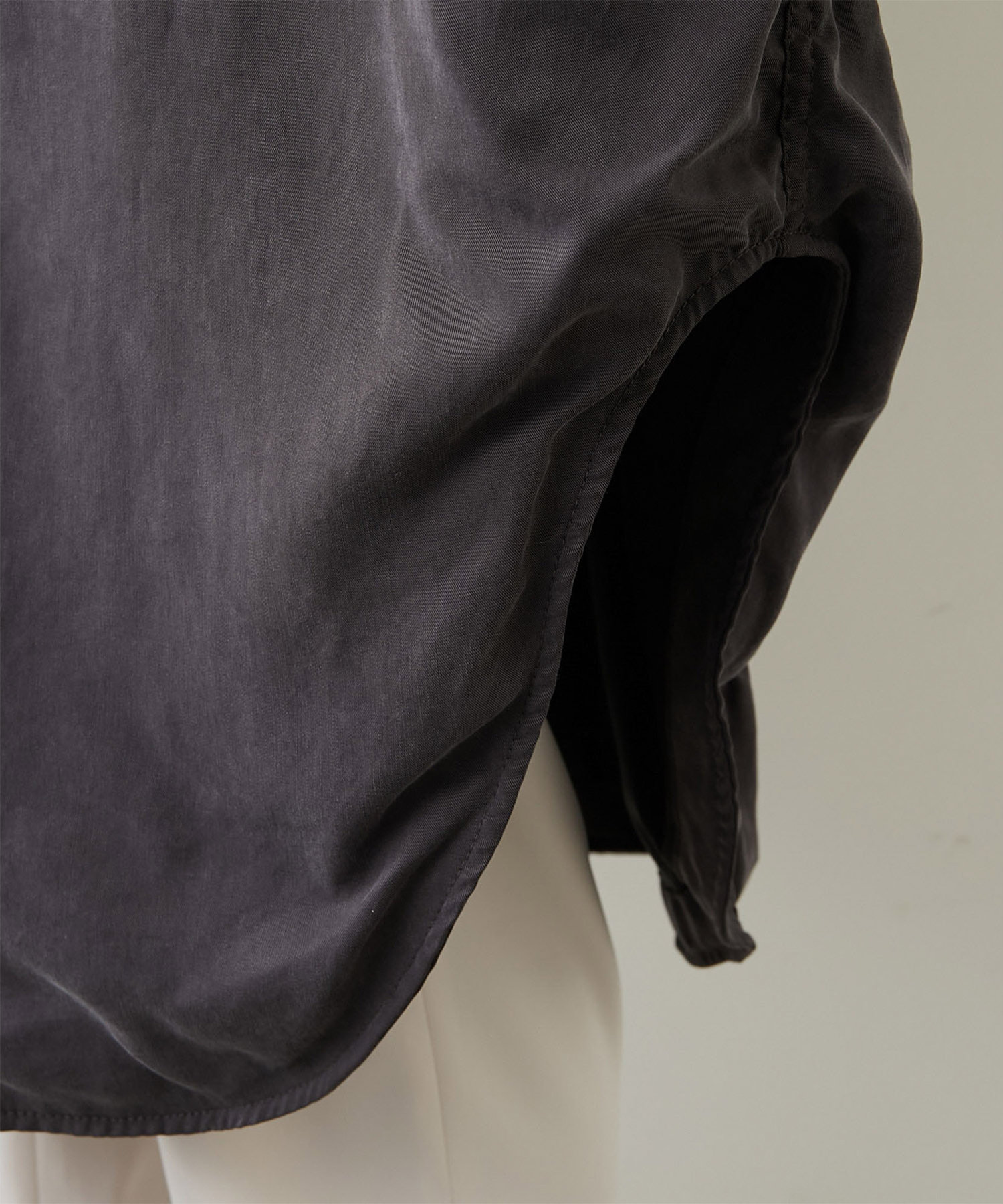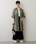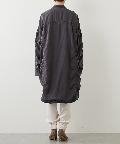 大きめのパッチポケットや大胆にカーブを描いたラウンドヘムもポイントで、羽織りとしてはもちろん、ボタンを留めてシャツワンピースのように着こなしても様になります。