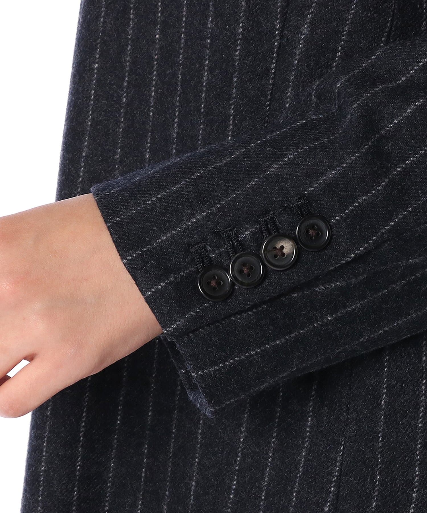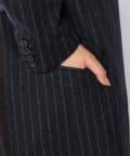 ウール100%のピンストライプのフランネル生地と、裏地と後身頃にキュプラを使用。