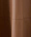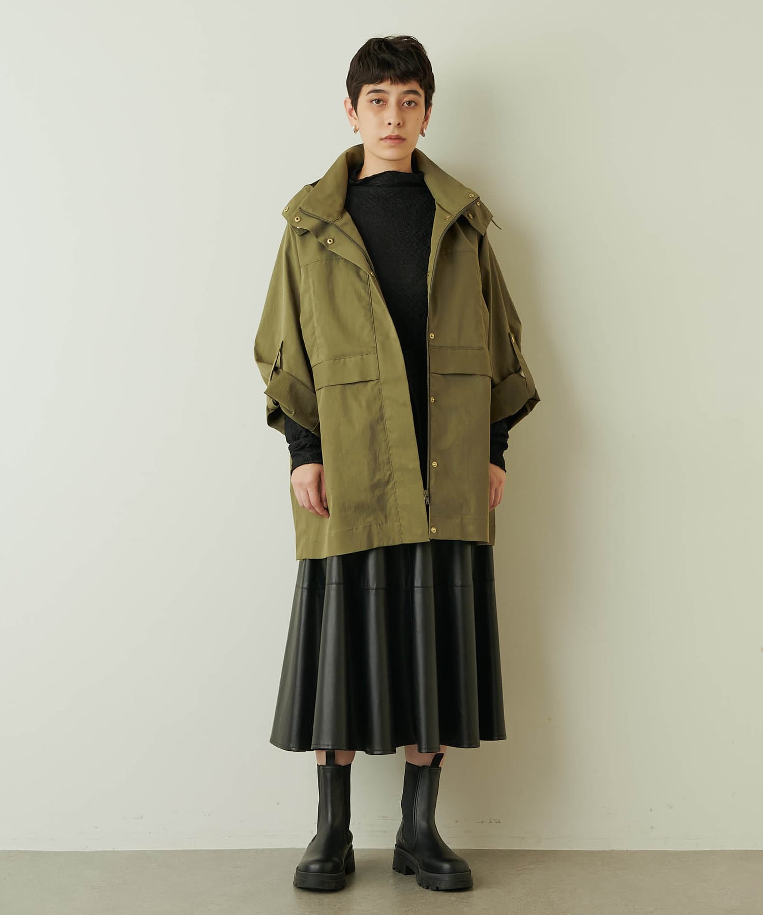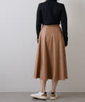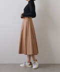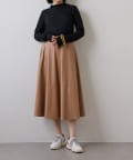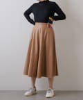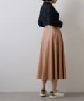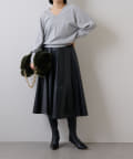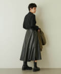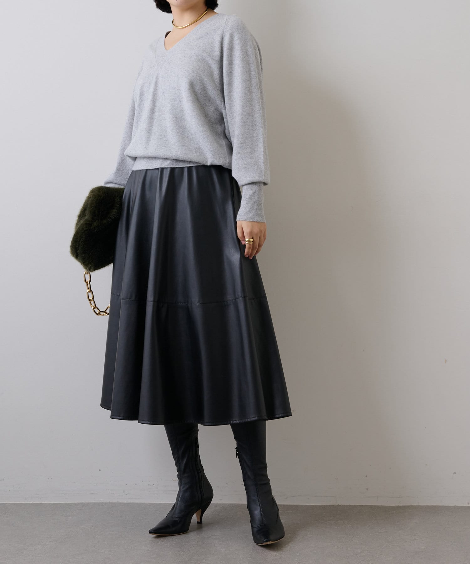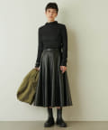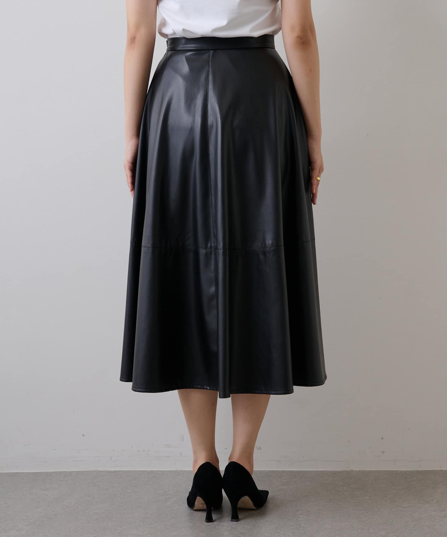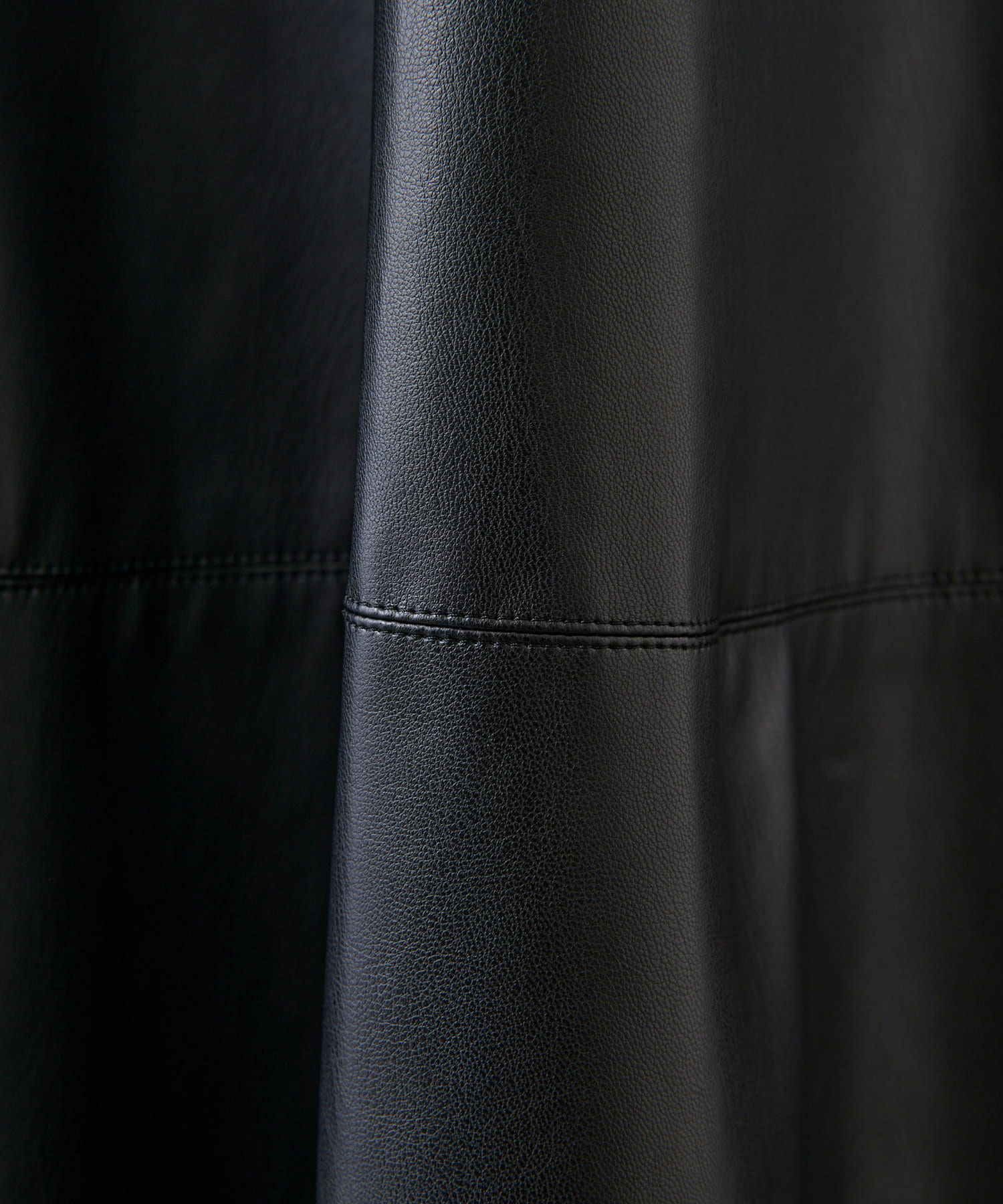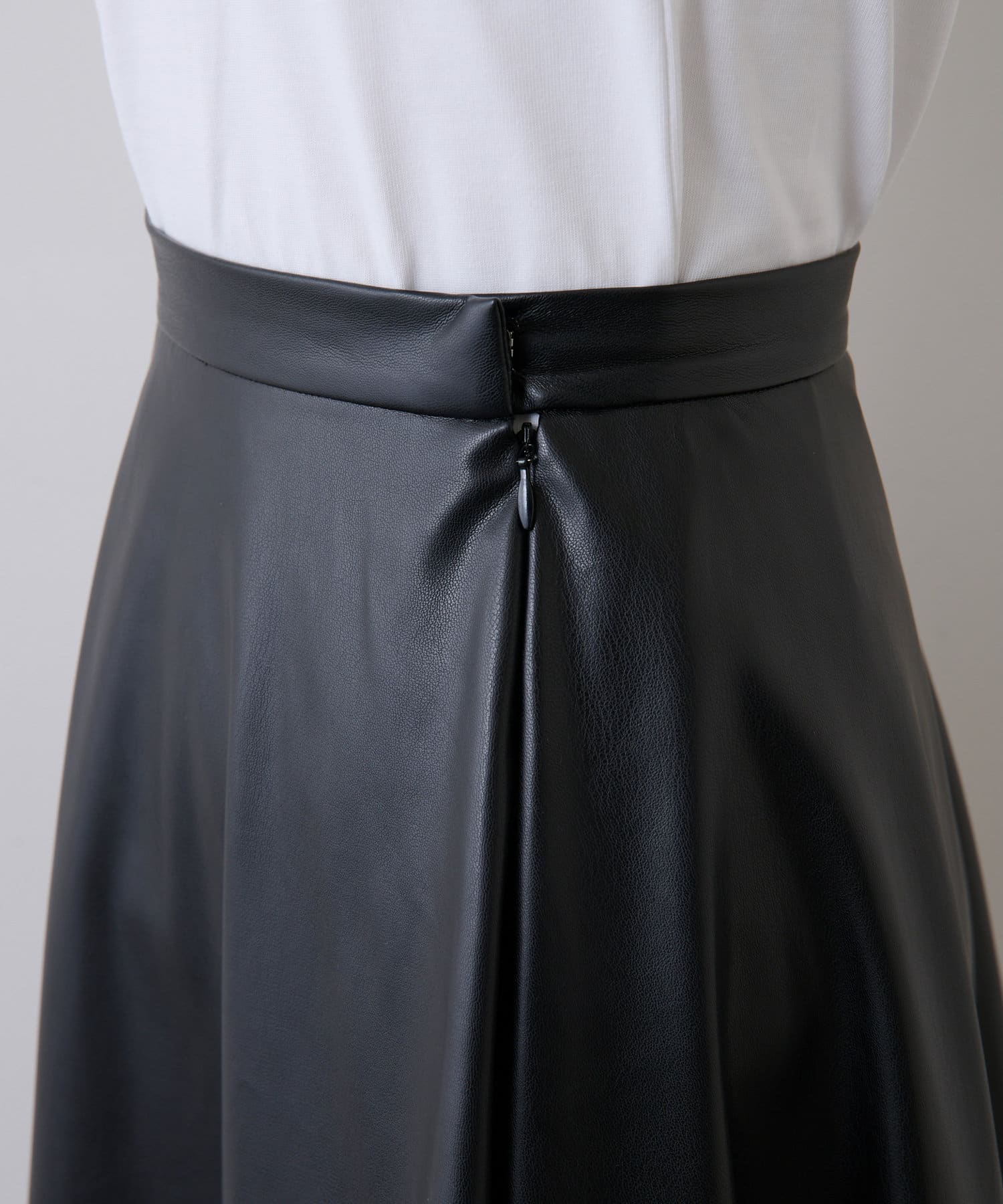 腰回りはすっきりと、歩くたびに揺れるたっぷりのフレアシルエットが女性らしさを演出しながら、レザーの風合いがクールでモードな雰囲気をプラス。