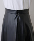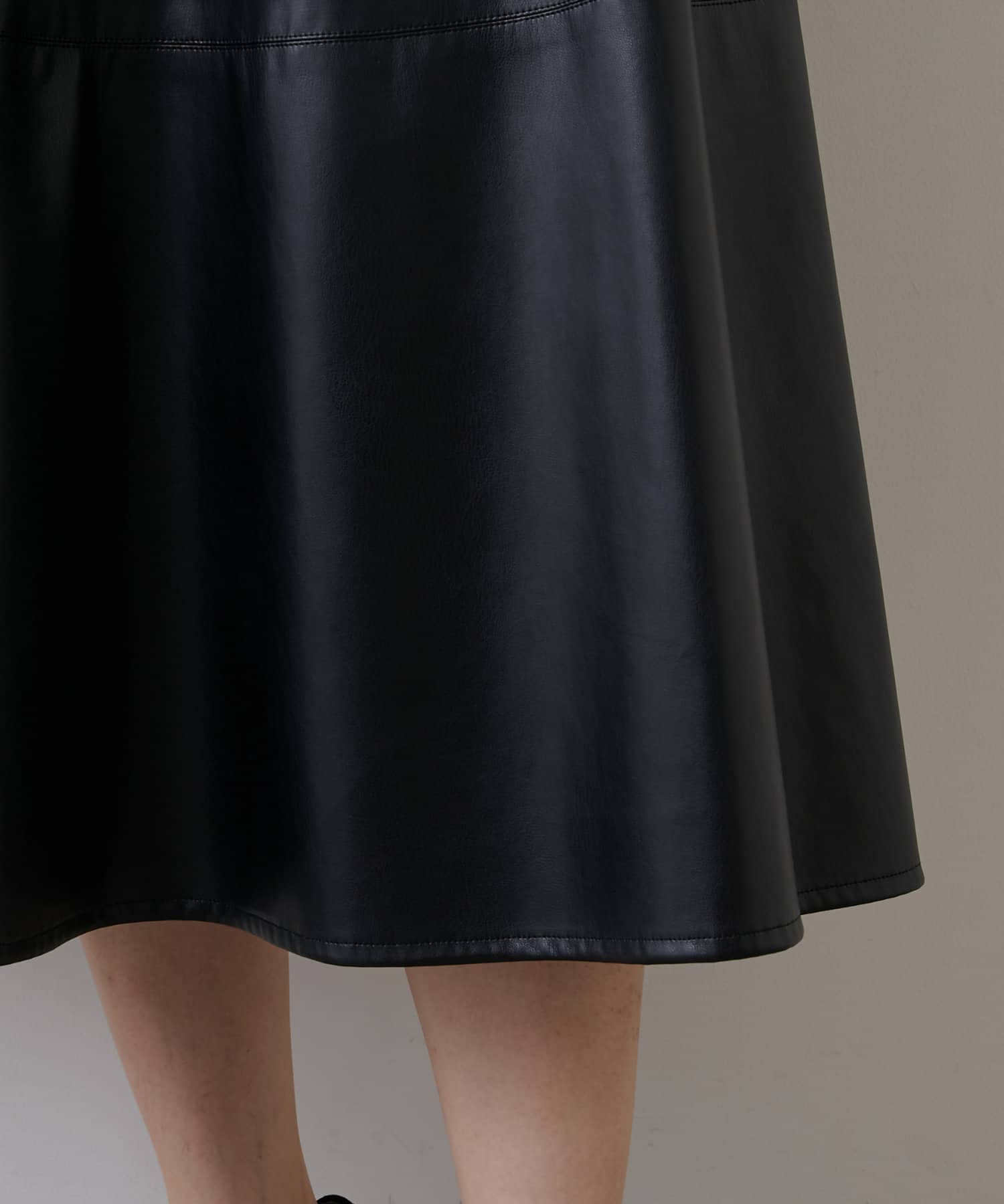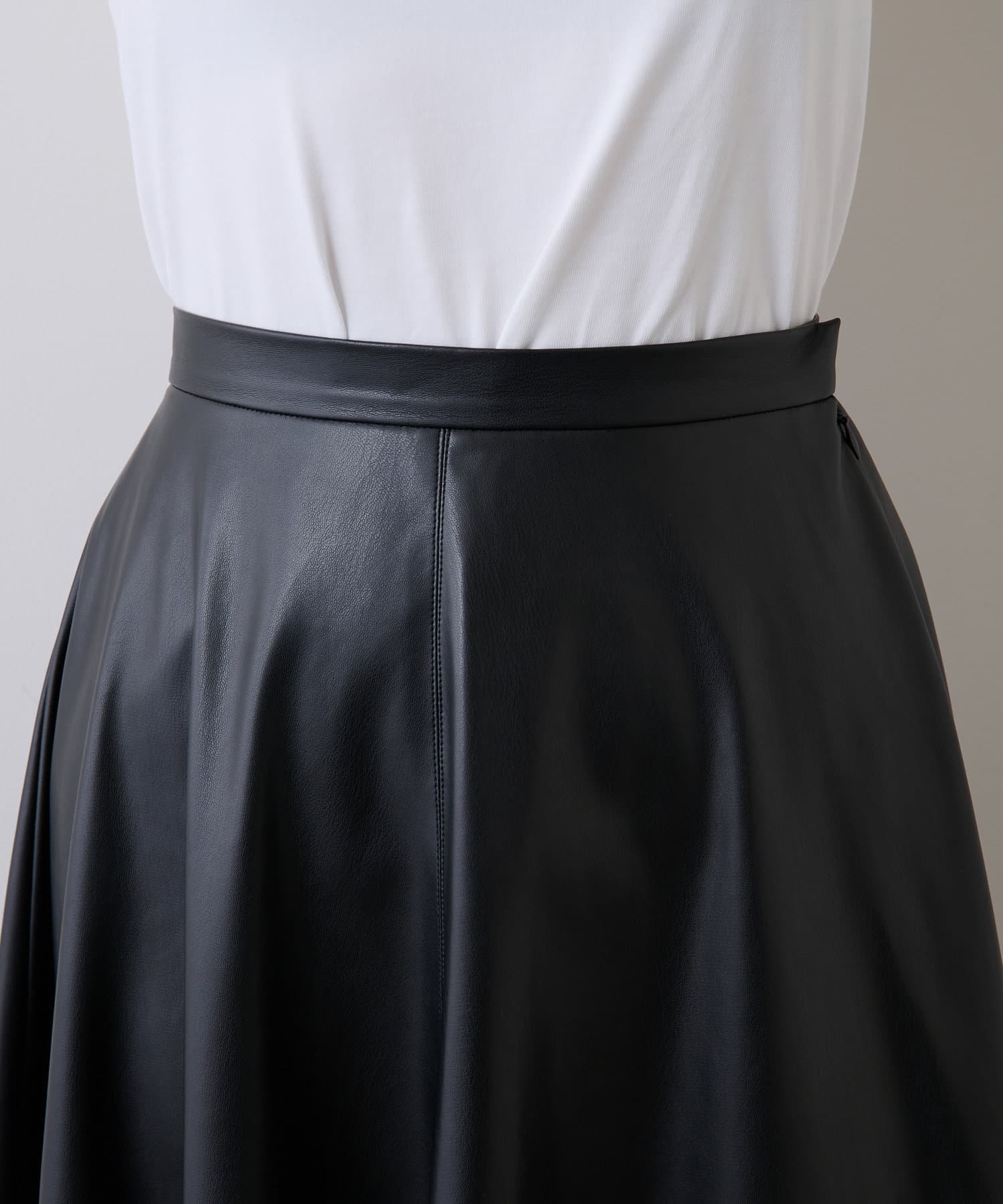 リアルレザーのような質感と光沢感が目を惹くフレアスカート。
