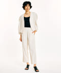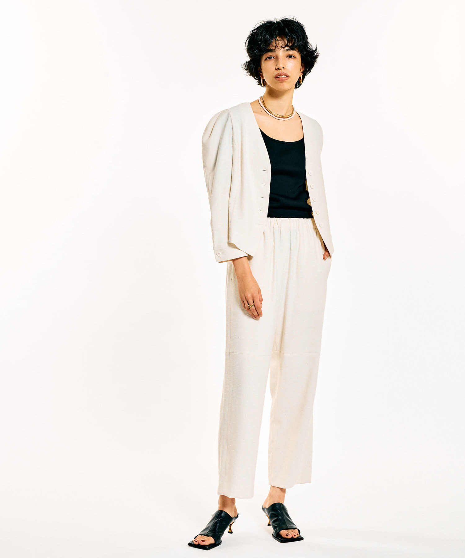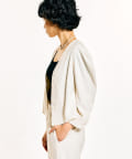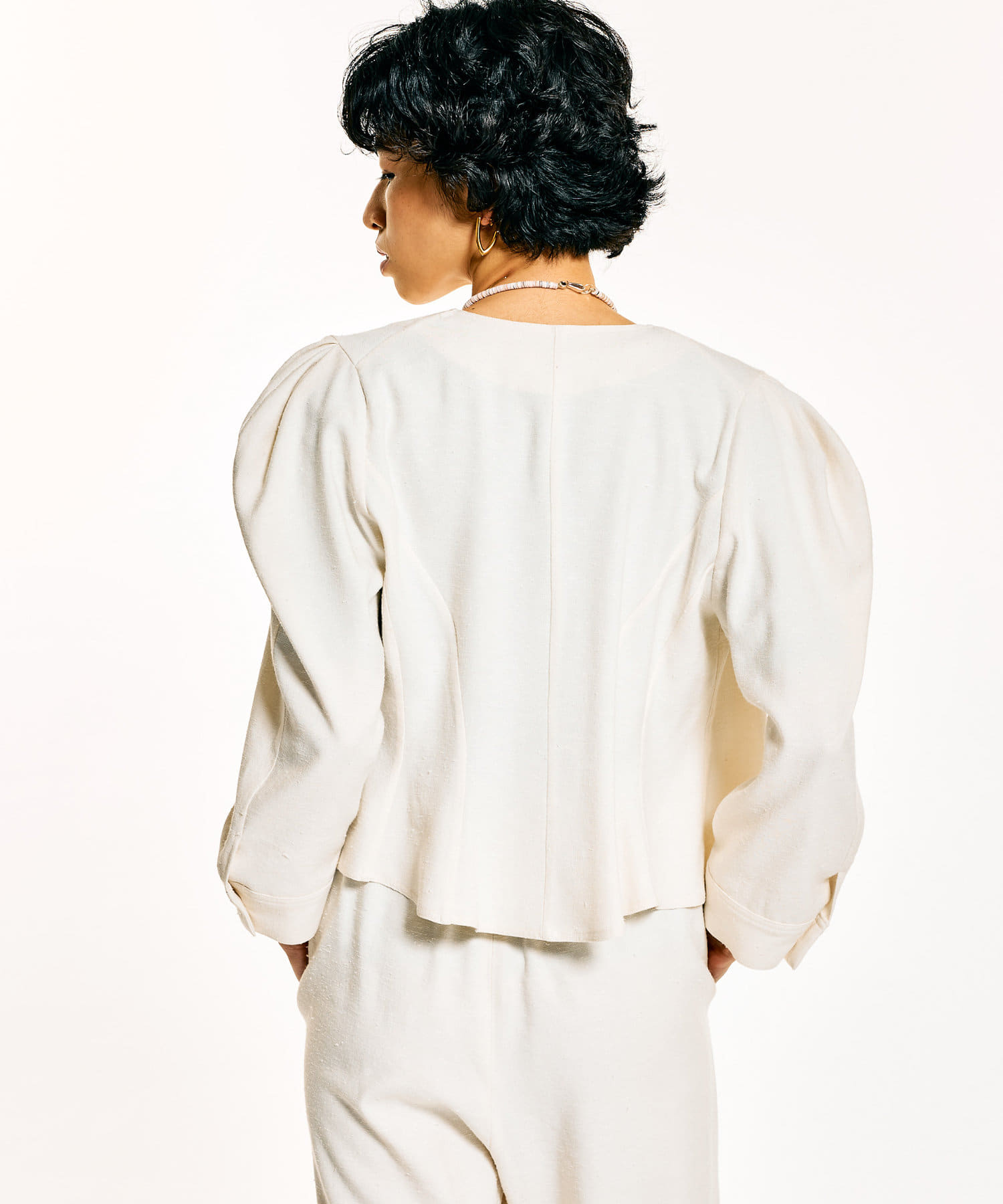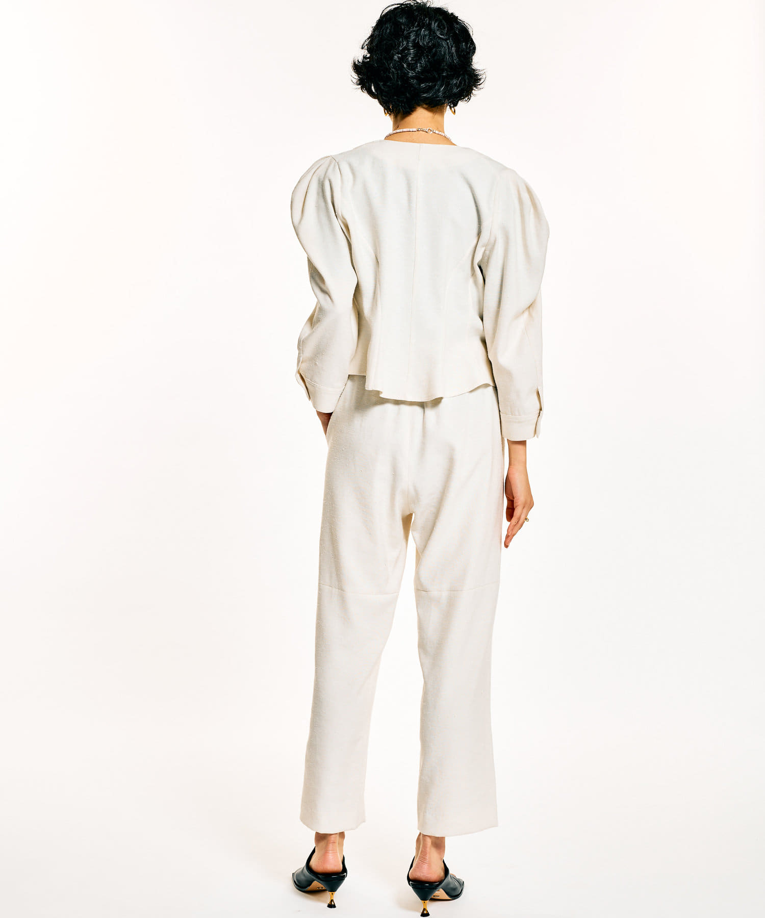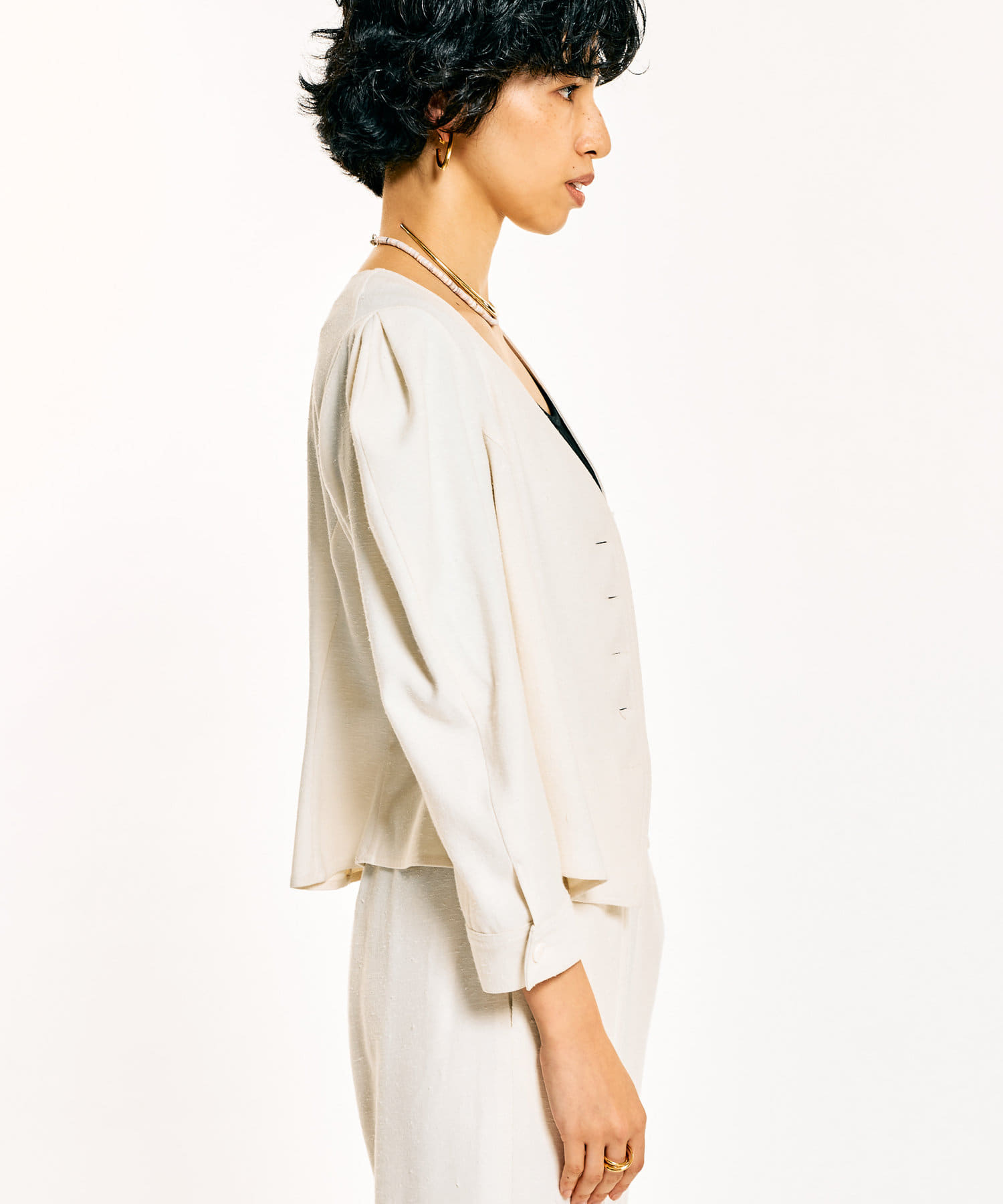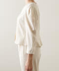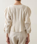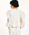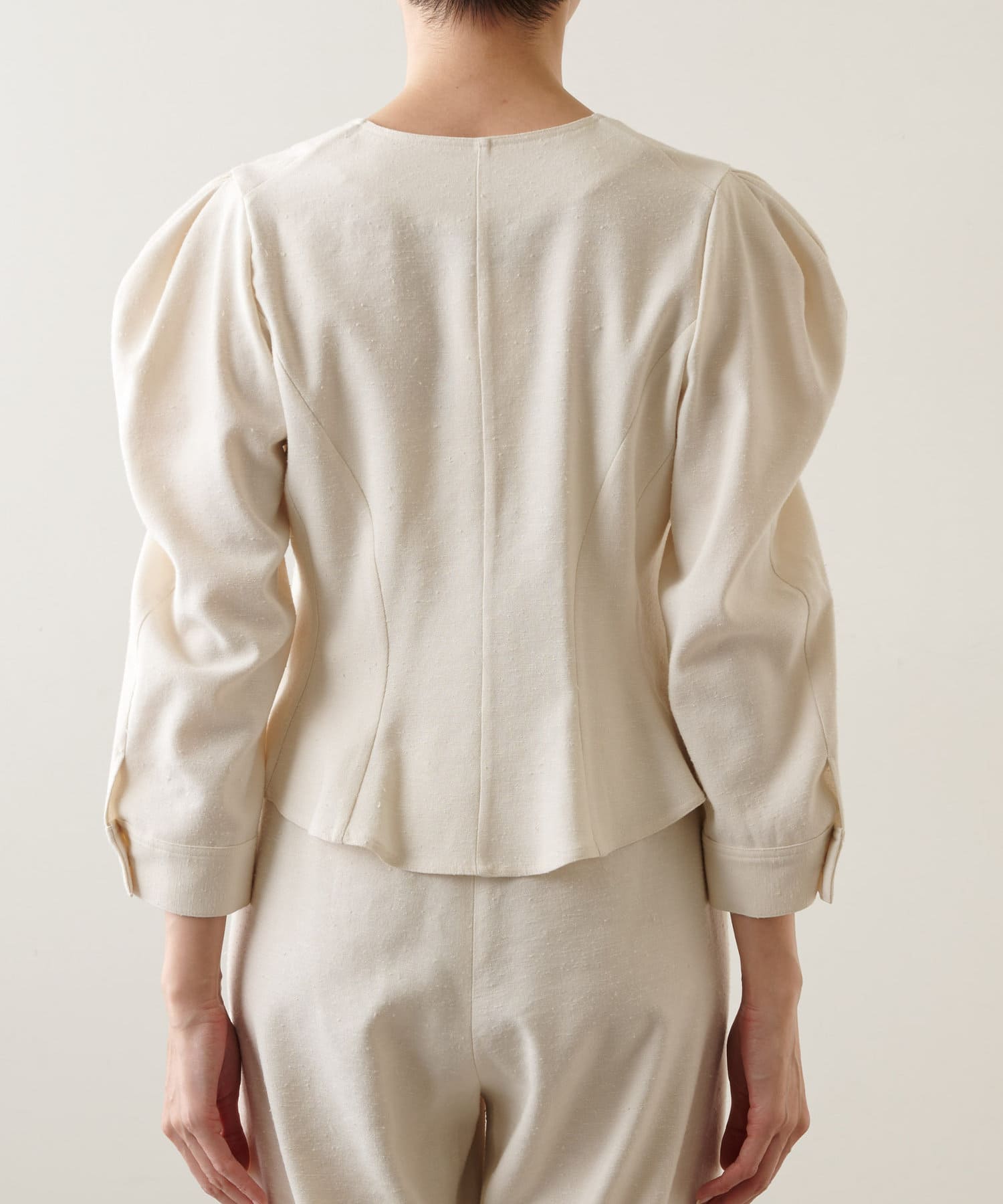 ■独特のスリーブシルエットと、スラブ入り生地の表情が個性的なショート丈ブラウス。