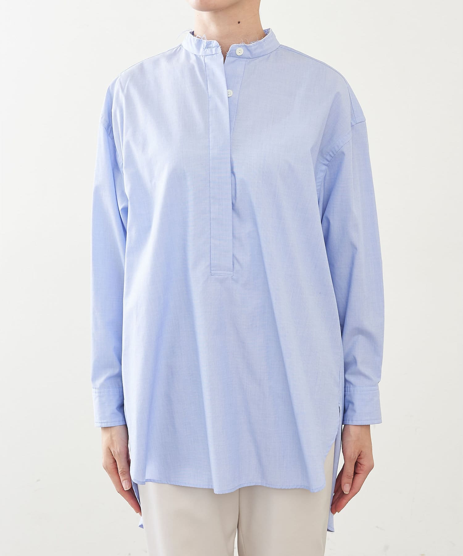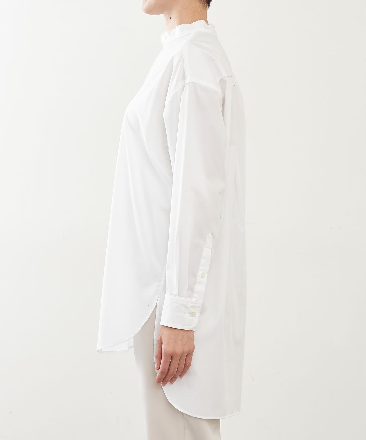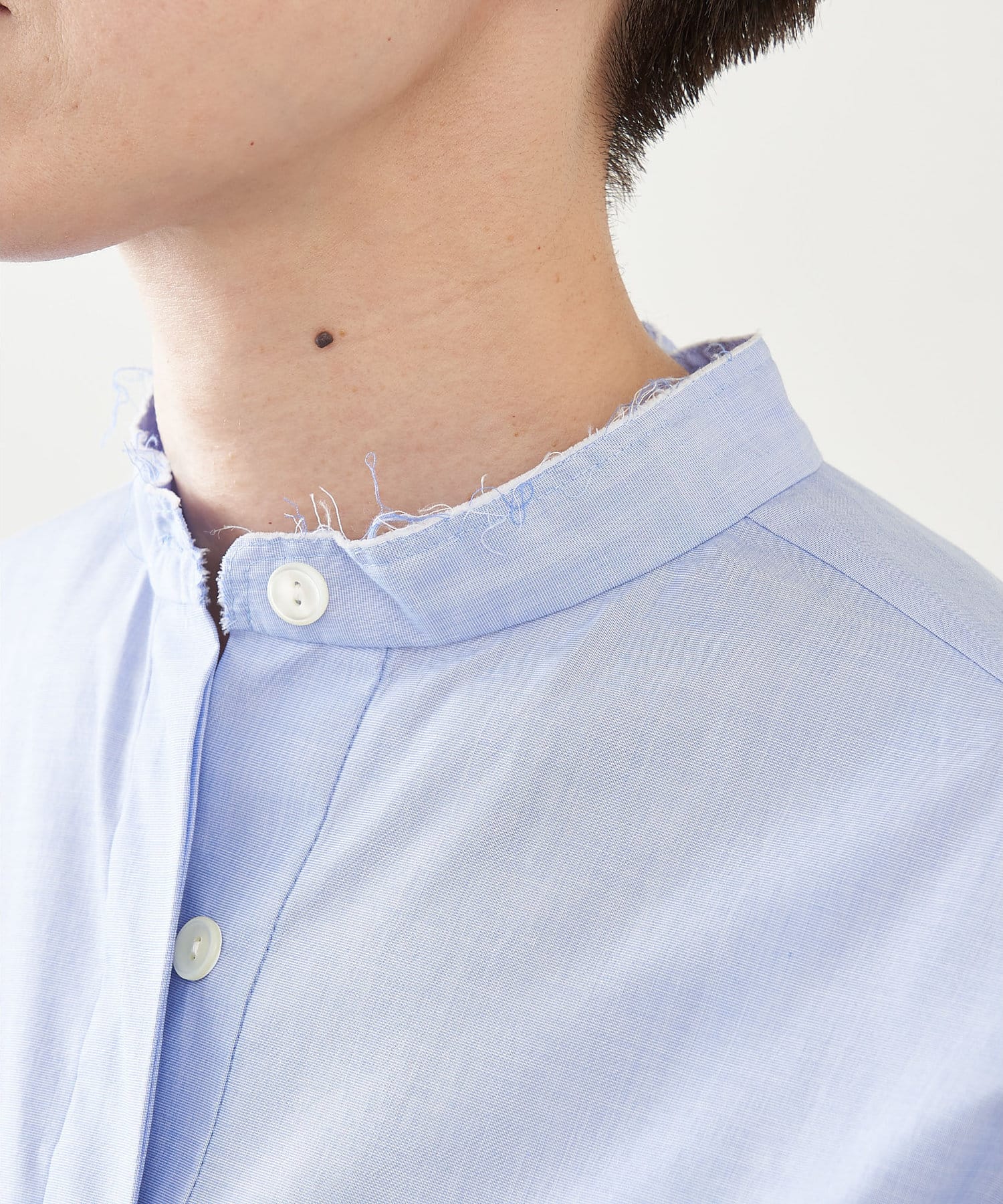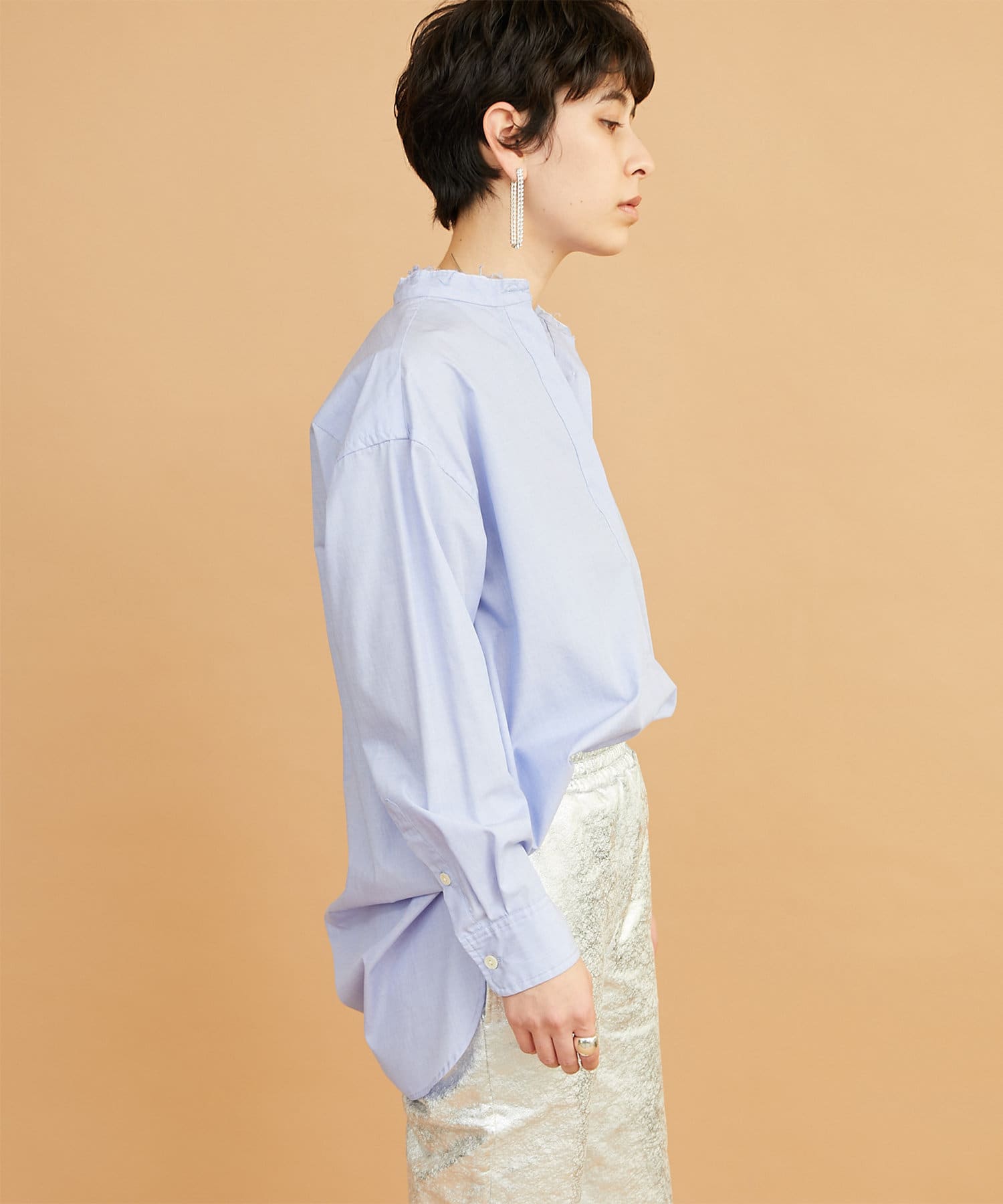 ■敢えて断ち切りに仕上げたバンドカラーが抜け感をプラス。