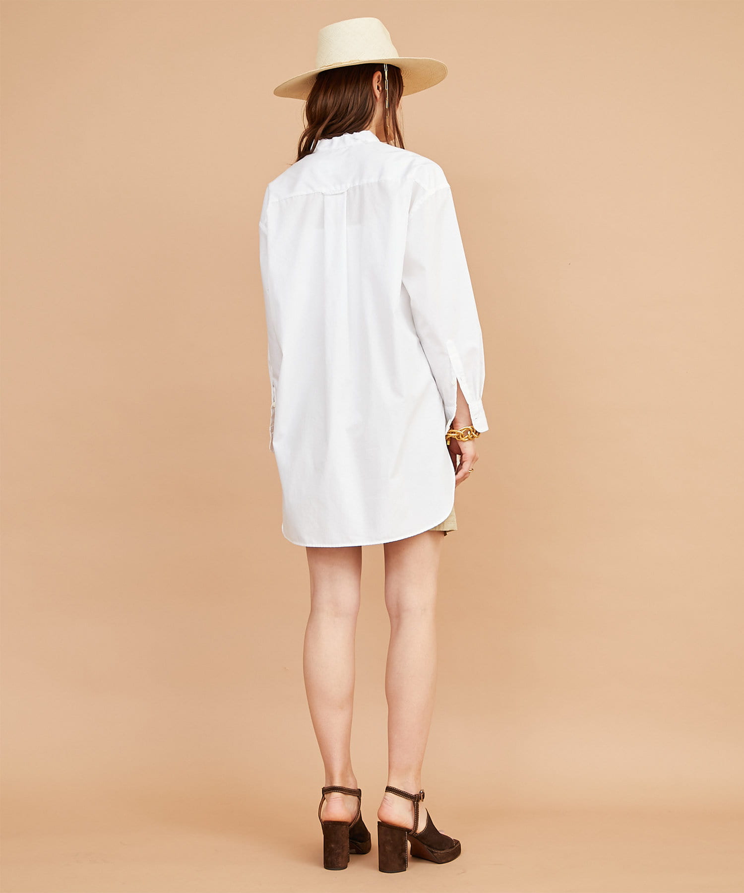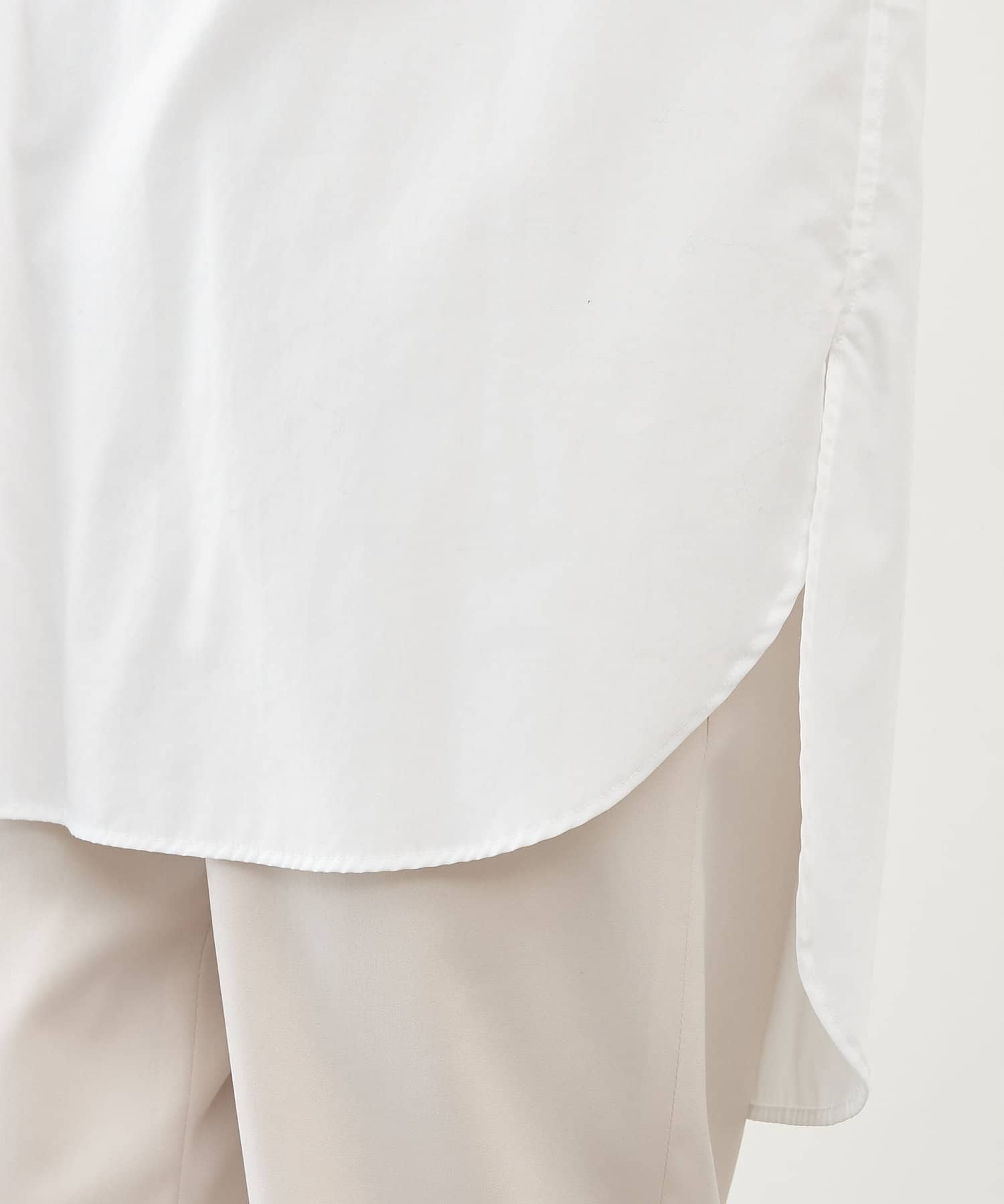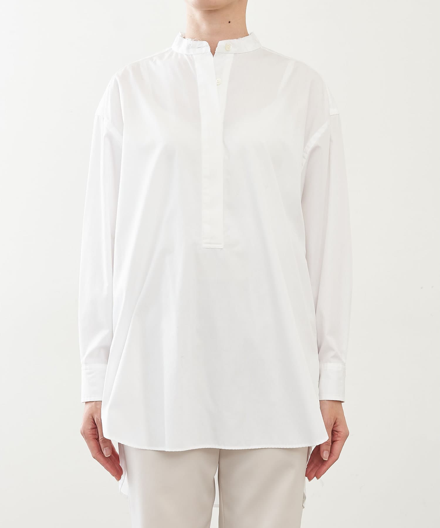 ■敢えて断ち切りに仕上げたバンドカラーが抜け感をプラス。