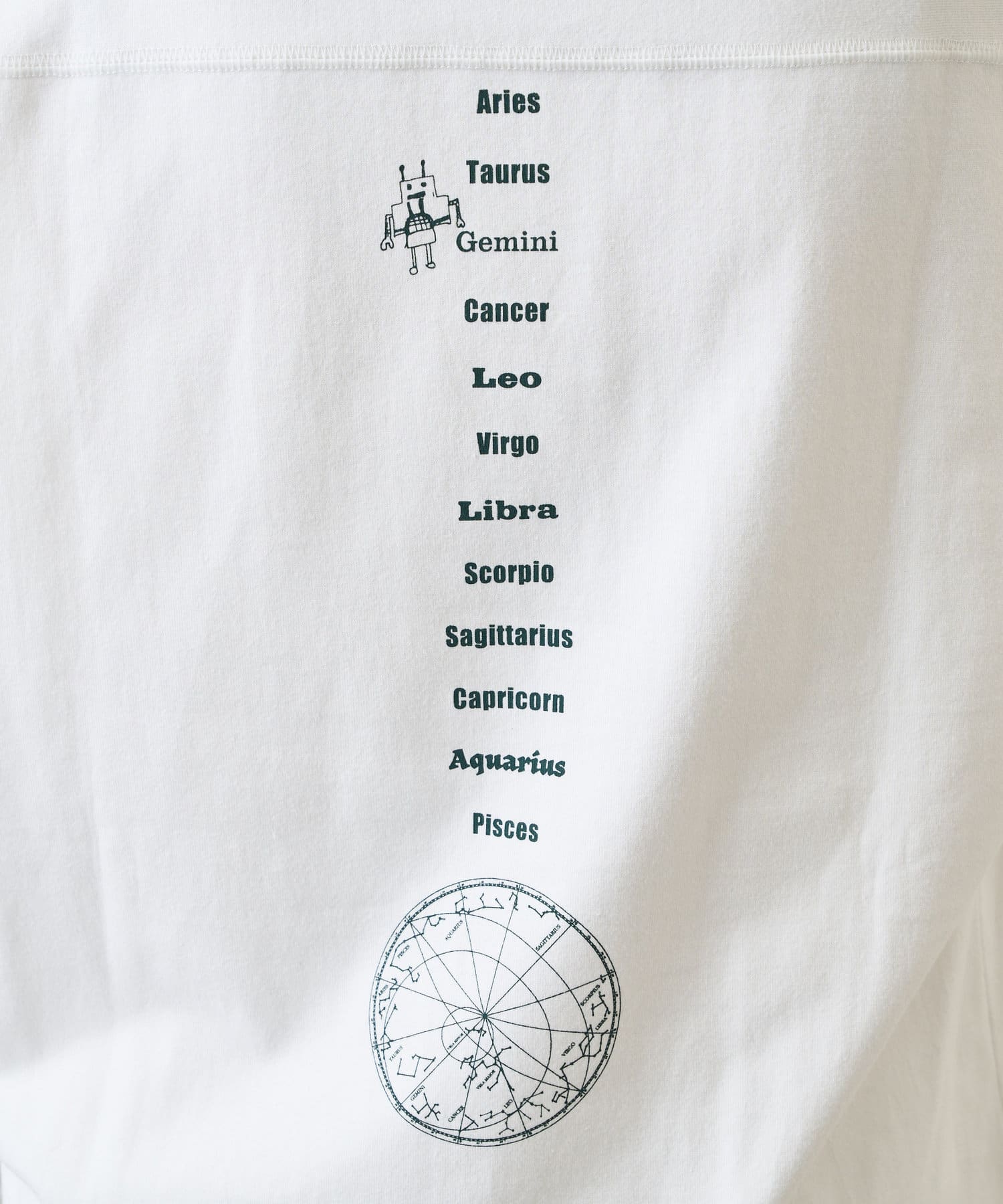 ■バックプリントの12星座には様々な書体を使用し、その中でロボットが自由に遊んでいるイメージで描かれたユニークなデザイン。