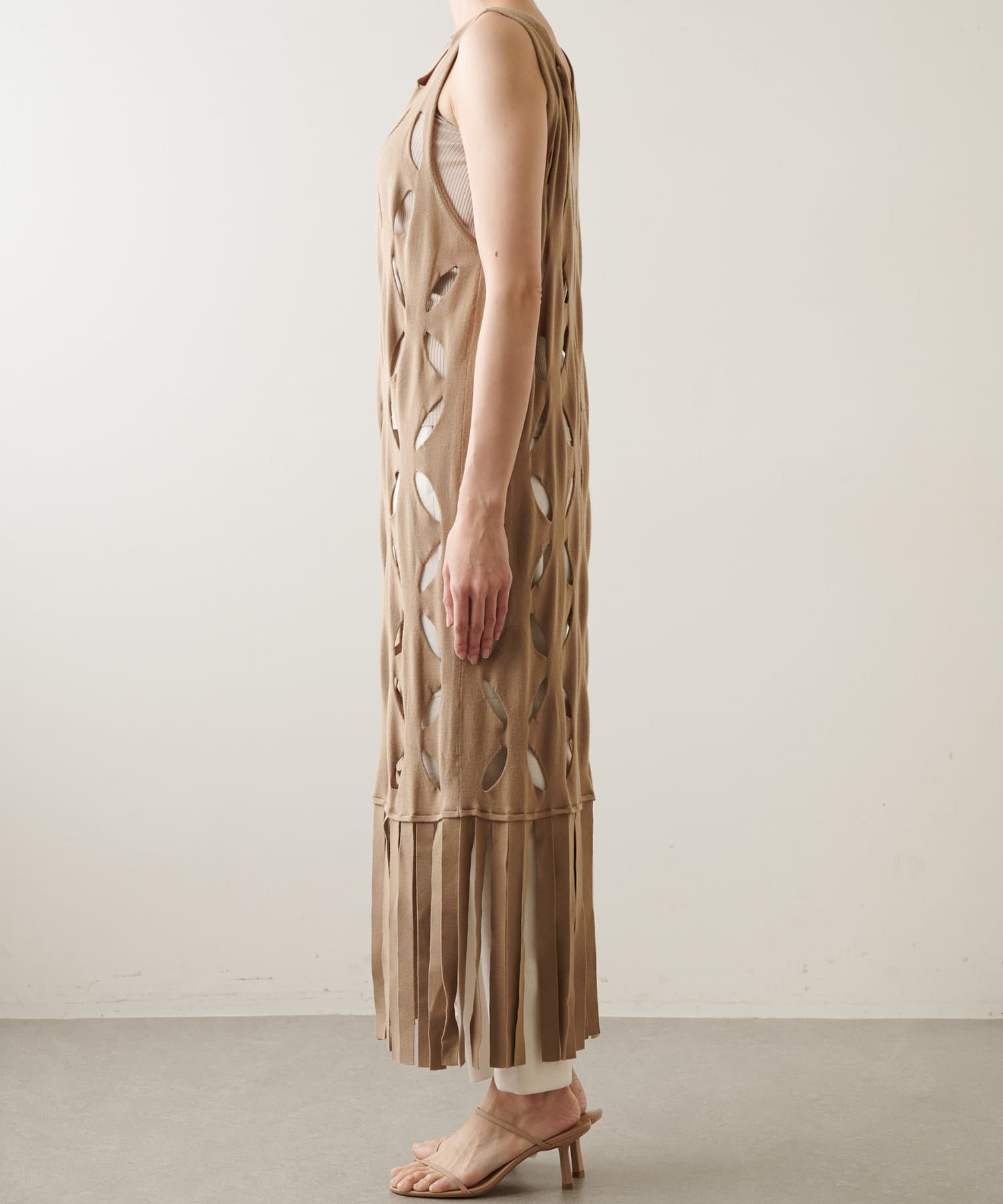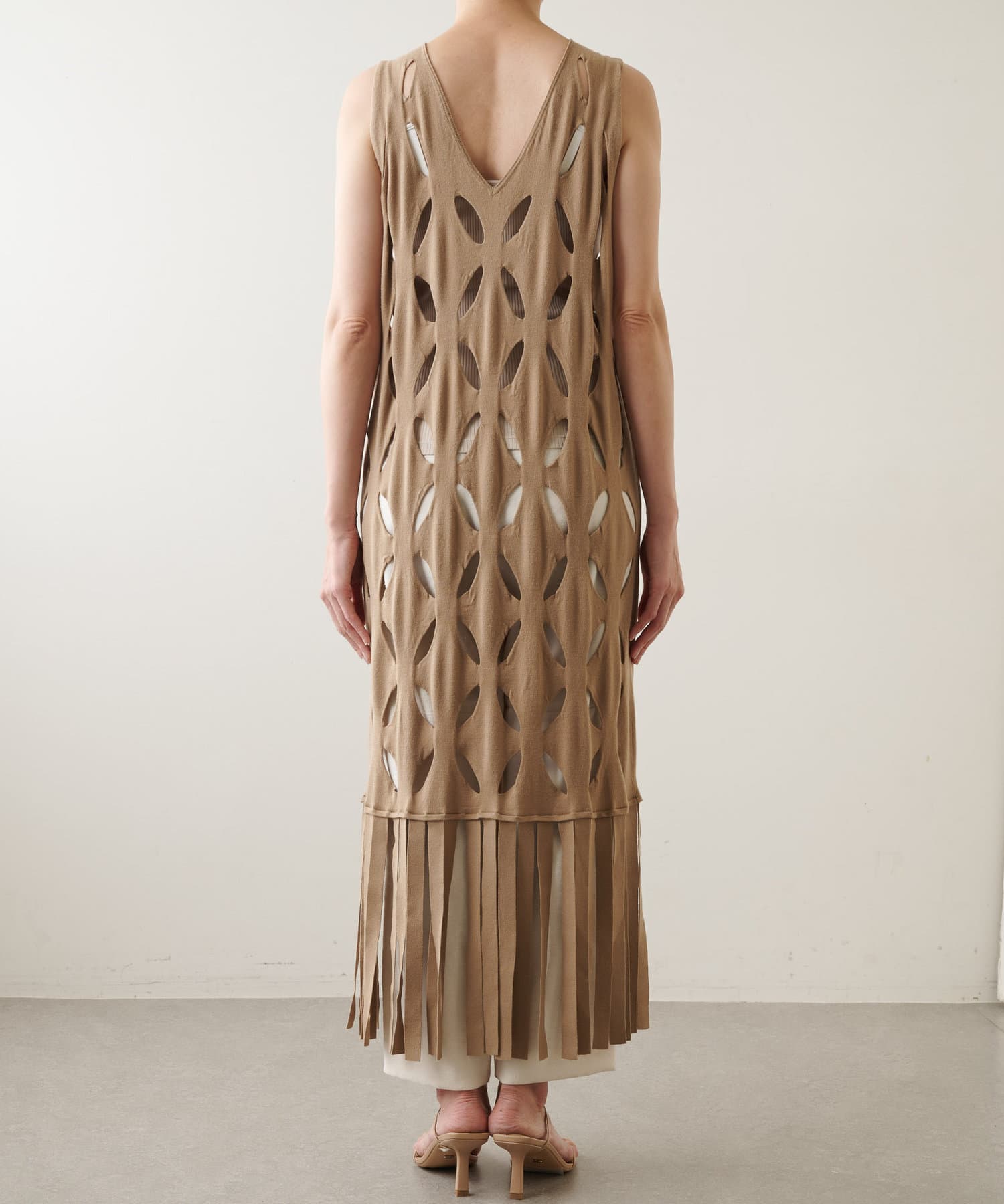 ■特殊な編み機でしか編めないスリット柄を贅沢にあしらったノースリーブワンピース。