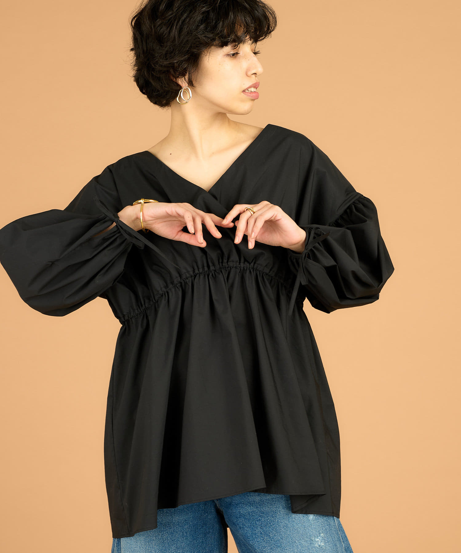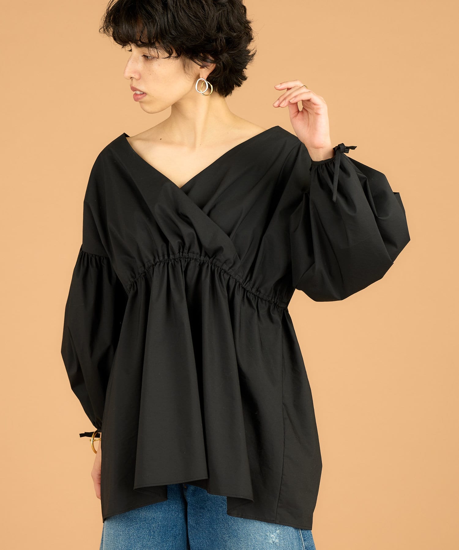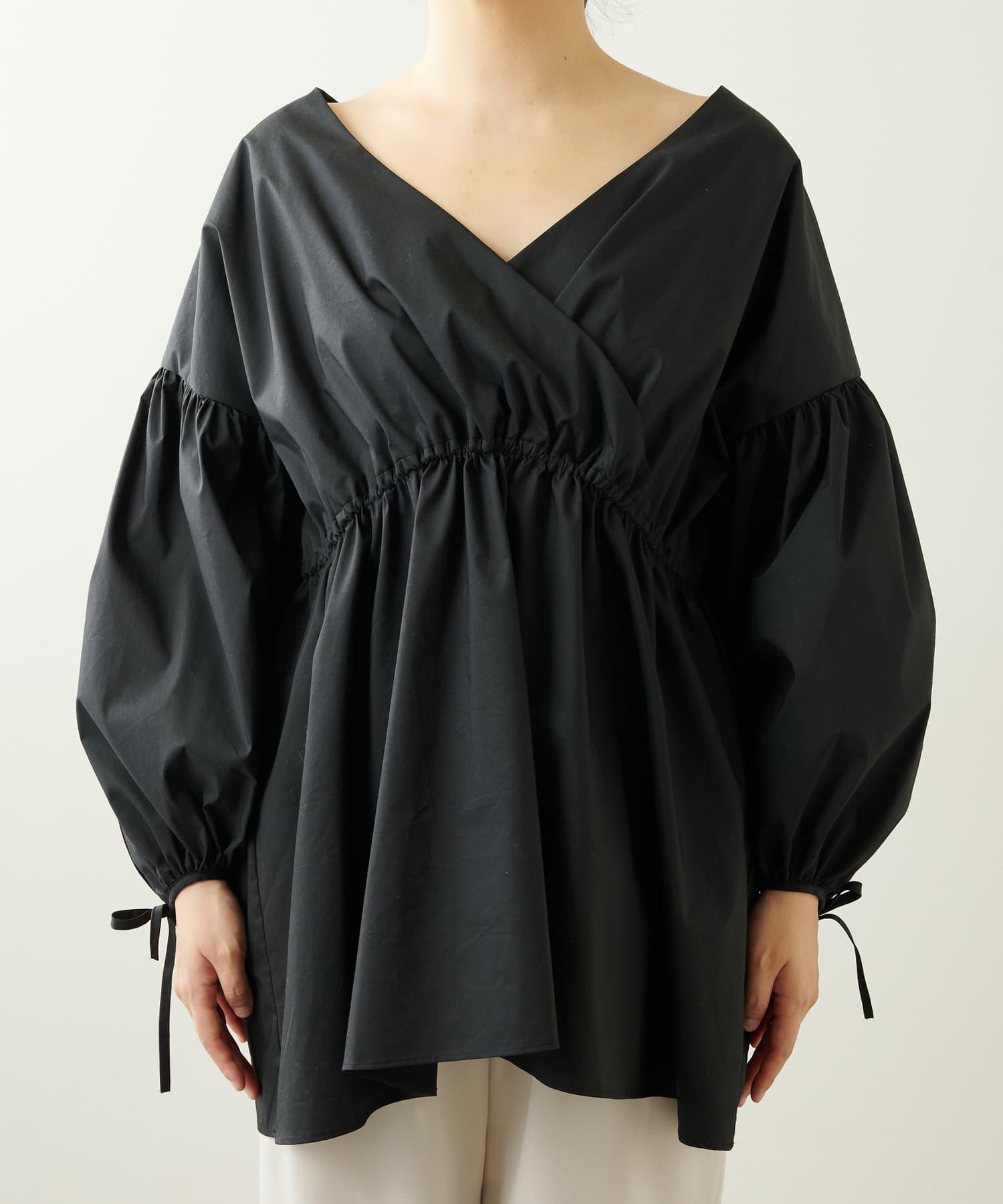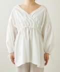 ■カシュクールギャザーシルエットに仕上げたフェミニンなブラウス。