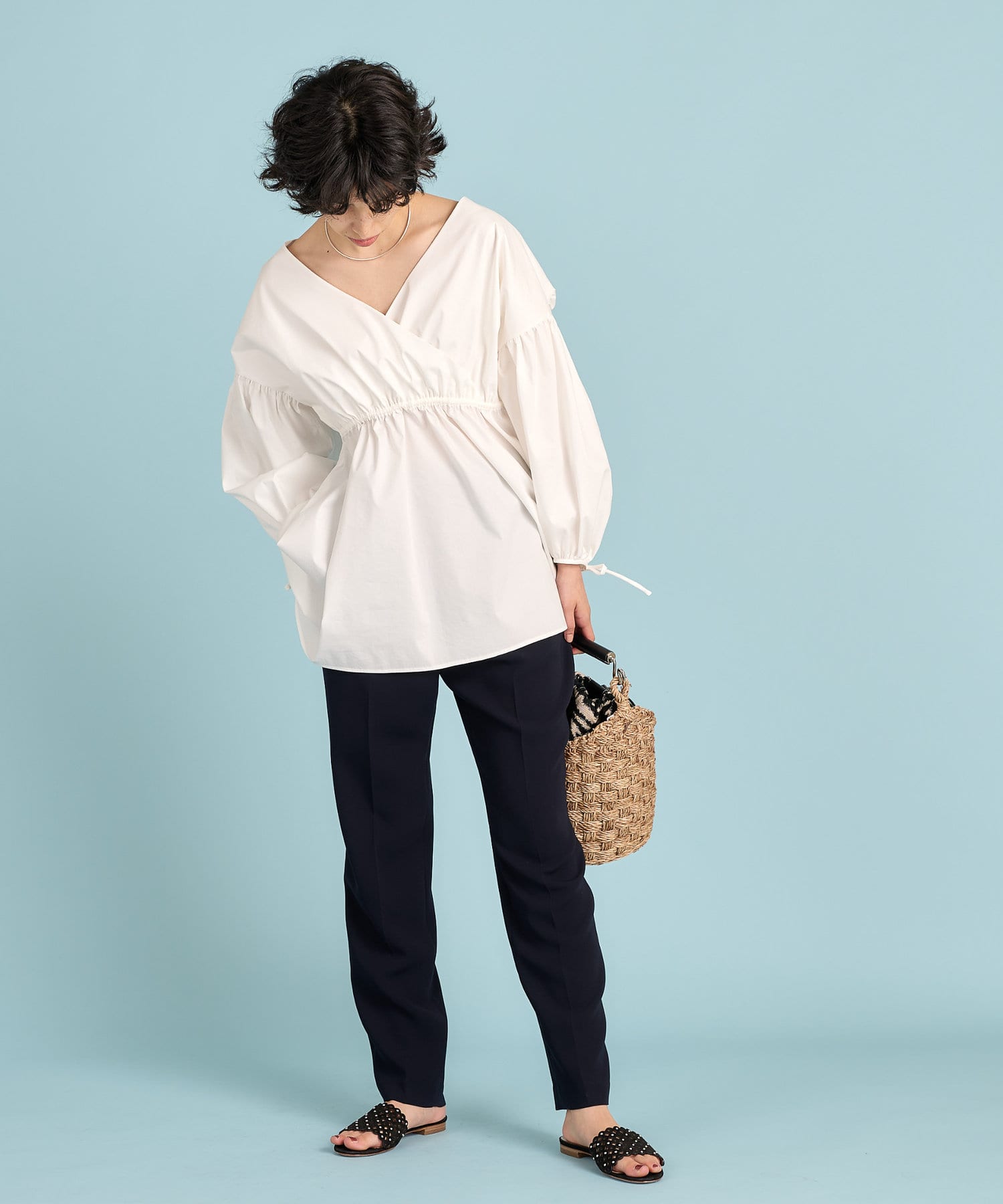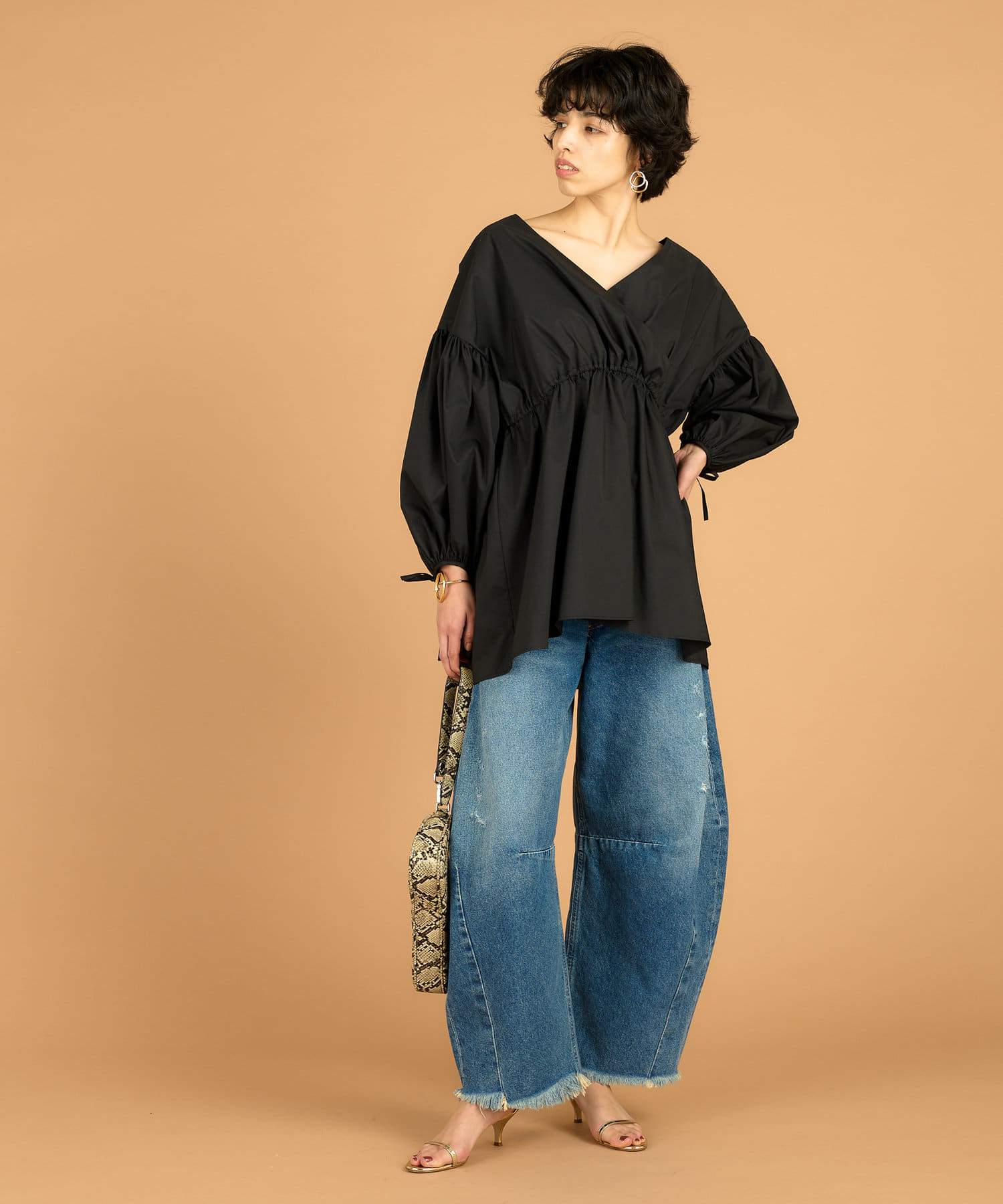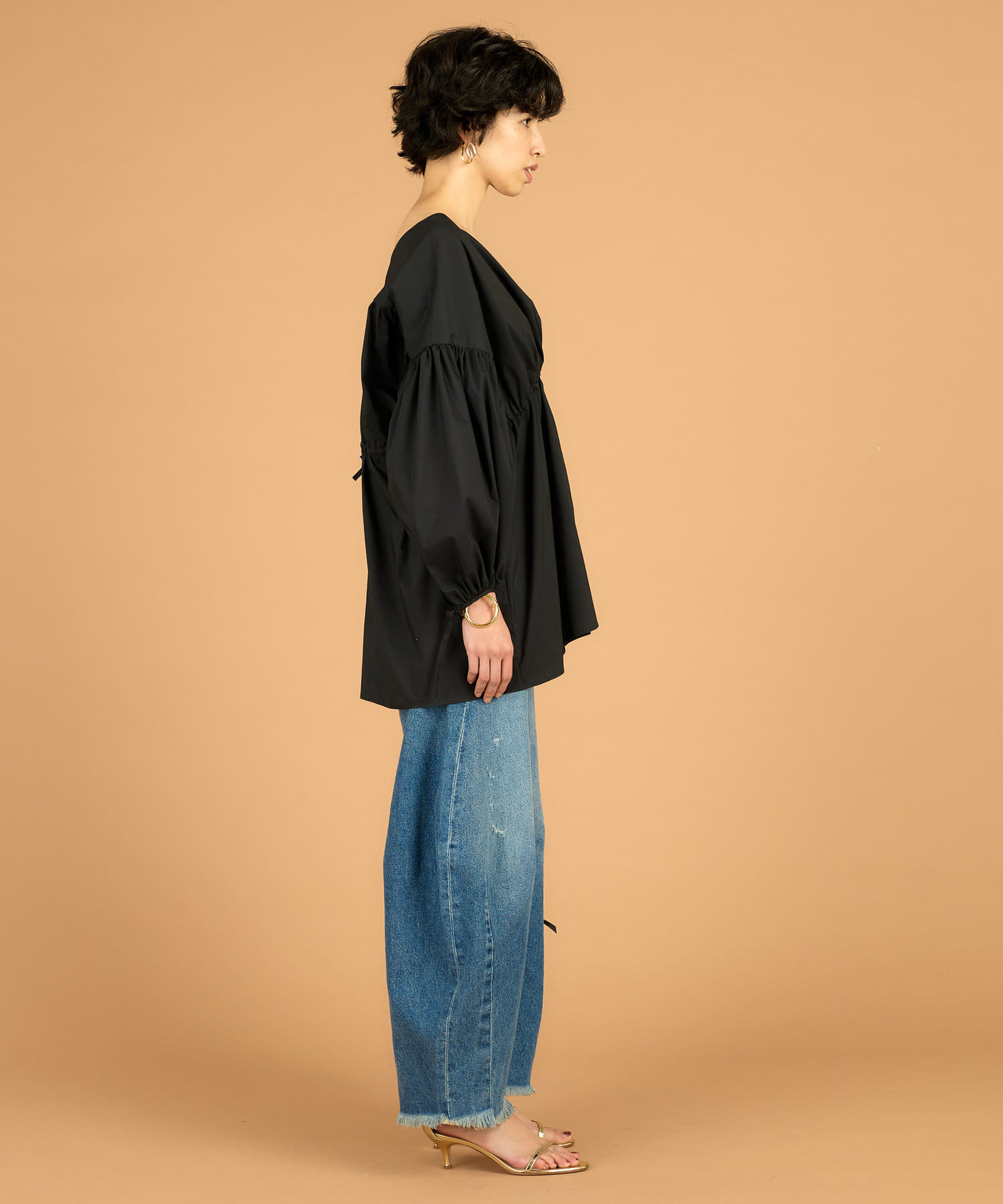 ■カシュクールギャザーシルエットに仕上げたフェミニンなブラウス。